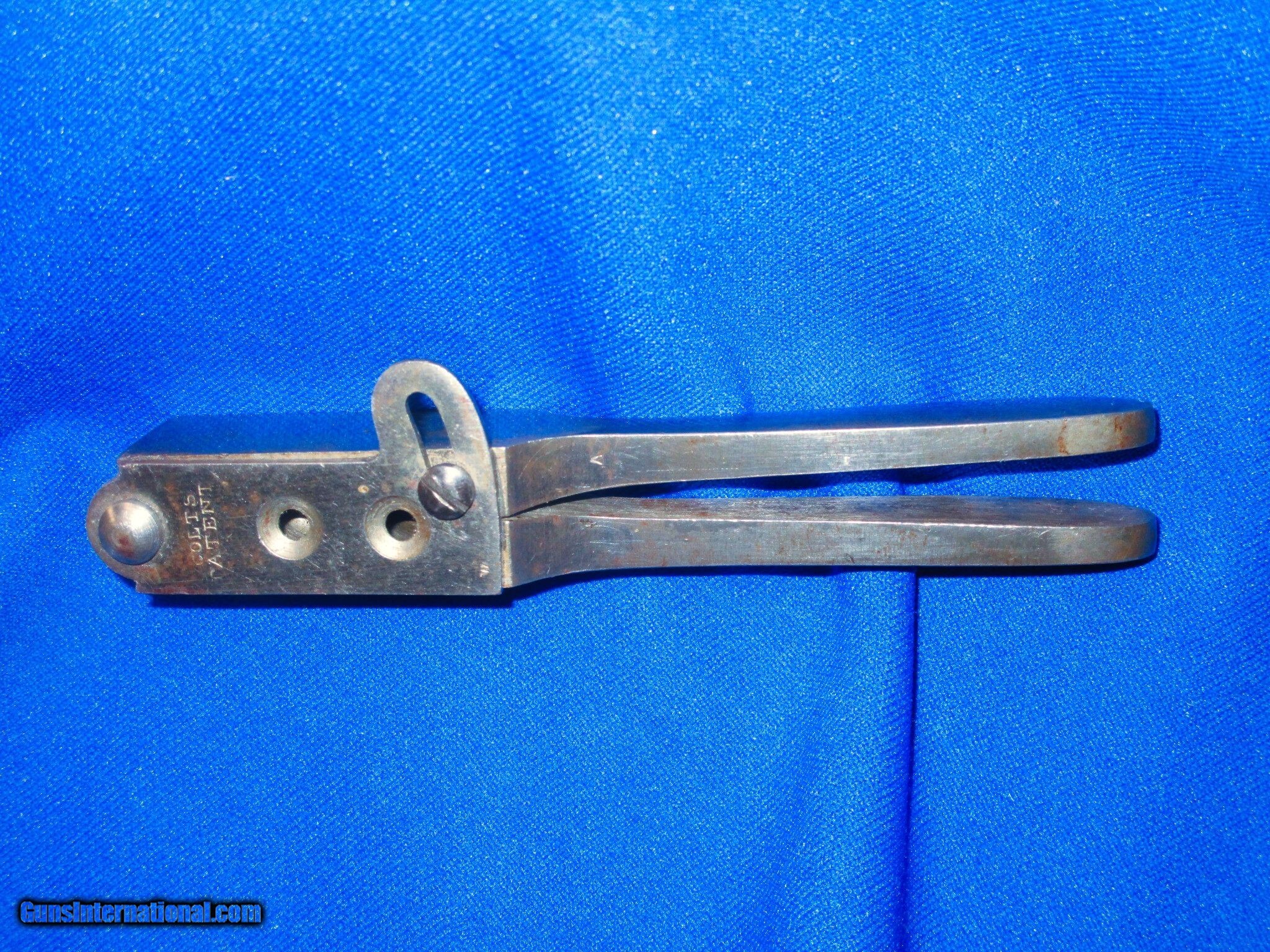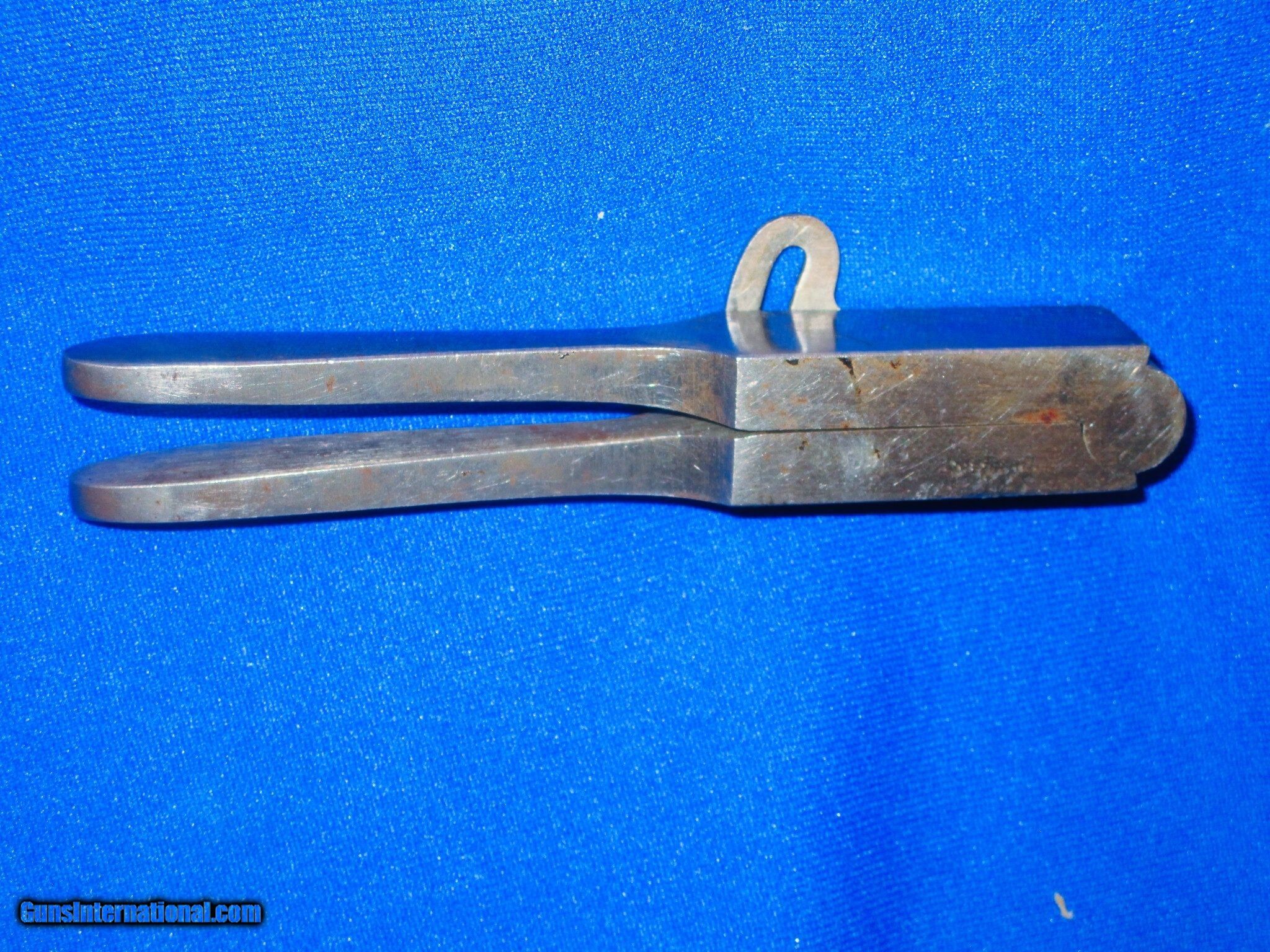Description: An Early Civil War Colt Percussion Model 1851 Navy Revolver .36 Caliber Iron bullet Mold In Excellent Plus Factory In The White Never Blued Condition. The mold has excellent metal, markings, and edges. It has a very clear "COLT'S/PATENT" on the top. The mold was factory finiched in the white and never was blued. The top retains all of its original factory blue on it. The inside cavities are crisp and sharp as new. The mold is very tight to open and close also as new. This Is A Very High Condition Example Of A "Colt's Patent" Model 1851 Navy Revolver .36 Caliber Iron Bullet Mold That Deserves To be With A Very High Condition Colt Percussion Navy Revolver. These Factory In The White Unfinished Examples Rarely Show Up And Were Always Special Ordered! SOLD |