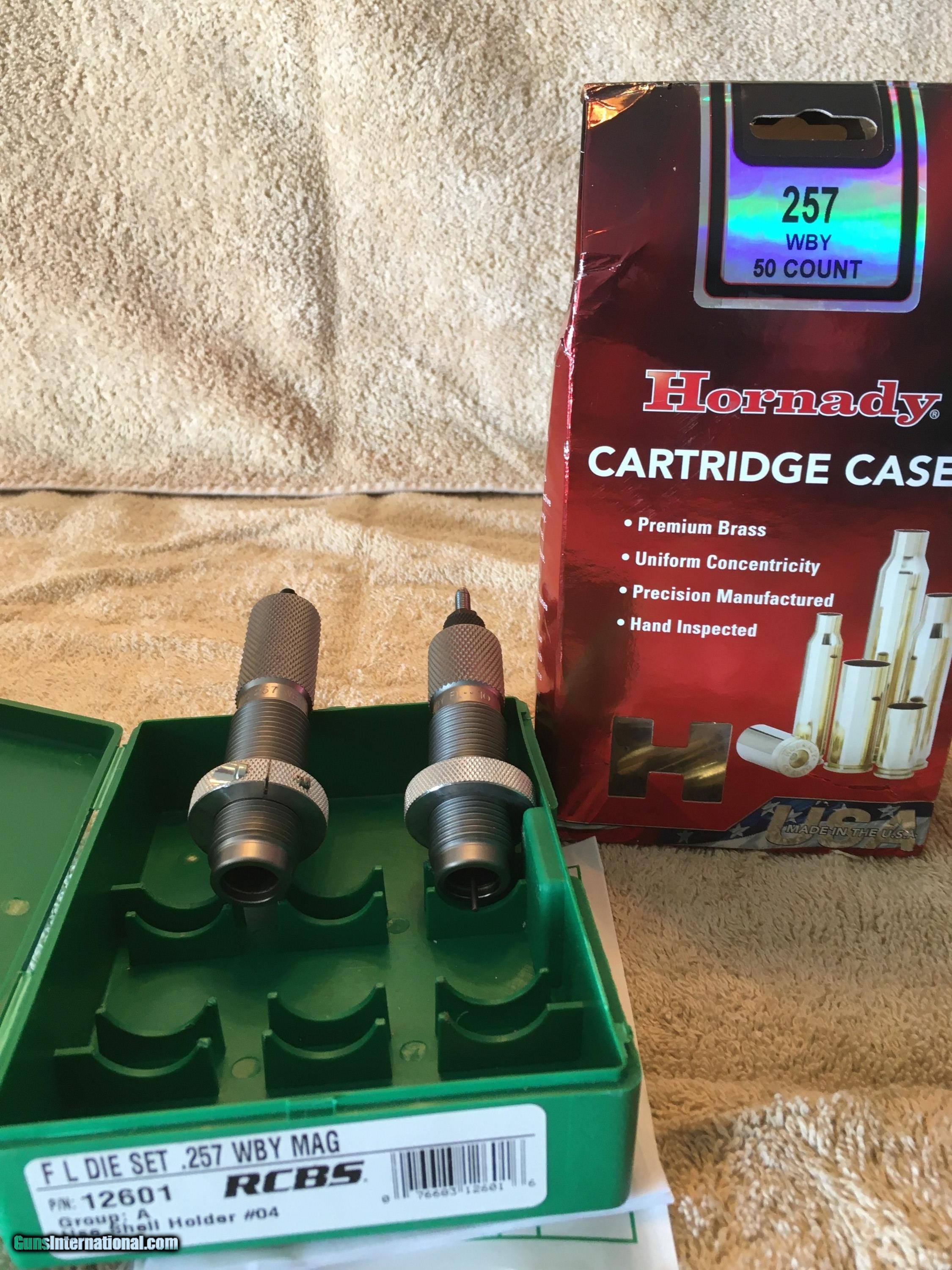 Description: .257 Weatherby brass, 29 pieces Hornady brand, new, unfired, with a pair of RCBS dies SOLD |