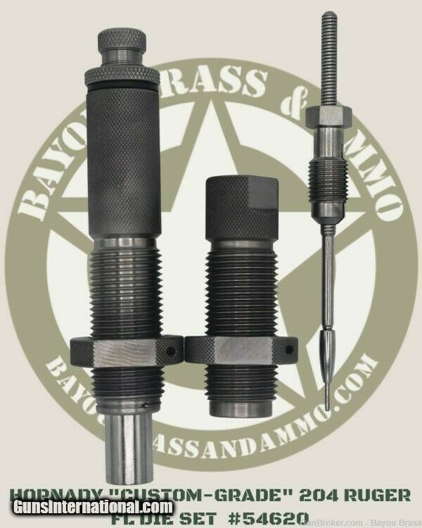 Description: Hornady "Custom-Grade" 204 Ruger FL Die Set #546201 This Hornady "Custom-Grade" 204 Ruger Full Length die set is preowned and in excellent condition. THis die set comes with instructions and a reloading data sheet. These soldiers are ready for duty. MSRP: $46.99
