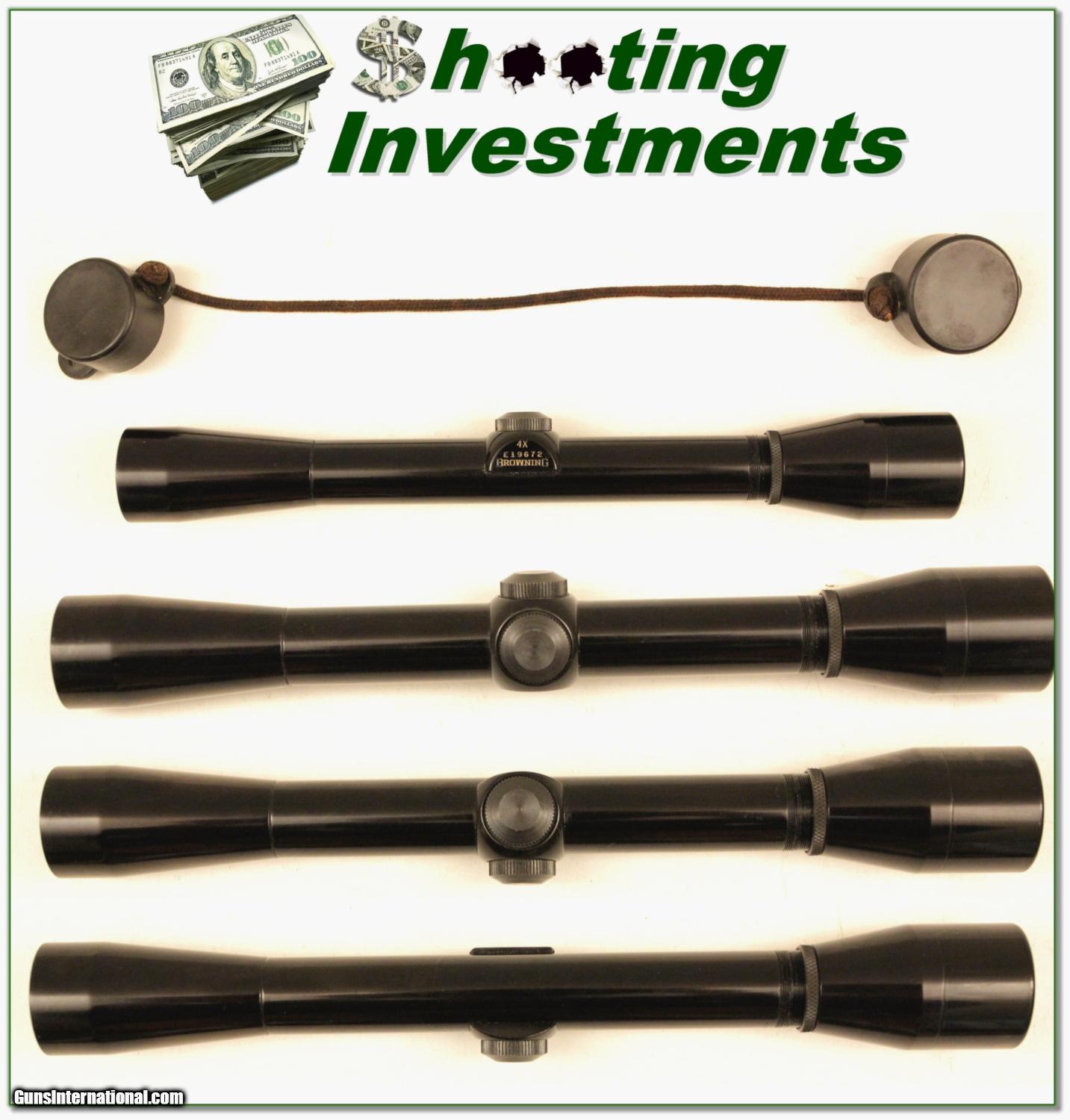 Description: Collectors, this is 4X 3/4” vintage Browning scope. It is in Mint, like new condition with covers as shown. It would be perfect for a collectable Browning 22. Optics are crystal clear. The crosshair is standard as are all of the vintage Browning ¾” scopes. Shipping is $9.95 and please email me with any questions or larger pictures. (I now consign quality firearms only 10%! Let me know if you have any you would like to sell!) [15-1065s] Terms & Conditions Payment: Payment is by Money Order, Cashiers Check or Personal Check. I can now also accept MasterCard and Visa with a 3% convenience fee. PayPal can be used for some items but never firearms. Please let us know if you would like to pay via PayPal. Shipping: The shipping charge will be listed in each description. It is $30 for most guns. Some heavy guns or those insured for over $2000 may be higher. Shipments to Alaska and Hawaii are higher because air shipment is required. Most firearms are shipped within 5 days of receipt of payment. We prefer shipping at the beginning of the week to avoid firearms in transit over weekends. We package all shipments carefully and insure them for the full purchase price, rounded up to the next $100. In the unlikely event that damage occurs, it is important that you save all packaging material for the claims process. Optics are shipped Priority Mail and most other non-firearm shipments are shipped First Class. Returns: Our return policy is simple. If for any reason you are not pleased with your purchase, you may return your item for a refund. The only exception is ammunition, it cannot be returned. It is important to us that you are happy. Guns cannot be fired or dissembled before returning them and must be returned in the same condition as received. Notification of a return must occur with-in 3 days of receipt at your dealer. Shipping, convenience and dealer fees are not refundable and are the responsibility of the buyer. Lay-a-way: If needed, we offer a 60 day lay-a-way option on most firearms. It is 1/3 now, 1/3 in 30 days and 1/3 in 60 days. Lay-a-way firearm sales are final. Consigning your firearms with Shooting Investments: We will help you get top dollar for your firearms. While most local guns shops charge 20% or more, our fee is only 10% with a minimum of $50. At your local gun shop it might take months to sell. Selling on-line provides instant access to thousands of interested buyers. You won’t find any other on-line dealer willing to sell your firearms for only 10% or listing every gun on 4 separate s. Selling through an House typically costs 15% and you have to wait several months to sell and longer to receive funds. If properly priced, we will sell your firearms in a week or two. Send us an email or give us a call and we’ll explain how easy it is for you to get top dollar. Trading: We collect guns and usually just trade for guns we want to add to our collections. We often sell guns for others wanting to purchase one of ours. We find this the most fair to both of us. Our Commission is only 10% and we hold the gun you want until yours sells. Please contact us if you want to sell one of yours to buy one of ours. Help for California Buyers: We are happy to ship to California. It is the buyer’s responsibility to make sure any item you buy is legal in your state. We are also happy to help with your purchase of a firearm from someone other than us. If you see a gun you would like to buy but the seller can’t or won’t ship to California we can help. You buy the gun and have it shipped to us. We’ll then ship it to your California dealer. The cost for this service is only $30 + shipping. Let me know if we can help! SOLD |