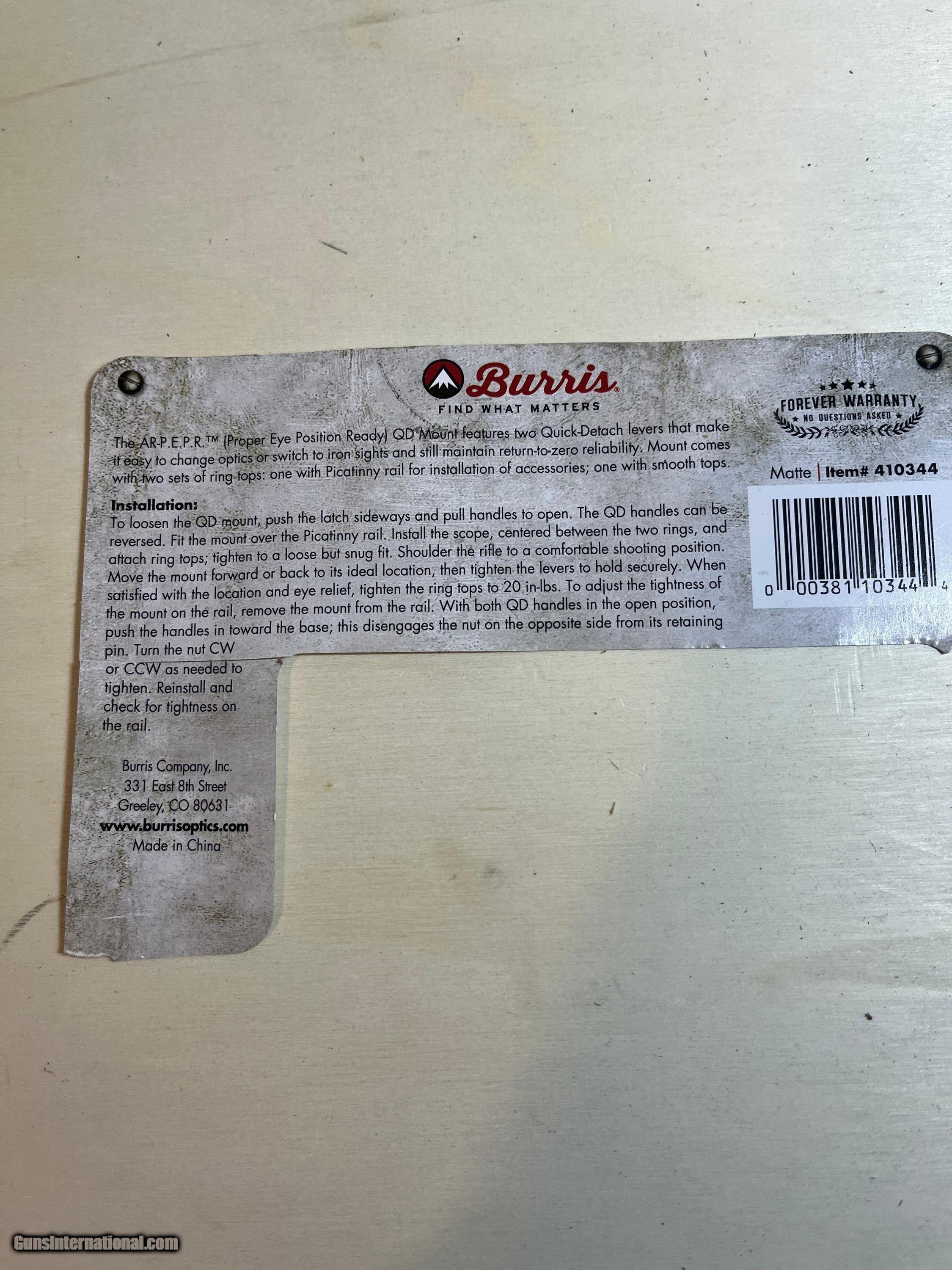 Description: Burris 1inch Quick Detach mount in excellent condition. Comes with one extra entire mount with missing spring. SOLD |