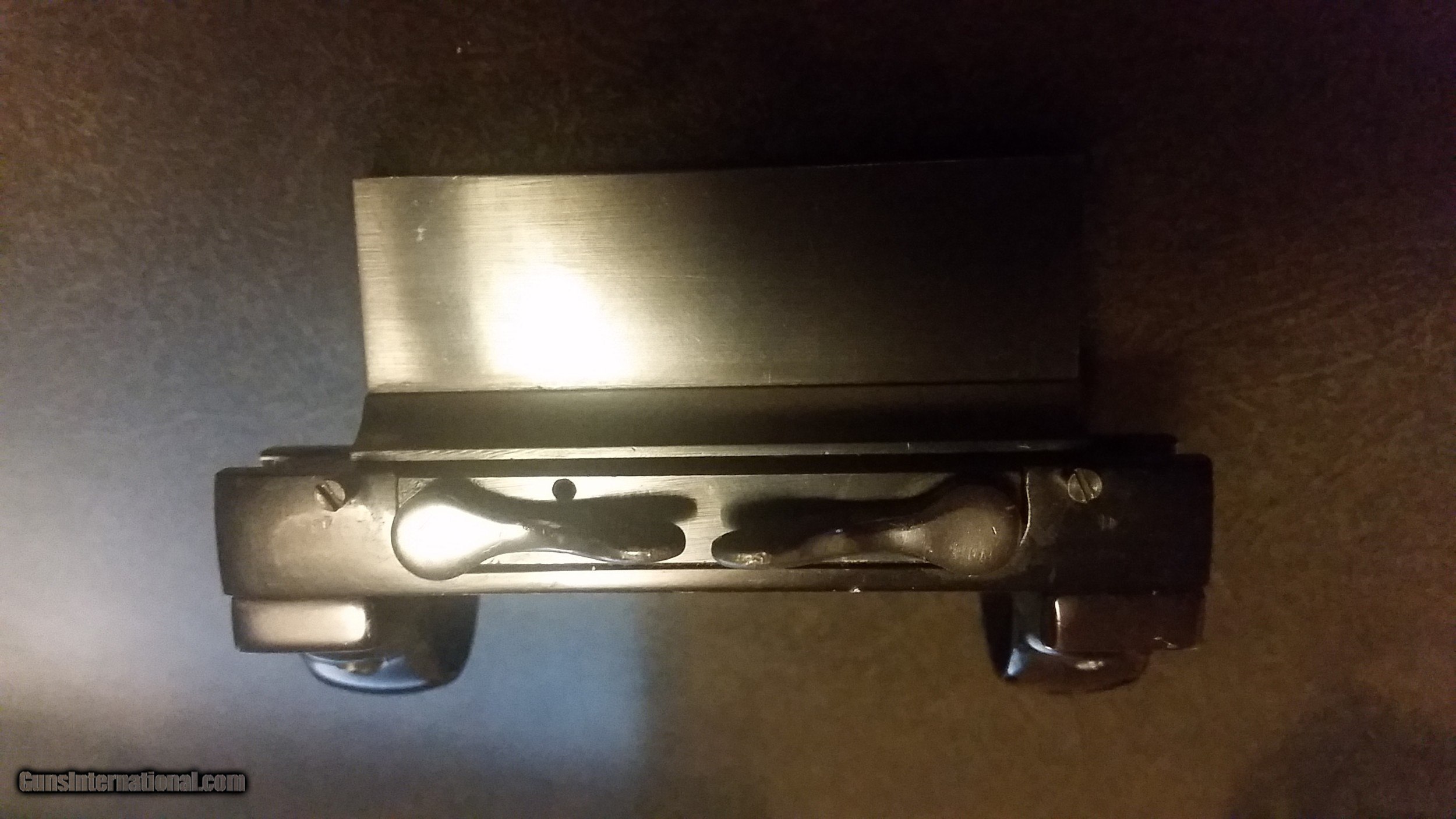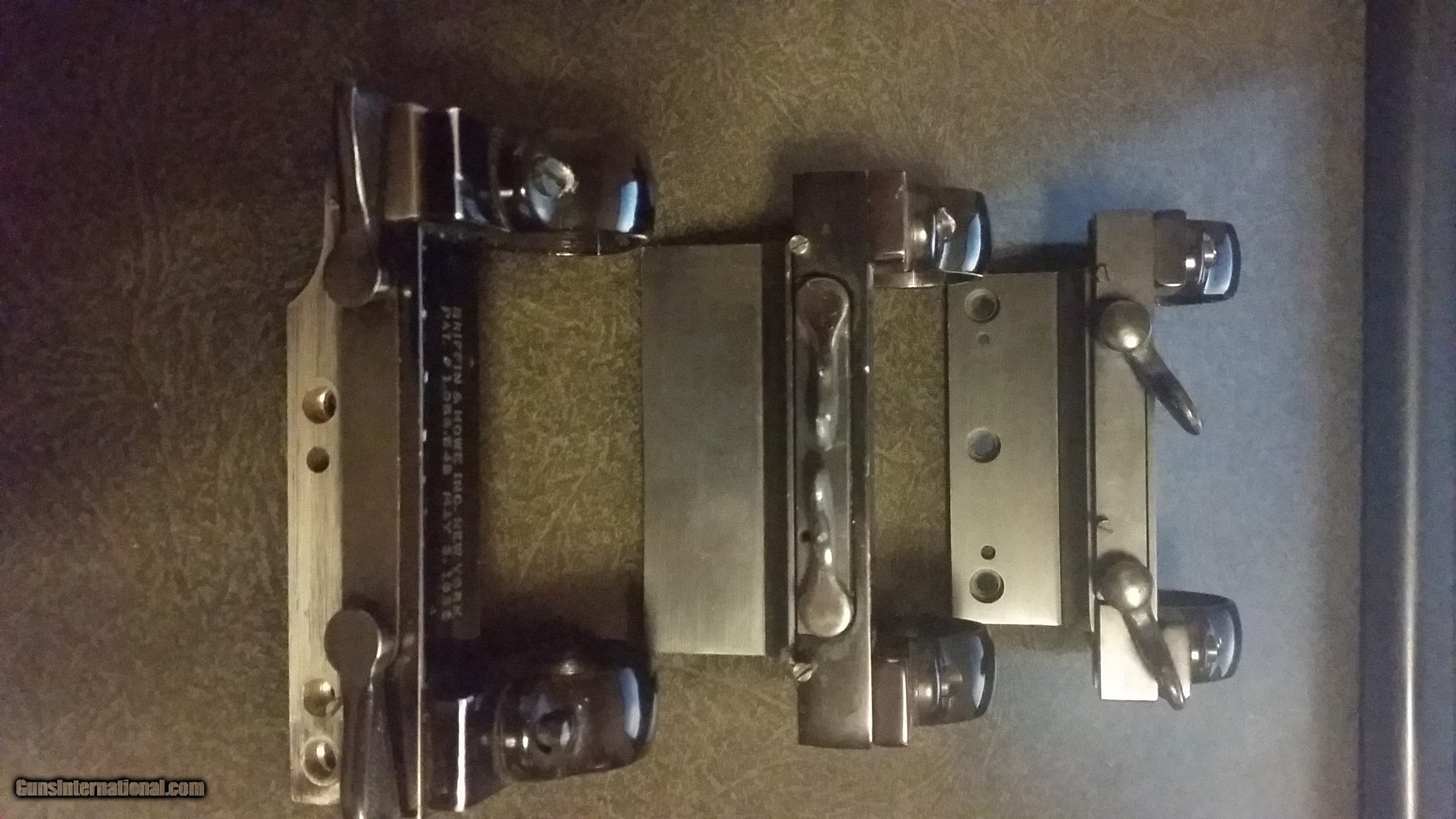 Description: Three Sets of Griffin and Howe Scope Mounts and Rings. Two are unused. Base measurements for the unused sets are 2-7/8 x 1-1/8 and for the used set 3 x 5/8. The used set scope ring mount has been machined on one end for whatever reason and has had a filler piece added to fill the machined end. Have an unused base for a Mannlicher which measures 2-7/8x1-5/8. Have the original invoice and box from G&H for the Mannlicher base. Will take $300 for all plus shipping. SOLD |