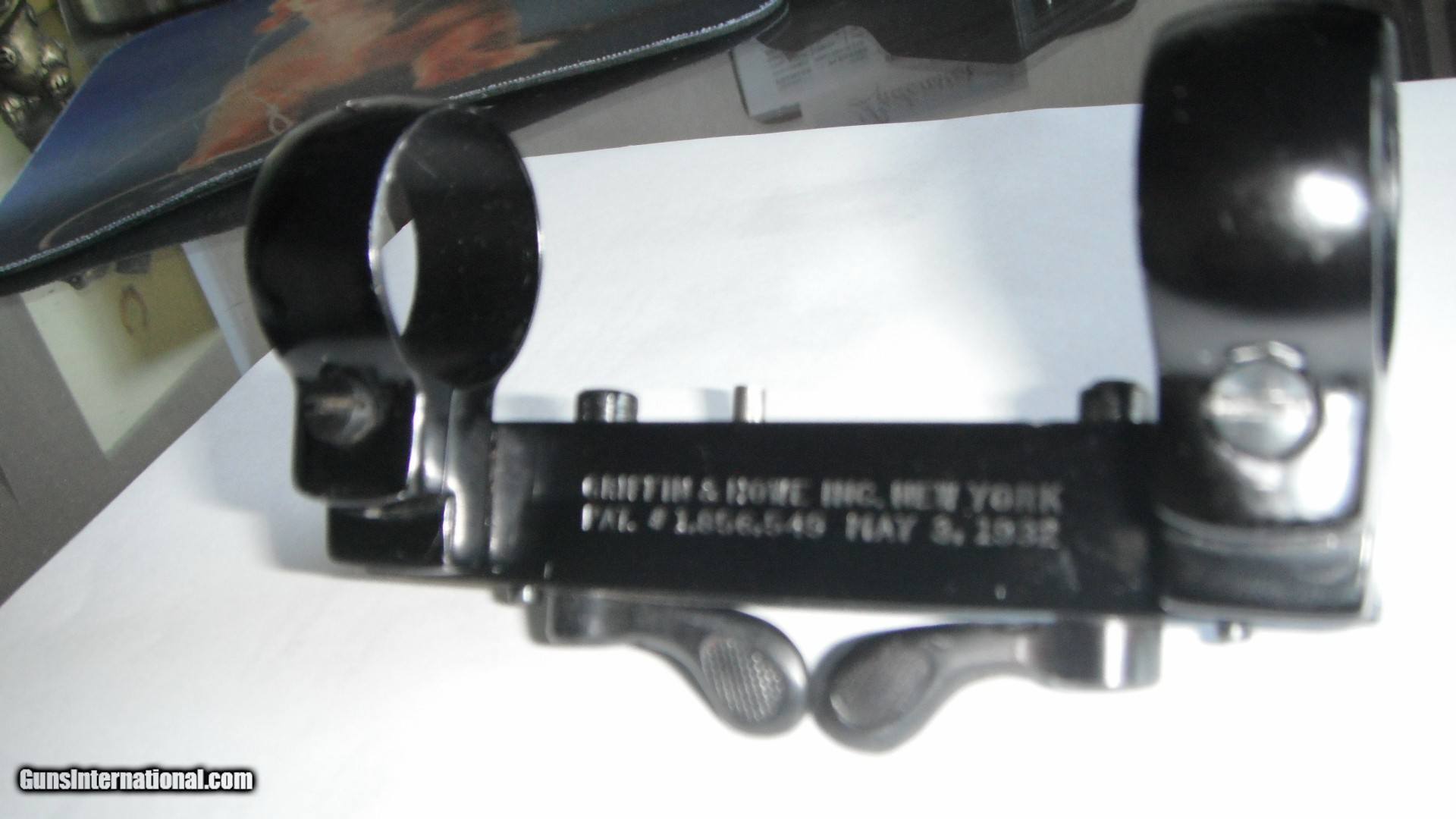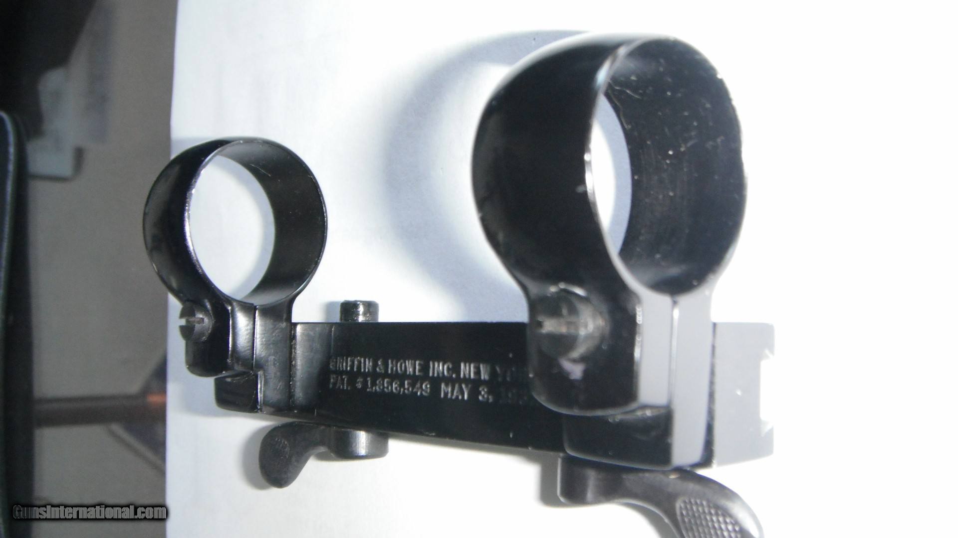 Description: For sale is a complete Griffin & Howe patent # 1,856,549 dated May 5, 1932 scope mounting system with 1" rings. Mounting plate is drilled as shown. Taper pins are in place. The system functions as designed. Piece shows only minoe dings/scratehes as shown. All screw heads are undamaged. Payment by USPS Money Order Only. Shipping will be via USPS Flat Rate Priority Mail, insured for the sale price.SHIPPING AND INSURANCE INCLUDED IN PRICE.. SOLD SOLD |
