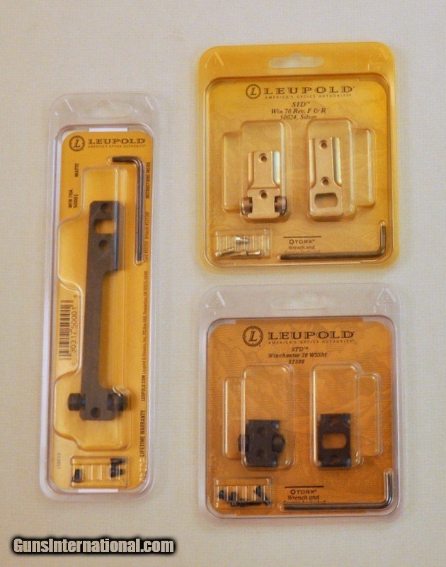 Description: Fits Winchester Model 70 bolt ation rifles. Available in th following styles, please specify. 1. MFG. # 50000, 1 peice, standard 70A, gloss finish. 2. # 50001, 1 peice, standard 70A, matte finish. 3. # 57300, 2 peice, WSSM calibers, gloss finish. 4. # 57310, 2 peice, WSSM calibers, matte finish. 5. # 57320, 2 peice, WSSM calibers, silver finish. 6 # 50024, 2 peice, standard reversible front & rear, silver finish. As new in factory packaging with mounting screws & wrench. $15.00 plus $4.50 for continental US postage. 5 or more assorted $12.50 each. SOLD |