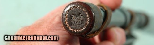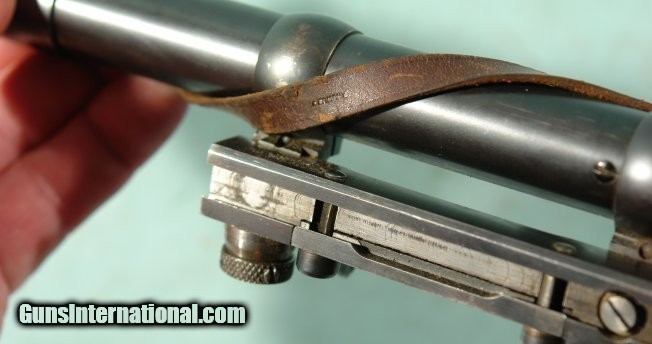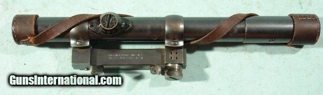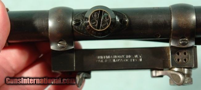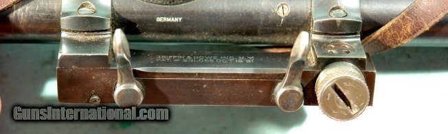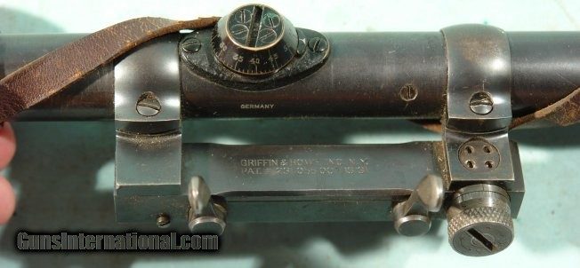 Description: RARE GRIFFIN & HOWE WINDAGE MICROMETER SIDE MOUNT WITH ZIESS ZIELKLEIN 2 ½ POWER SCOPE WITH THE ORIGINAL ZEISS LEATHER SCOPE CAPS CIRCA 1930’S. All original and excellent plus in perfect working order. Has nearly all the original blue and perfect optics. Post and cross hair reticle. Rear scope cap stamped “ZIELKLEIN” on end. SOLD |
