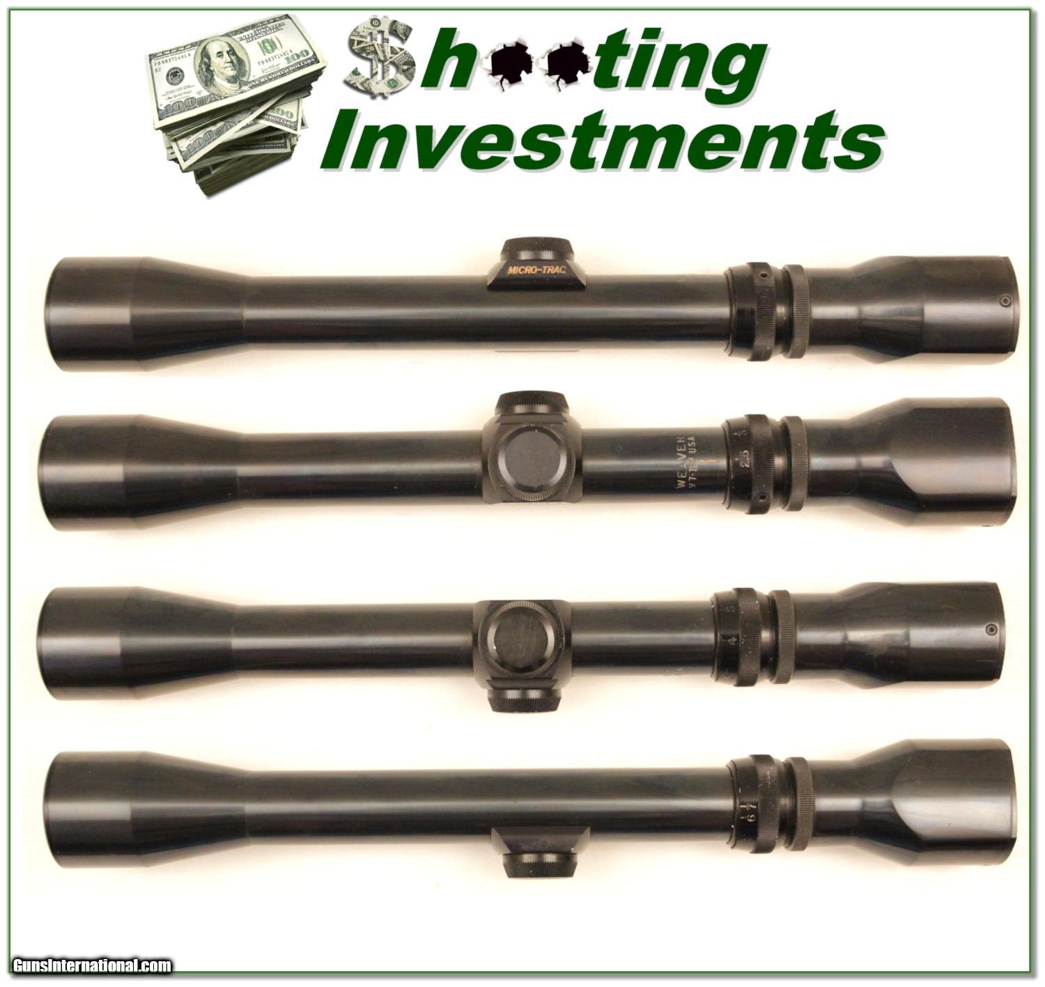 Description: This is a vintage Weaver 2.5-7 Micro-trac rifle scope with widefield view. It is the older steel model and is in excellent collector condition with no marks. The optics are crystal clear with Duplex crosshairs. This will make a very nice scope for any vintage rifle. Please email me with any questions or for larger photos. Shipping with insurance is $9.95. (I now consign quality firearms only 10%! Let me know if you have any you would like to sell!) [15-0748s] Terms & Conditions Payment: Payment is by Money Order, Cashiers Check or Personal Check. I can now also accept MasterCard and Visa with a 3% convenience fee. PayPal can be used for some items but never firearms. Please let us know if you would like to pay via PayPal. Shipping: The shipping charge will be listed in each description. It is $30 for most guns. Some heavy guns or those insured for over $2000 may be higher. Shipments to Alaska and Hawaii are higher because air shipment is required. Most firearms are shipped within 5 days of receipt of payment. We prefer shipping at the beginning of the week to avoid firearms in transit over weekends. We package all shipments carefully and insure them for the full purchase price, rounded up to the next $100. In the unlikely event that damage occurs, it is important that you save all packaging material for the claims process. Optics are shipped Priority Mail and most other non-firearm shipments are shipped First Class. Returns: Our return policy is simple. If for any reason you are not pleased with your purchase, you may return your item for a refund. The only exception is ammunition, it cannot be returned. It is important to us that you are happy. Guns cannot be fired or dissembled before returning them and must be returned in the same condition as received. Notification of a return must occur with-in 3 days of receipt at your dealer. Shipping, convenience and dealer fees are not refundable and are the responsibility of the buyer. Lay-a-way: If needed, we offer a 60 day lay-a-way option on most firearms. It is 1/3 now, 1/3 in 30 days and 1/3 in 60 days. Lay-a-way firearm sales are final. Consigning your firearms with Shooting Investments: We will help you get top dollar for your firearms. While most local guns shops charge 20% or more, our fee is only 10% with a minimum of $50. At your local gun shop it might take months to sell. Selling on-line provides instant access to thousands of interested buyers. You won’t find any other on-line dealer willing to sell your firearms for only 10% or listing every gun on 4 separate s. Selling through an House typically costs 15% and you have to wait several months to sell and longer to receive funds. If properly priced, we will sell your firearms in a week or two. Send us an email or give us a call and we’ll explain how easy it is for you to get top dollar. Trading: We collect guns and usually just trade for guns we want to add to our collections. We often sell guns for others wanting to purchase one of ours. We find this the most fair to both of us. Our Commission is only 10% and we hold the gun you want until yours sells. Please contact us if you want to sell one of yours to buy one of ours. Help for California Buyers: We are happy to ship to California. It is the buyer’s responsibility to make sure any item you buy is legal in your state. We are also happy to help with your purchase of a firearm from someone other than us. If you see a gun you would like to buy but the seller can’t or won’t ship to California we can help. You buy the gun and have it shipped to us. We’ll then ship it to your California dealer. The cost for this service is only $30 + shipping. Let me know if we can help! SOLD |