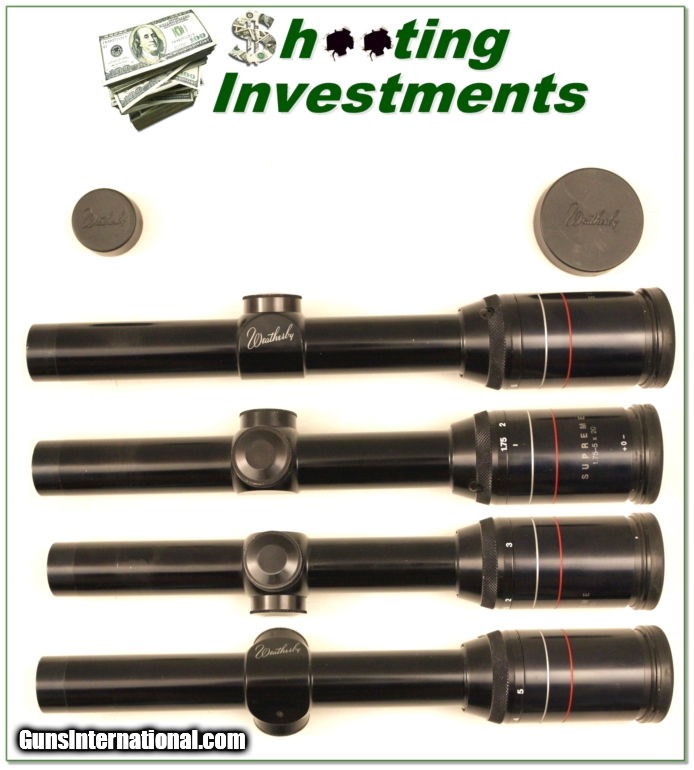 Description: Collectors, this a VERY HARD TO FIND Weatherby Supreme in 1.75 to 5 power with factory covers! It is in excellent collector condition with just the lightest signs of having been mounted. These are very high quality scopes. This one has crystal clear optics with duplex crosshairs. It will make a very nice scope on any Weatherby (or other rifle) and is perfect for the Big Bore Magnums. I took it off a 378. Shipping $9.95 and please email me with any questions or larger pictures. (I now consign quality firearms only 10%! Let me know if you have any you would like to sell!) [15-S007] Terms & Conditions Payment: Payment is by Money Order, Cashiers Check or Personal Check. I can now also accept MasterCard and Visa with a 3% convenience fee. PayPal can be used for some items but never firearms. Please let us know if you would like to pay via PayPal. Shipping: The shipping charge will be listed in each description. It is $30 for most guns. Some heavy guns or those insured for over $2000 may be higher. Shipments to Alaska and Hawaii are higher because air shipment is required. Most firearms are shipped within 5 days of receipt of payment. We prefer shipping at the beginning of the week to avoid firearms in transit over weekends. We package all shipments carefully and insure them for the full purchase price, rounded up to the next $100. In the unlikely event that damage occurs, it is important that you save all packaging material for the claims process. Optics are shipped Priority Mail and most other non-firearm shipments are shipped First Class. Returns: Our return policy is simple. If for any reason you are not pleased with your purchase, you may return your item for a refund. The only exception is ammunition, it cannot be returned. It is important to us that you are happy. Guns cannot be fired or dissembled before returning them and must be returned in the same condition as received. Notification of a return must occur with-in 3 days of receipt at your dealer. Shipping, convenience and dealer fees are not refundable and are the responsibility of the buyer. Lay-a-way: If needed, we offer a 60 day lay-a-way option on most firearms. It is 1/3 now, 1/3 in 30 days and 1/3 in 60 days. Lay-a-way firearm sales are final. Consigning your firearms with Shooting Investments: We will help you get top dollar for your firearms. While most local guns shops charge 20% or more, our fee is only 10% with a minimum of $50. At your local gun shop it might take months to sell. Selling on-line provides instant access to thousands of interested buyers. You won’t find any other on-line dealer willing to sell your firearms for only 10% or listing every gun on 4 separate s. Selling through an House typically costs 15% and you have to wait several months to sell and longer to receive funds. If properly priced, we will sell your firearms in a week or two. Send us an email or give us a call and we’ll explain how easy it is for you to get top dollar. Trading: We collect guns and usually just trade for guns we want to add to our collections. We often sell guns for others wanting to purchase one of ours. We find this the most fair to both of us. Our Commission is only 10% and we hold the gun you want until yours sells. Please contact us if you want to sell one of yours to buy one of ours. Help for California Buyers: We are happy to ship to California. It is the buyer’s responsibility to make sure any item you buy is legal in your state. We are also happy to help with your purchase of a firearm from someone other than us. If you see a gun you would like to buy but the seller can’t or won’t ship to California we can help. You buy the gun and have it shipped to us. We’ll then ship it to your California dealer. The cost for this service is only $30 + shipping. Let me know if we can help! SOLD |