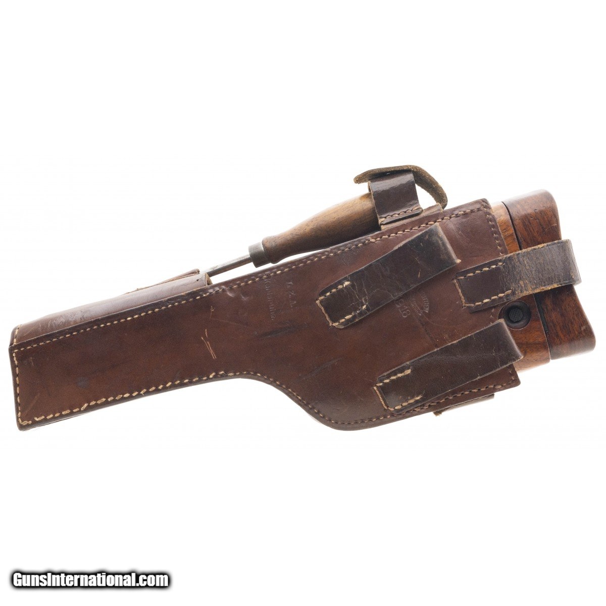 Description: " Broomhandle stock has small crack at button. Leather is intact and dated 1918. Includes cleaning rod. SOLD |
