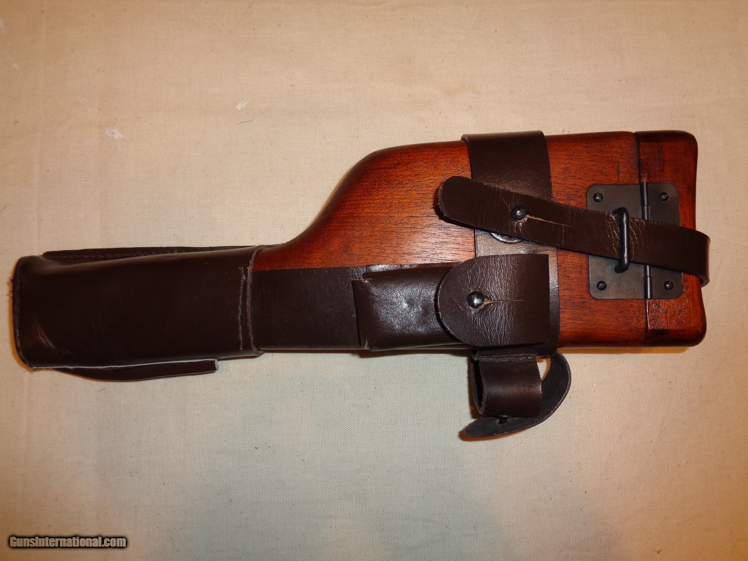 Description: Mauser 1896 (C96) Broomhandle Stock/Holster with leather attachments. Beautiful original condition. Shipping will be a flat 20.00 and cover insurance as well. Credit cards add 5% SOLD |