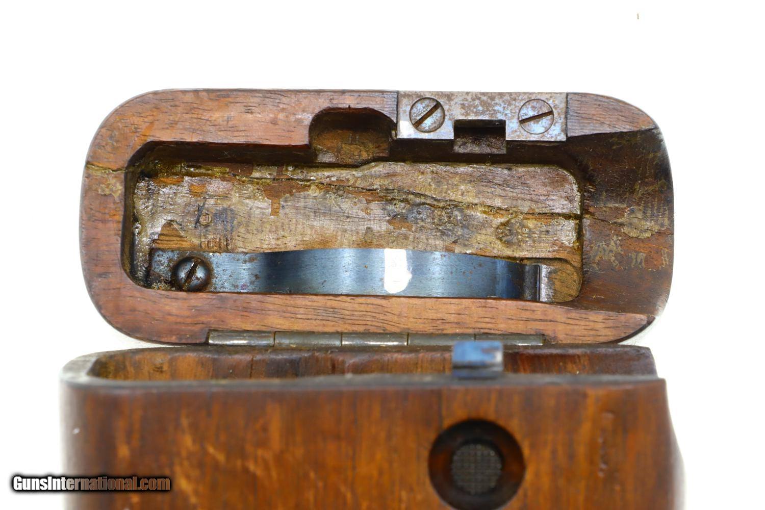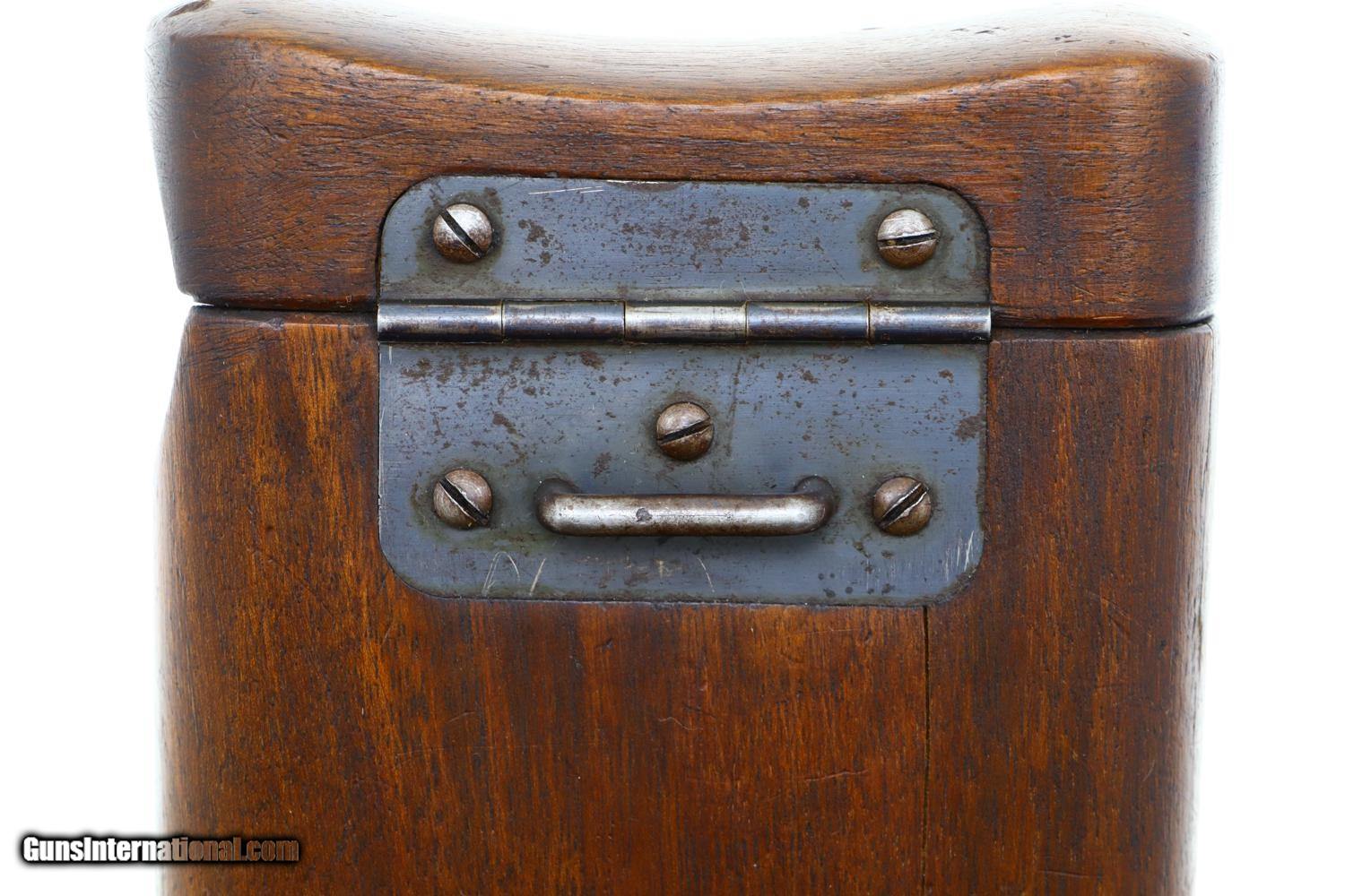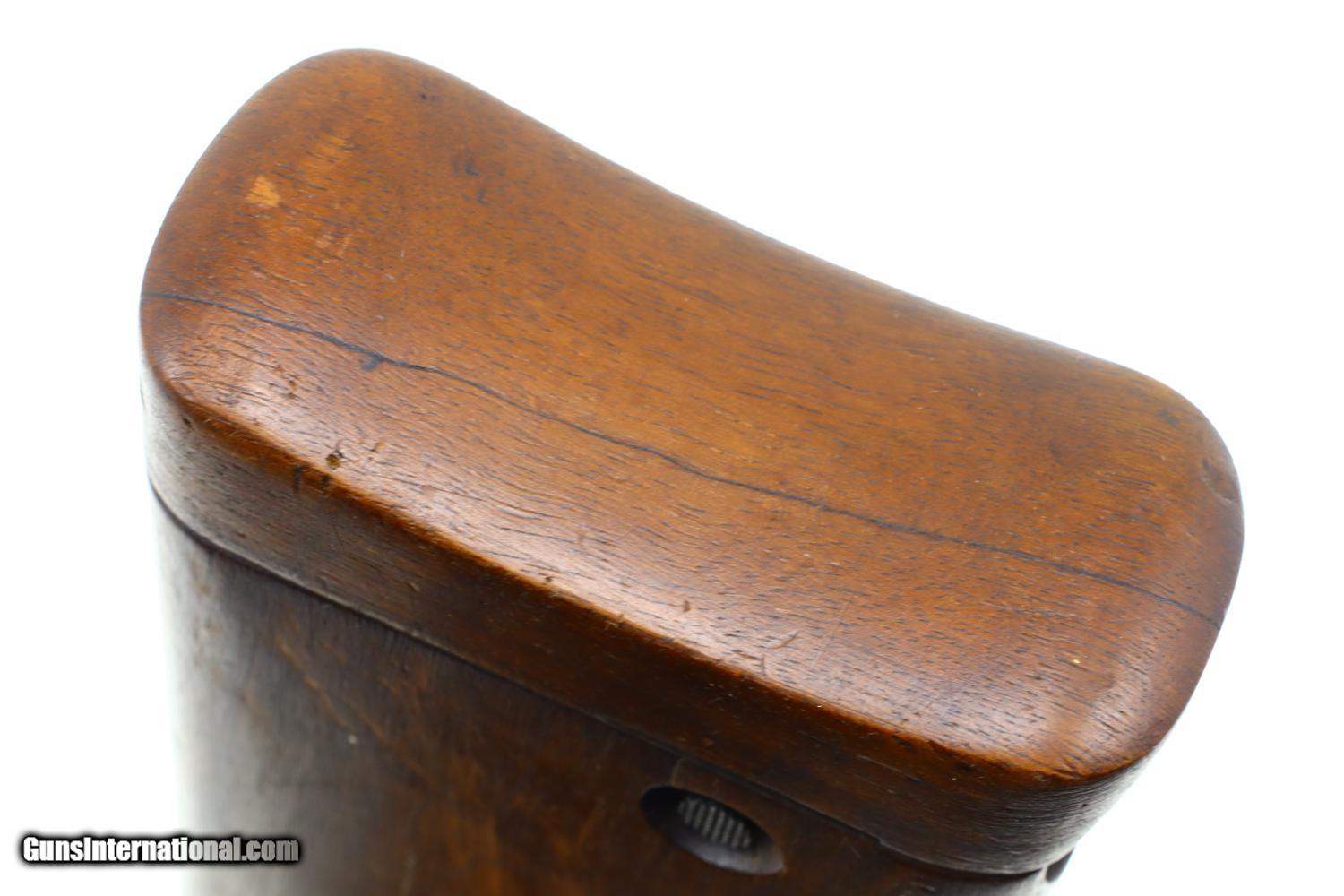 Description: Synopsis: Mauser, Conehammer Broomhandle Stock, 8195, X-258 Description: Standard Conehammer mid-production shoulder stock #8195. Condition: VG shoulder stock with repaired crack in lid and several hairline cracks in body as carefully photographed. Lug with patchy discoloration and fading but no discernable alteration. A very nice accessory for one of the most desirable Mauser C96 pistols. SOLD Manufacturer: Mauser Model: C96 Conehammer Serial Number: 8195 |