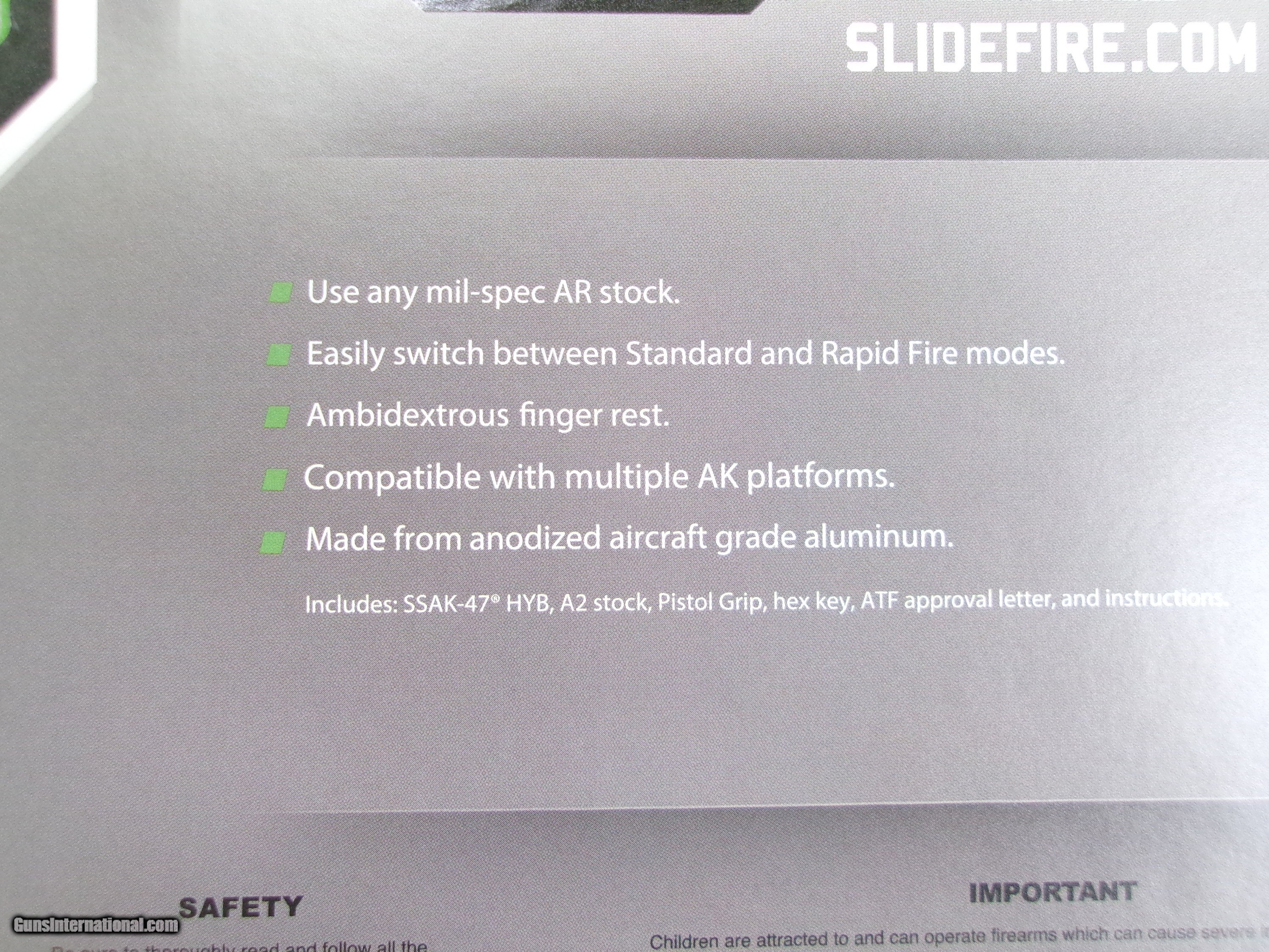 Description: Slide Fire SSAK-47 Bump Stock for many ak47 varriants. NIB. $285 + $15 shipping. Aircraft aluminum construction. Postal MO payment method.New item as is sale No tax or additional fee SOLD |