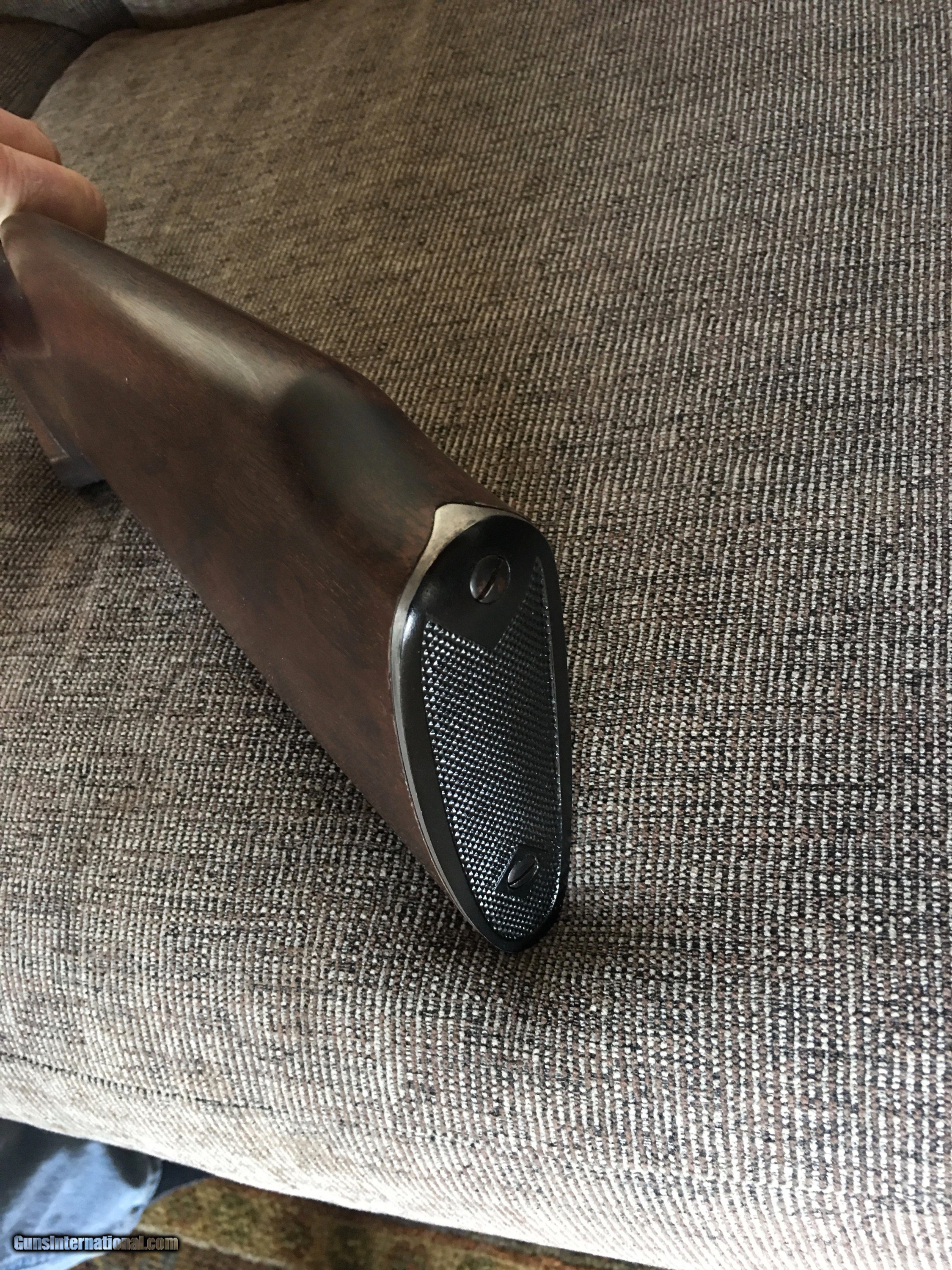 Description: Pre 64 Stock,Professionally built , By the location of the forearm screw and the butt plate it's for a feather weight . Glass bedded, Black Walnut , Deep hand cut checkering, It was mounted with a Winchester Model 70 (1952) 30/30 action on it . This is not a Winchester stock but a pro built in excellent condition with all original detail. Please look at the pictures it is real nice ! The photos depict the actual color of the wood which appears to be darker than Winchester . It will be over packed, fully insured USPS Priority mail to the lower 48 for $20. The last picture is me.I have a couple of other listings on. Thanks , Phil SOLD |