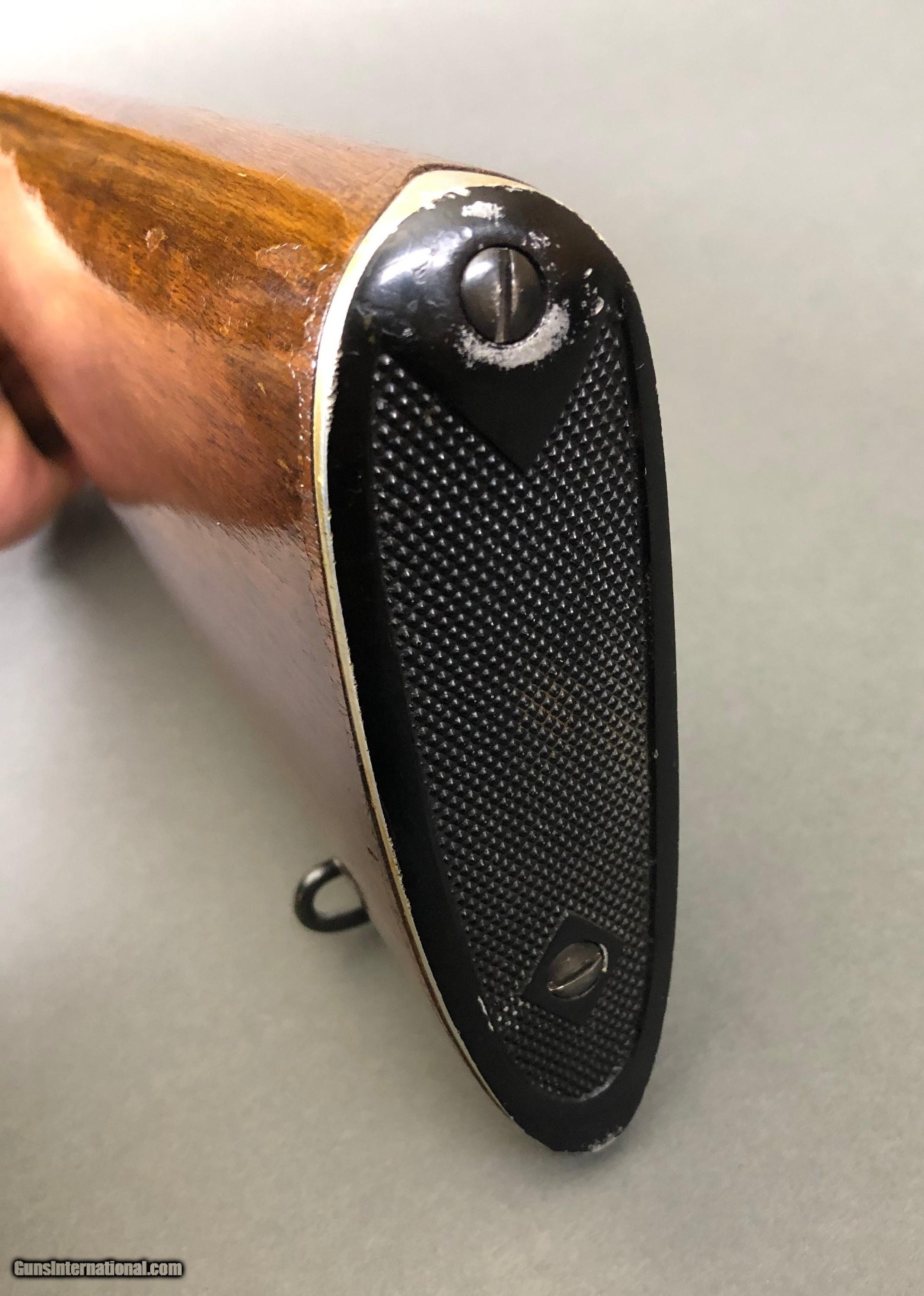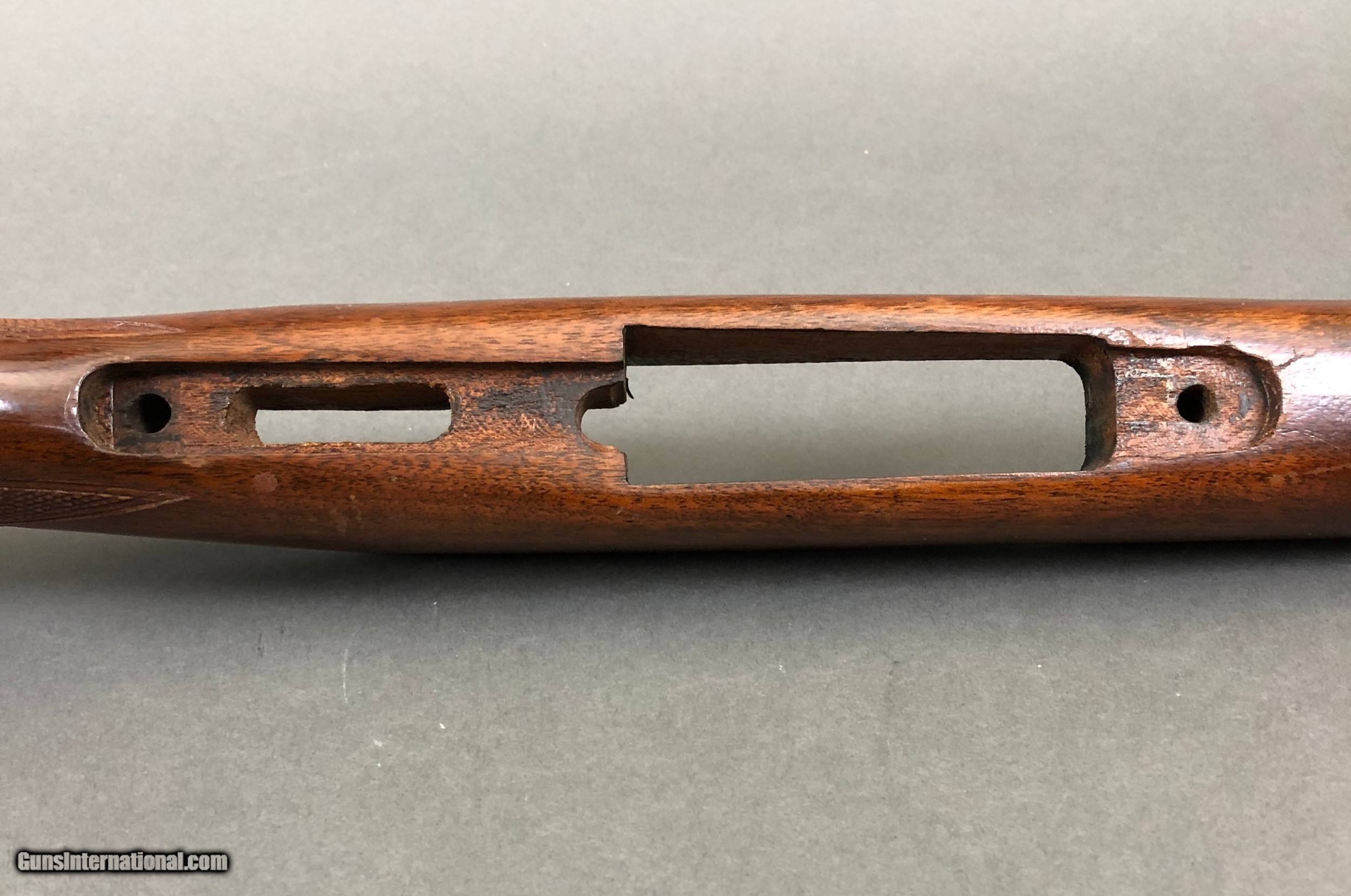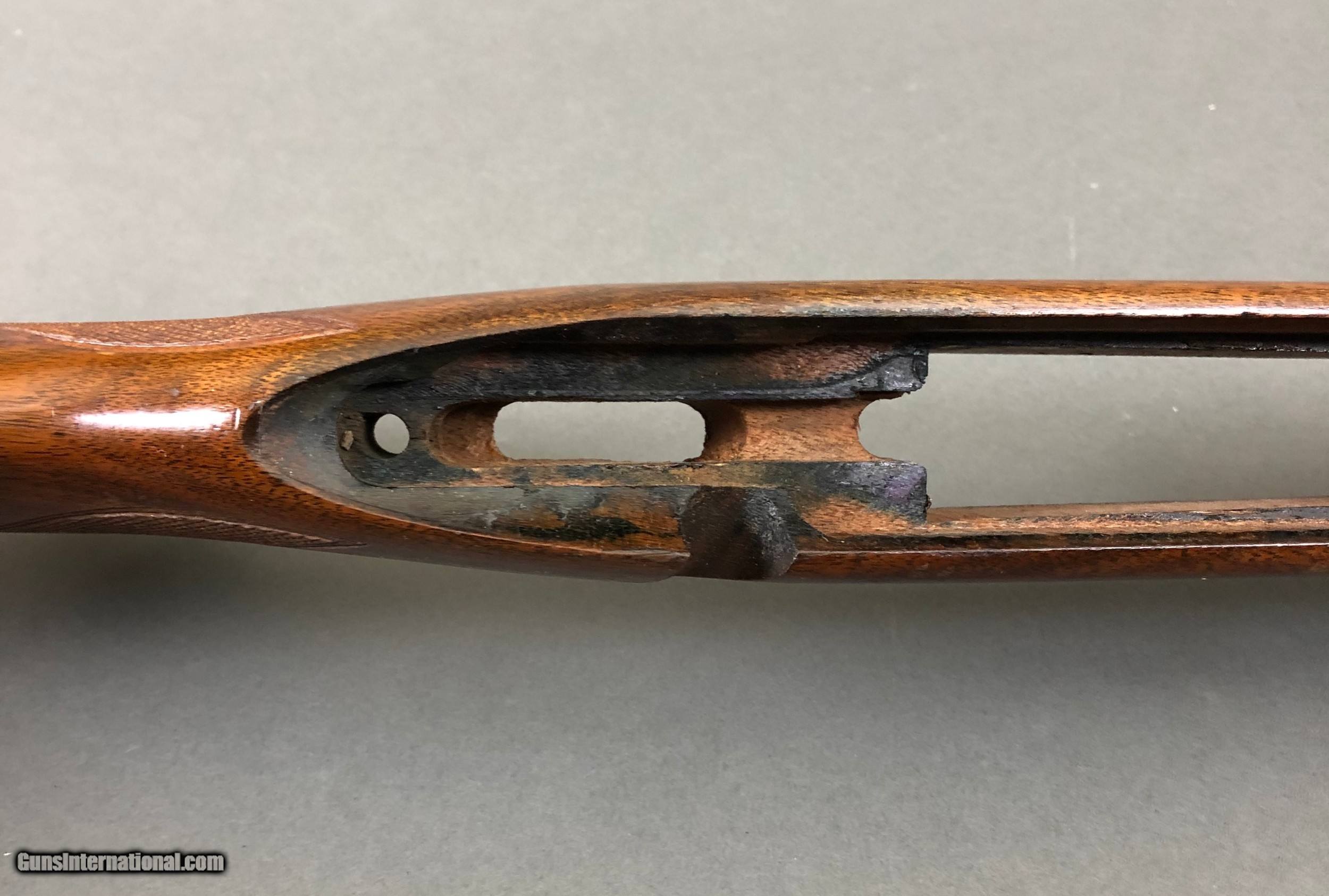 Description: Winchester Pre-64 Featherweight Model 70 low comb stock. I would rate it at 90-92% overall with minor dings and varnish flaking. The finish is original and the wood has no cracks. No alterations to the barrel channel. It was removed from a 30-06. Original alluminum butt plate included. SOLD |