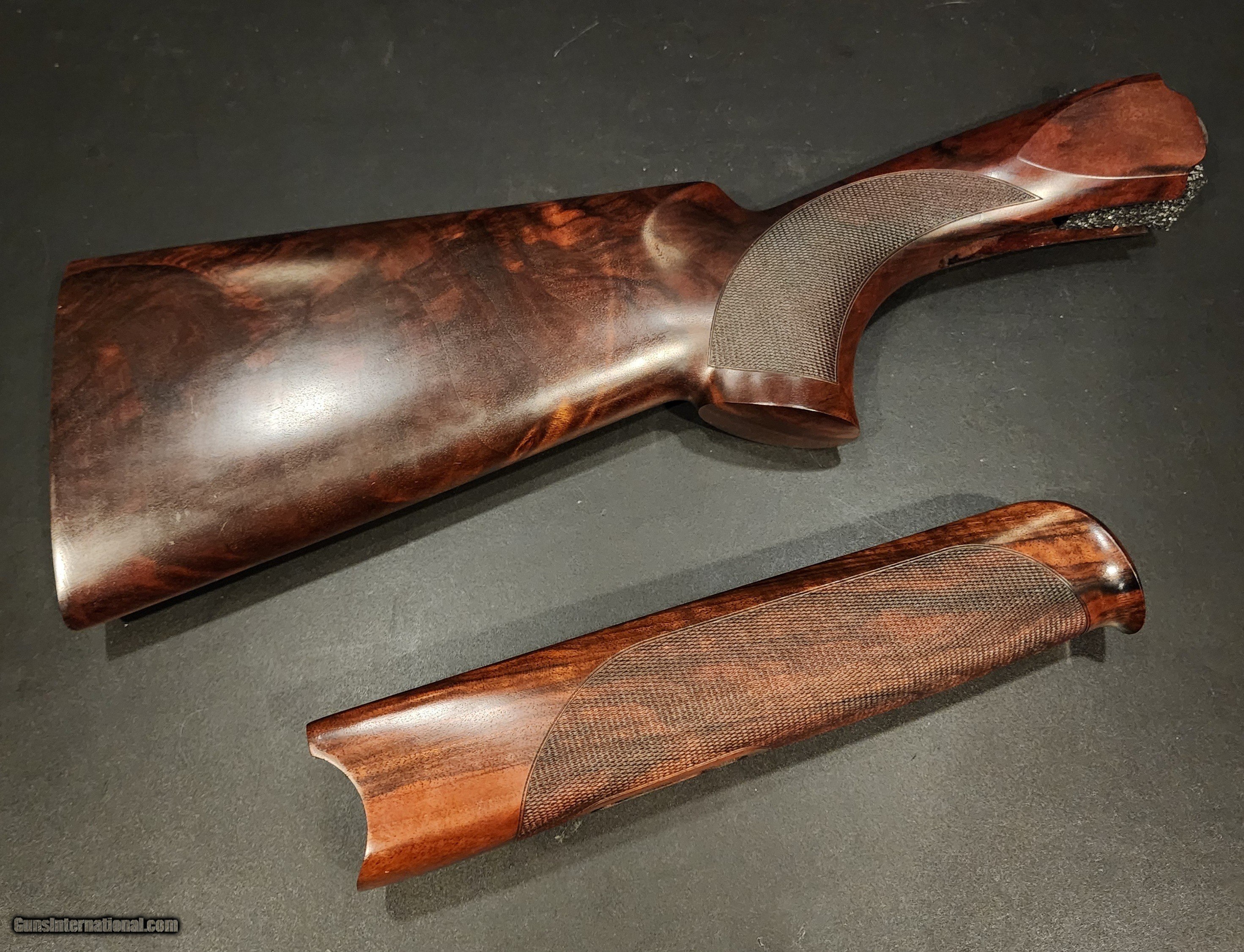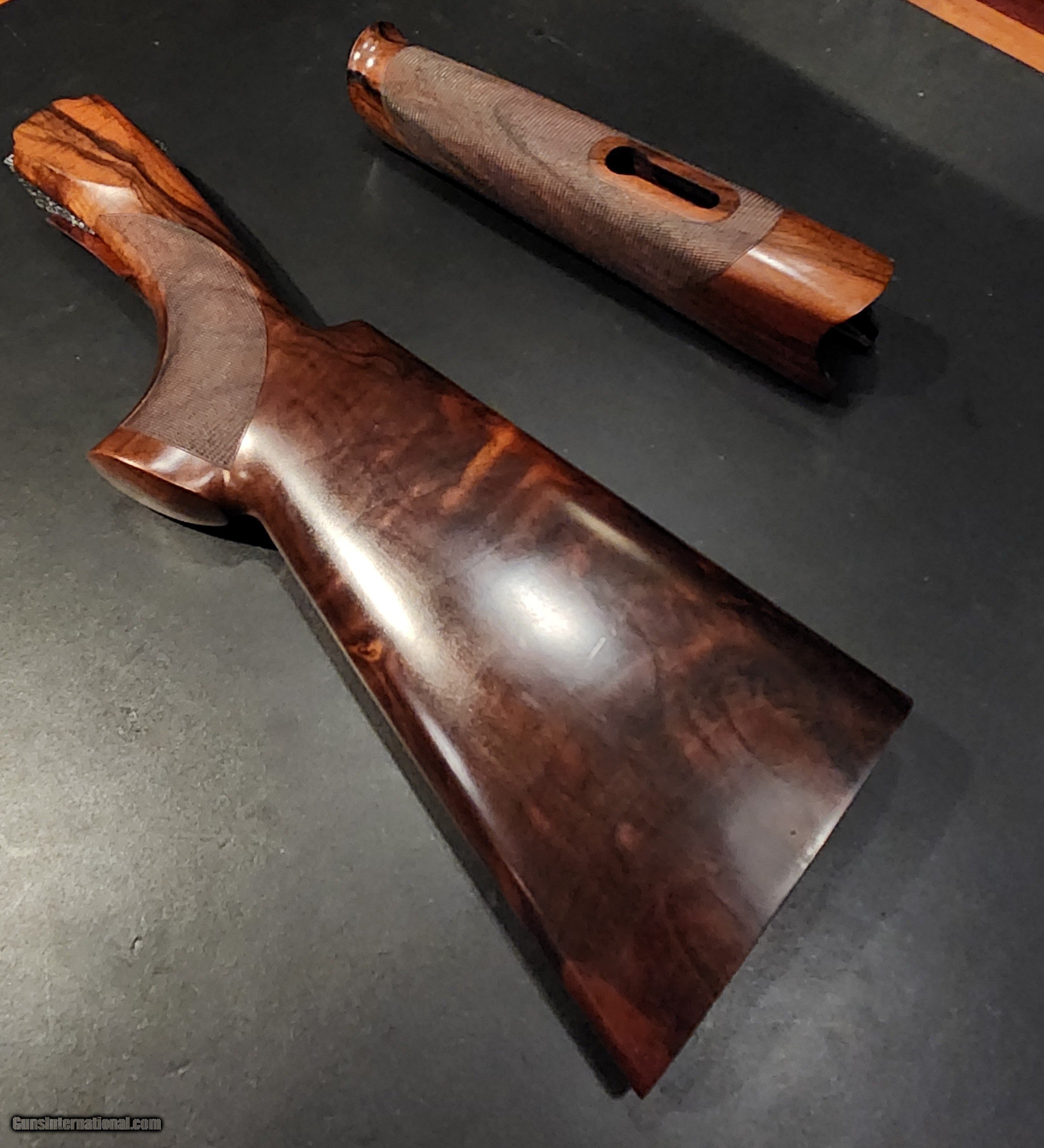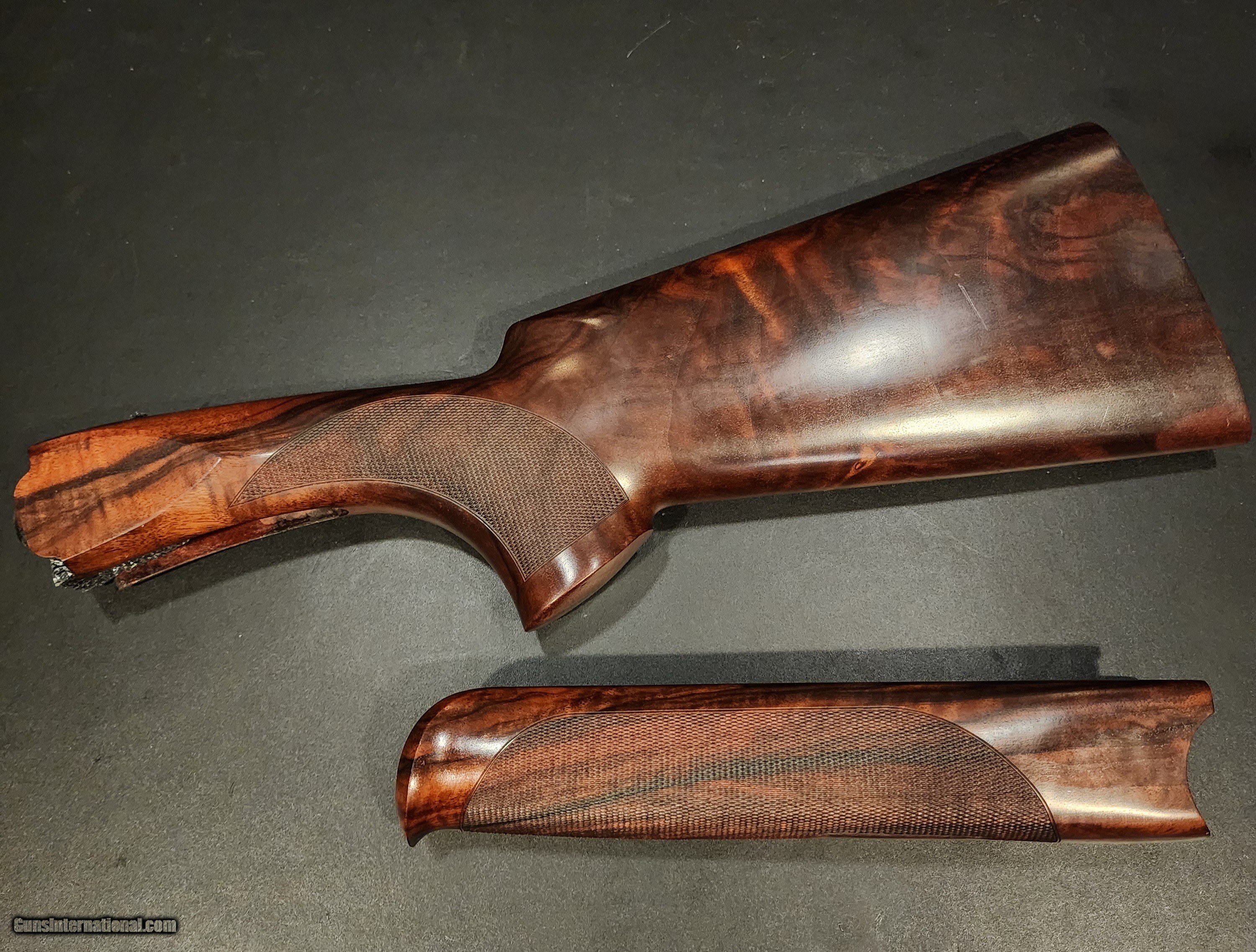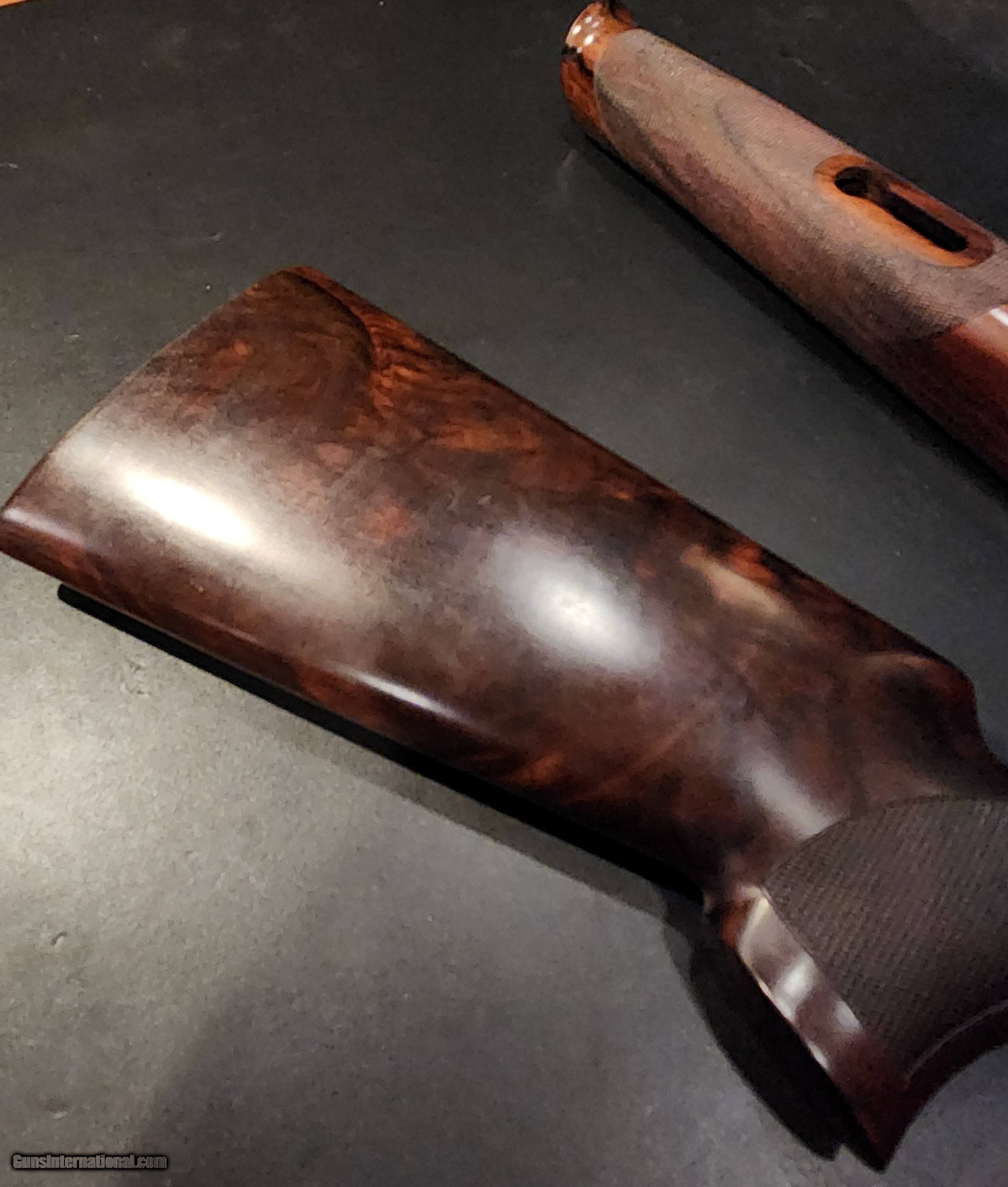 Description: For sale is a genuine Beretta stock and forend set for the DT11. Taken from a premium DT11L this is a higher grade stock than found on standard DT11's. This wood set is in excellent condition and is 100% unaltered, in original spec as shipped from Beretta. Does not include recoil pad. Comb Dimensions: 1 1/2"x 2 3/8" Cast: Right Hand, approx. 1/8"-1/4" w/ Palm swell LOP: 14.125" without a pad Finish: Satin Oil Finish Forend: Schnable This wood set shows only the slightest signs of use, overall excellent condition and checkering is clean and sharp. Has a beautiful medium tone with very attractive figure. SOLD |