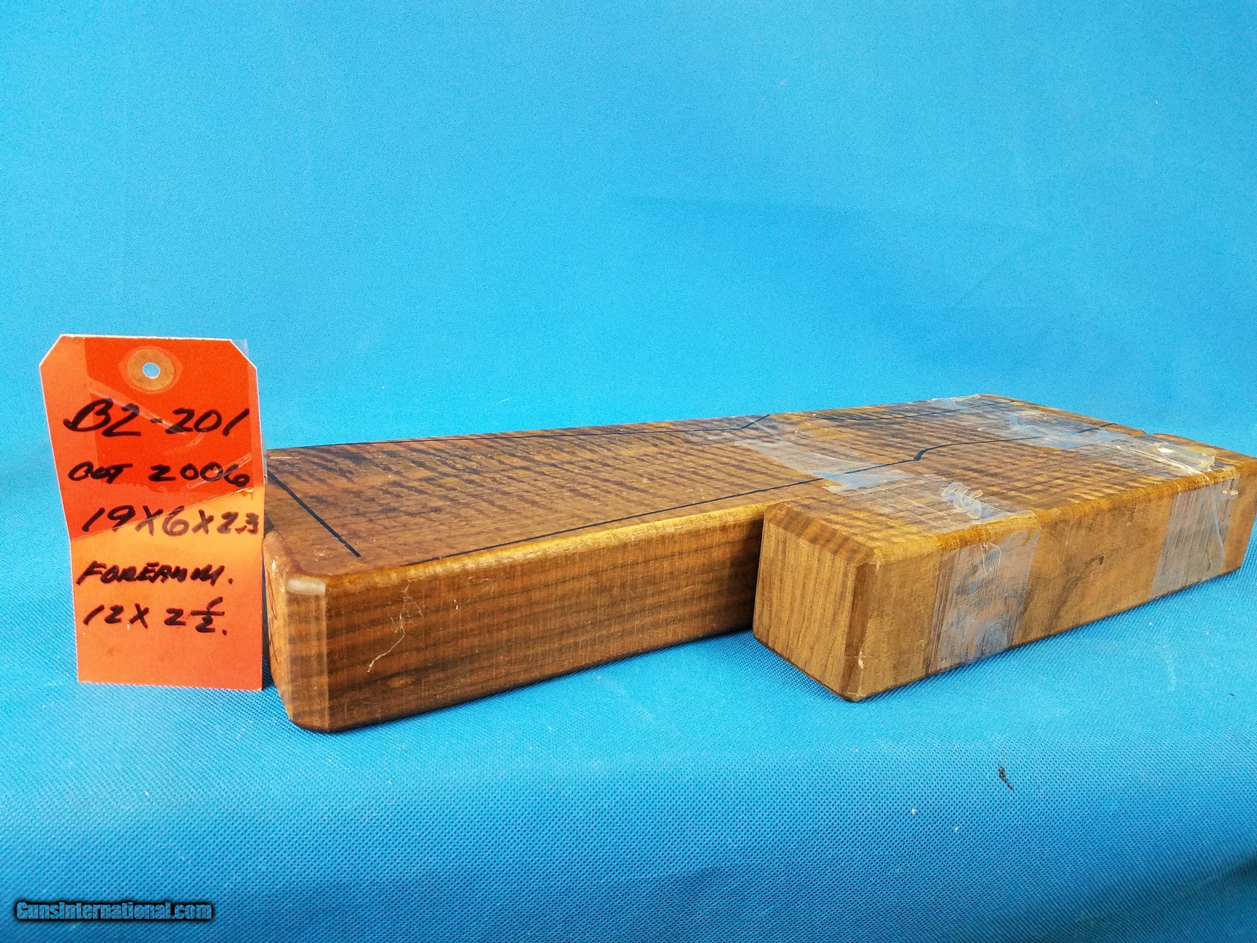 Description: A very nice Bastogne walnut shotgun or 2 piece rifle gunstock blank with matching forearm. Great layout and good color with nice fiddleback. Bastogne trees are fairly rare but usually produce many more gunstock blanks keeping prices down, as opposed to English wanut blanks. The supply won't last forever. Better stock up!. PRICE REDUCED TO $375.00 !! 02/24/2024 Thank you, Steve SOLD |