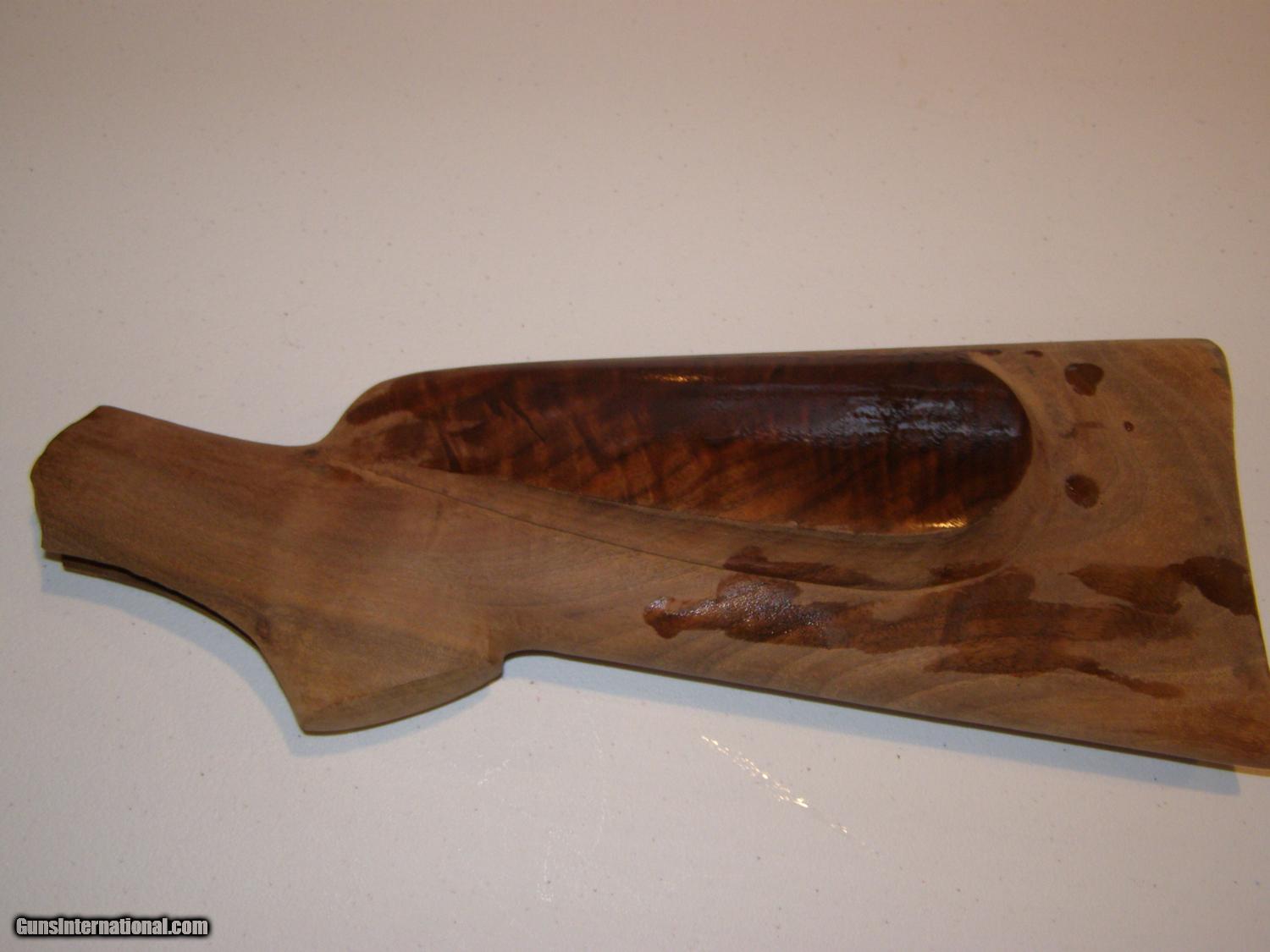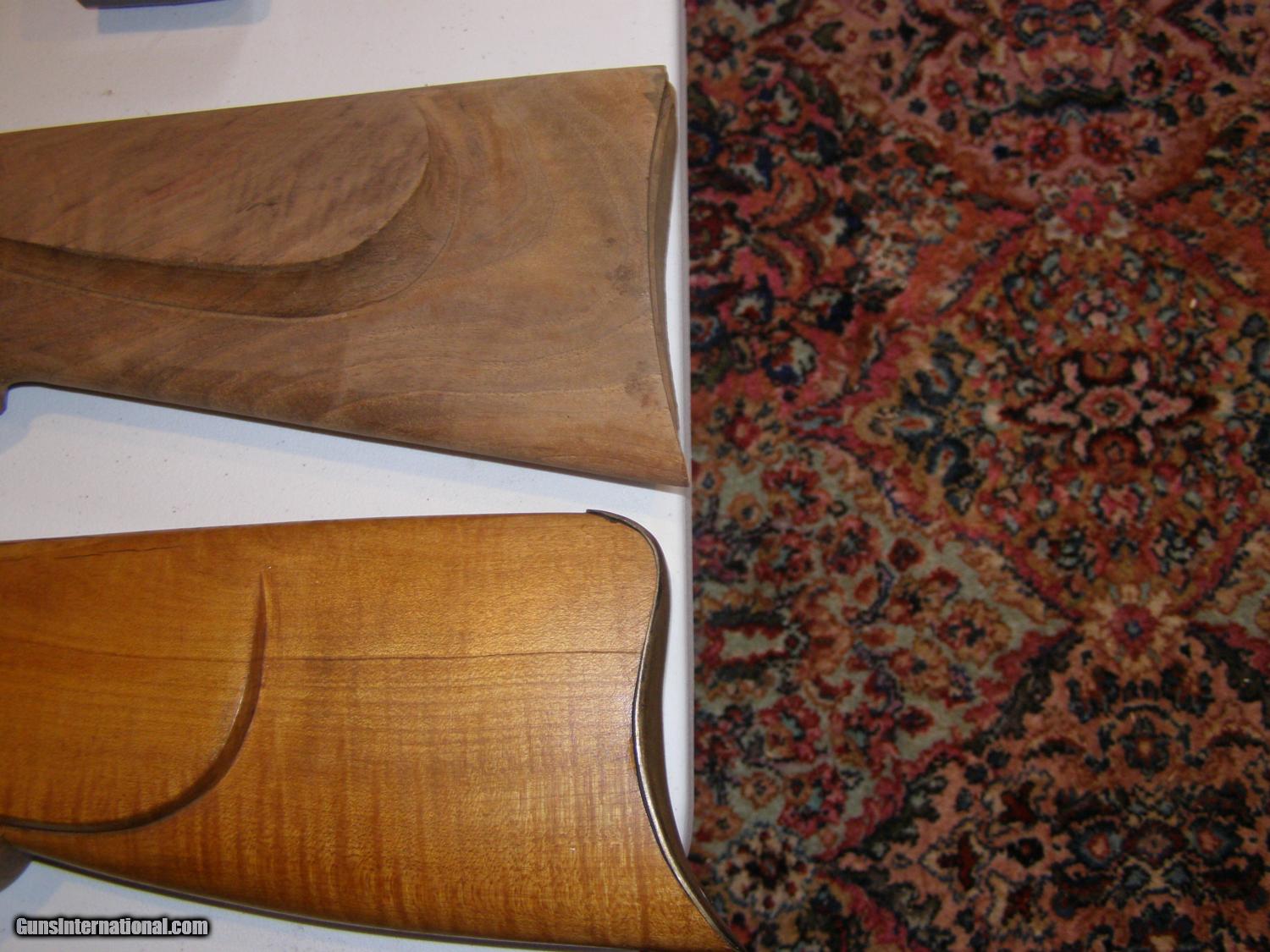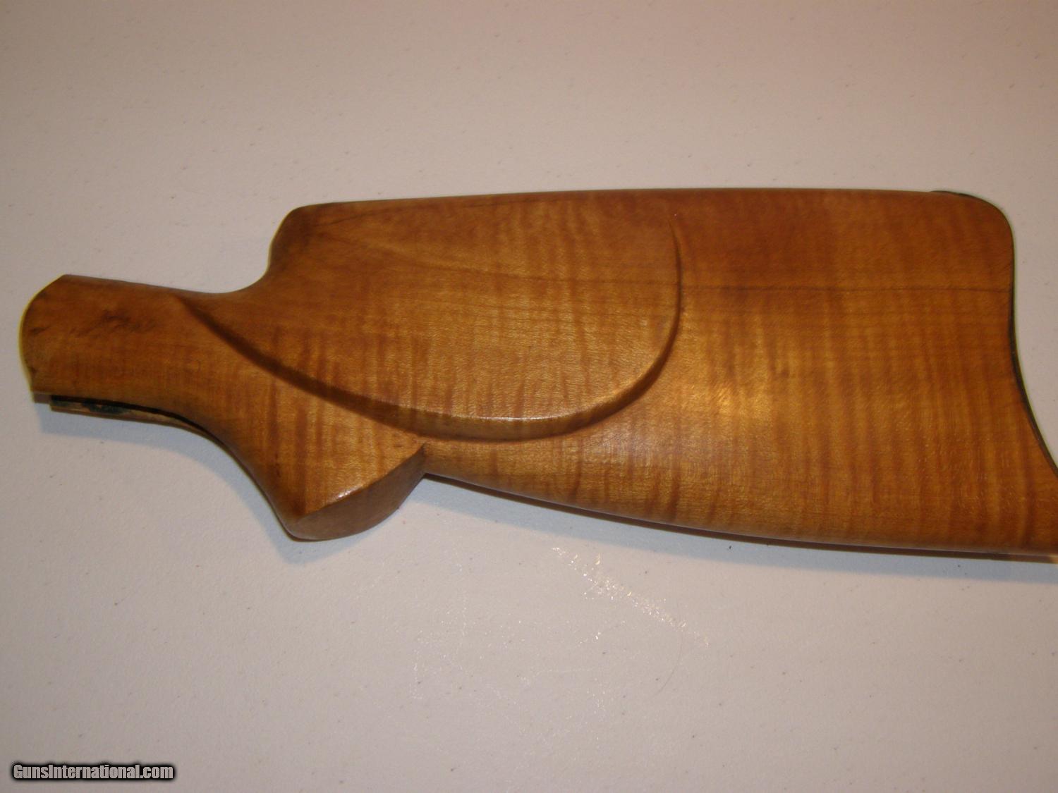 Description: Two butt stocks for curved lowwer tang Winchester 1885 single shots; satin finish is fully inlet and has tang screw holes drilled and buttplate installed.: $60.00. including shipping. Walnut stock is from Treebone Carving; this stock is semi inlet and will require a Neidner buttplate unless you alter it. $90.00 including shipping. SOLD |