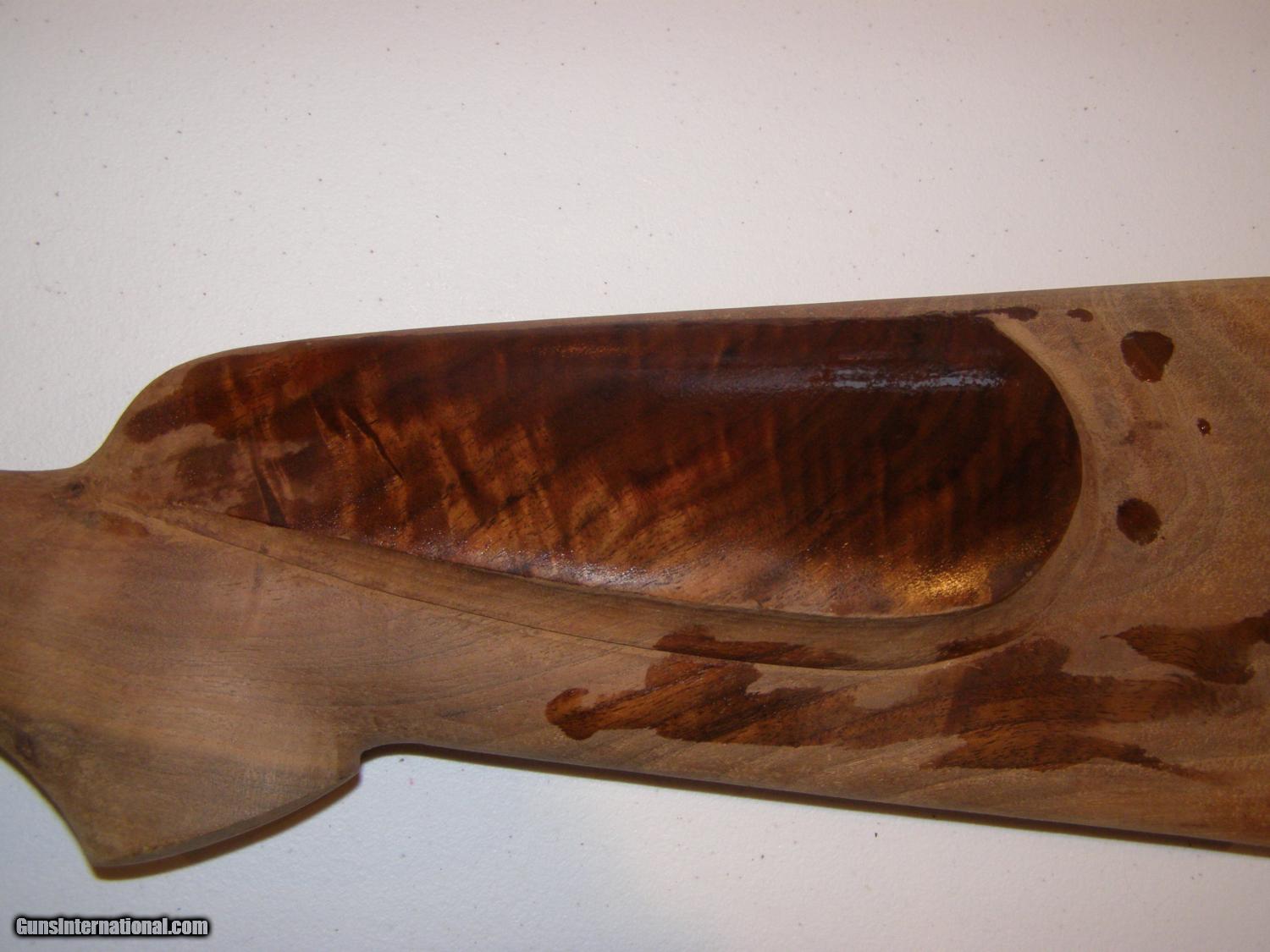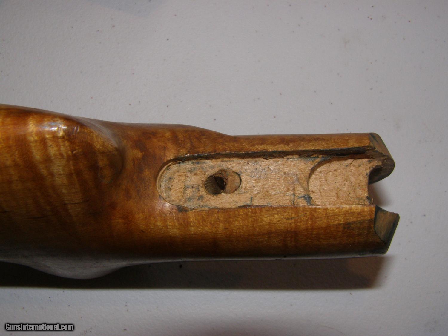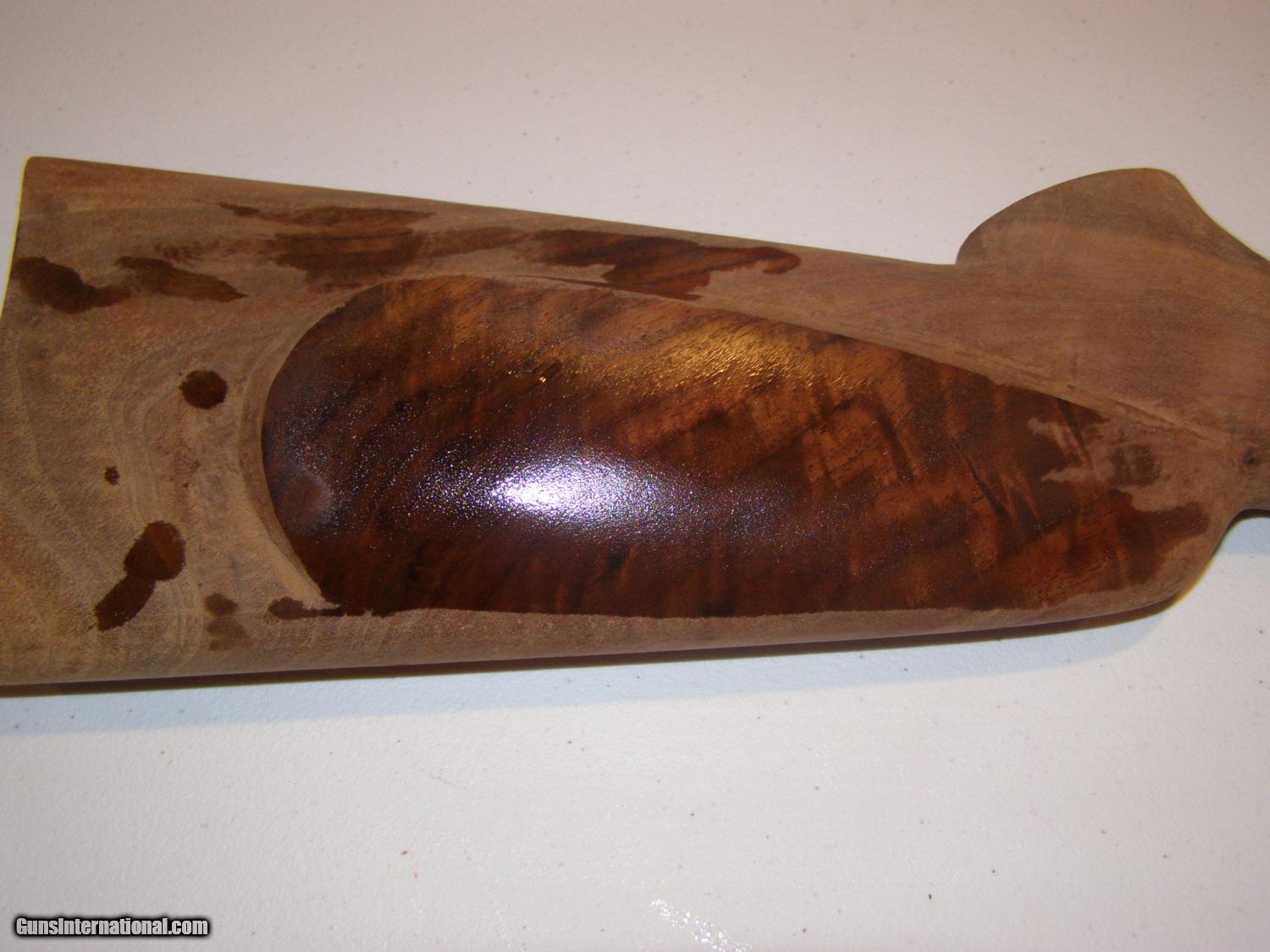 Description: Two butt stocks for curved lowwer tang Winchester 1885 single shots; satin finish is fully inlet and has tang screw holes drilled and buttplate installed.: $60.00. including shipping. Walnut stock is from Treebone Carving; this stock is semi inlet and will require a Neidner buttplate unless you alter it. $90.00 including shipping. SOLD |
