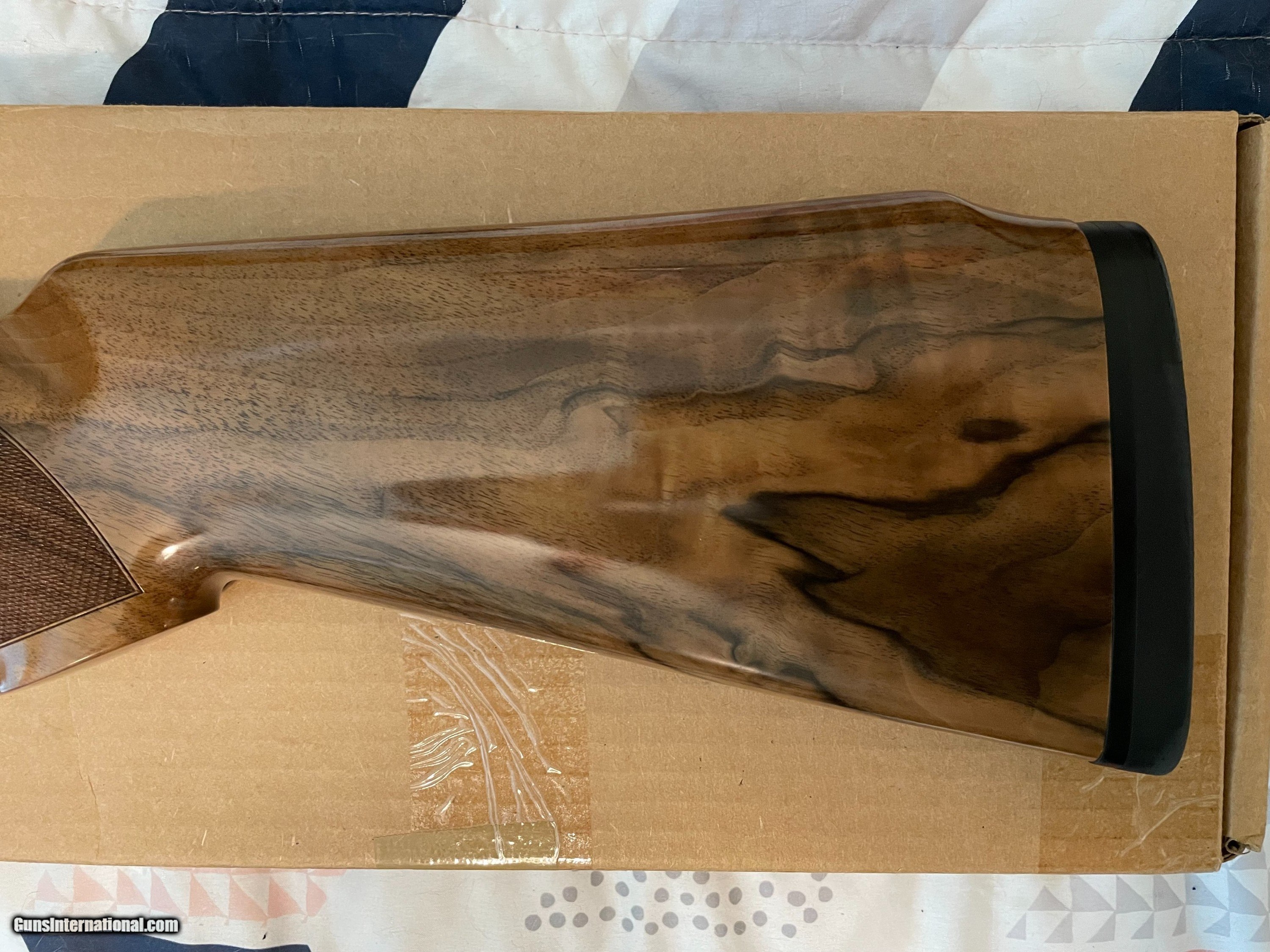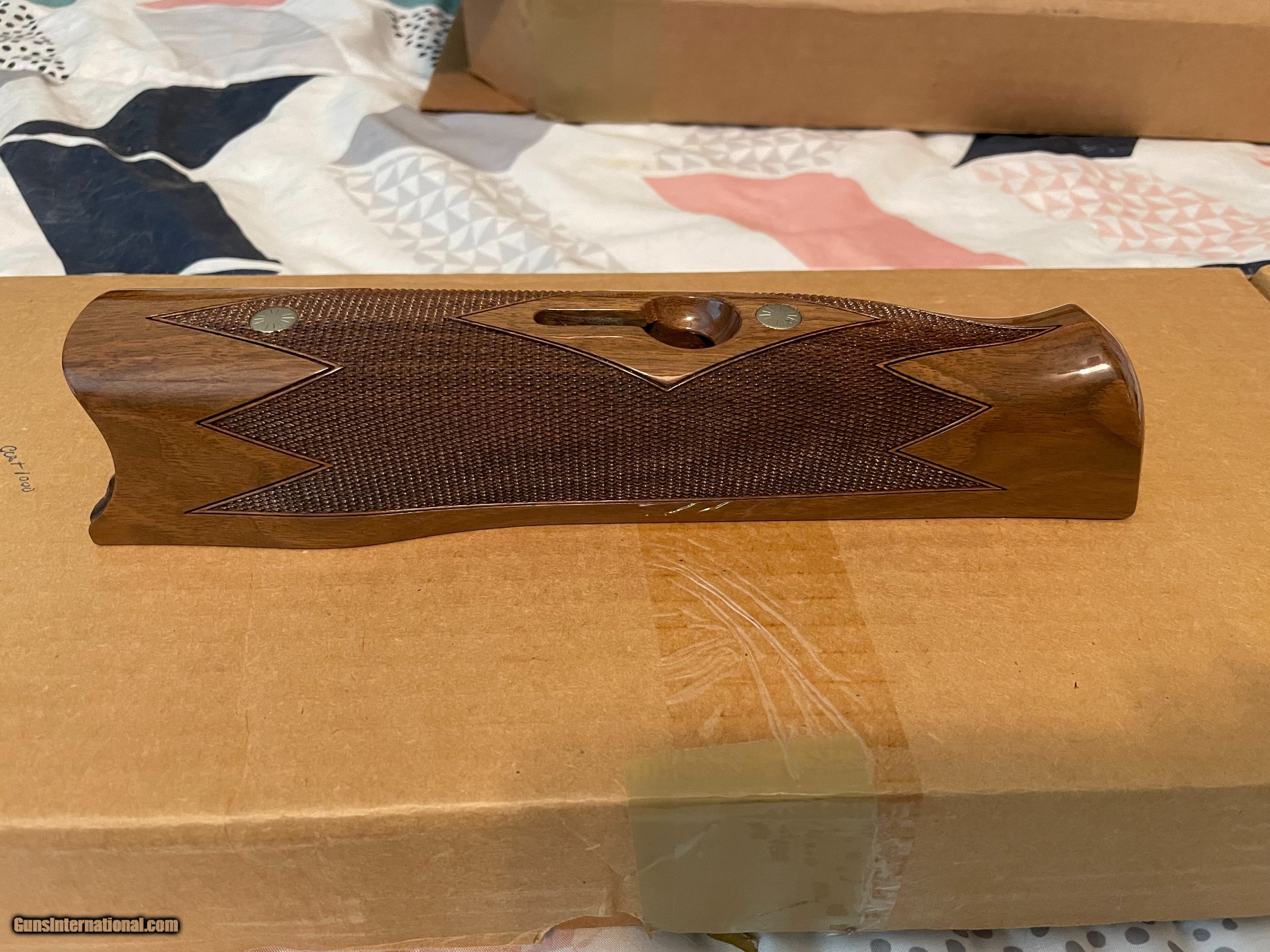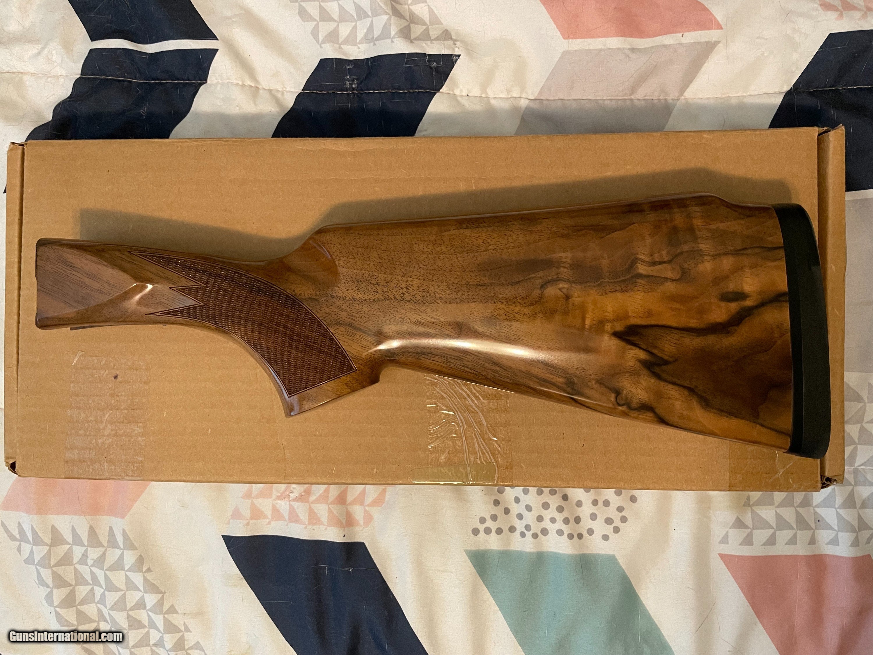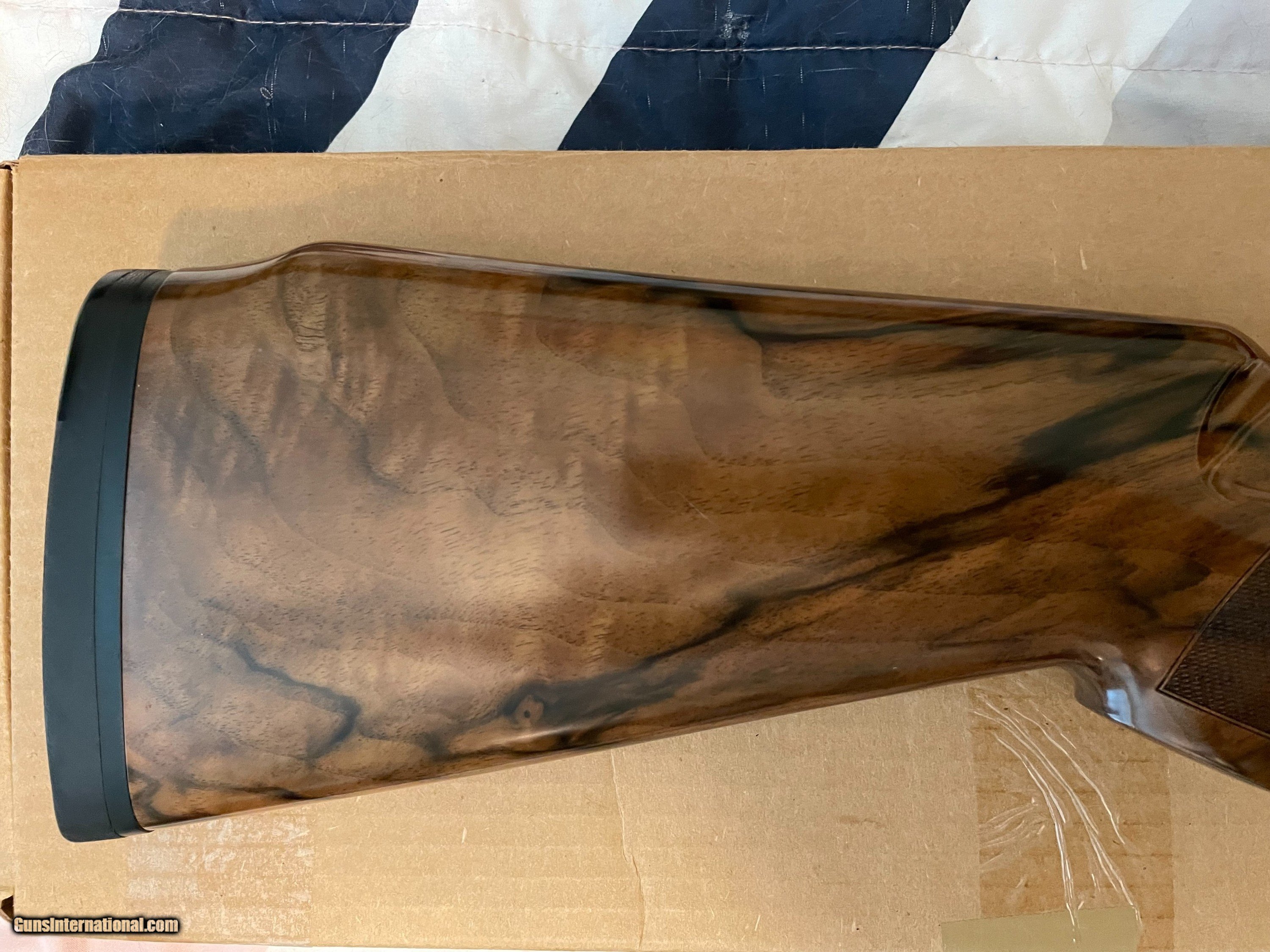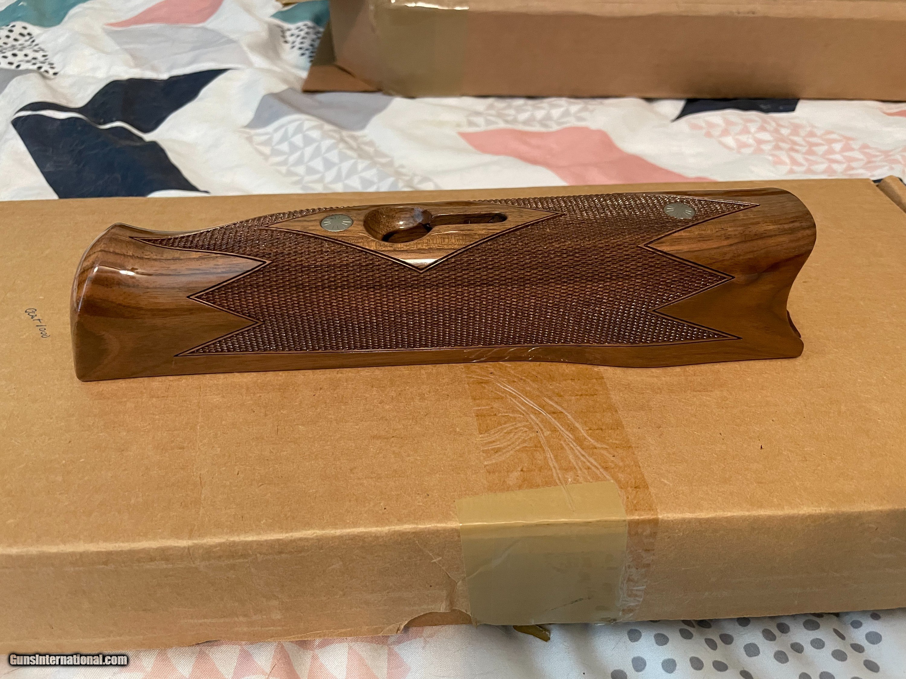 Description: This is an as-new genuine Krieghoff wood set for a K80. Set consists of a #3 ambi/neutral for left or right hand stock with dimensions of: LOP: 14.1/2", drop dimensions of comb: 1-5/8" x 2" x 2-5/8. Stock bolt and original recoil pad are installed. Matching schnabel forearm with rosettes installed. Absolutely zero defects, no marring, scratches, dents etc. Checkering is sharp. Always have a competent gunsmith check fitment. If you have any questions feel free to contact me. Happy shooting! SOLD |