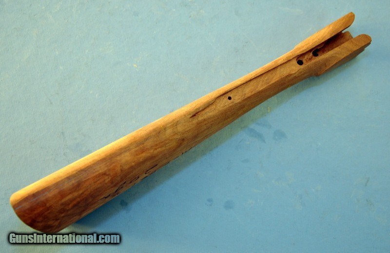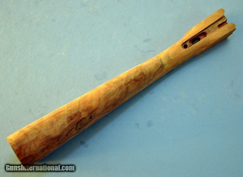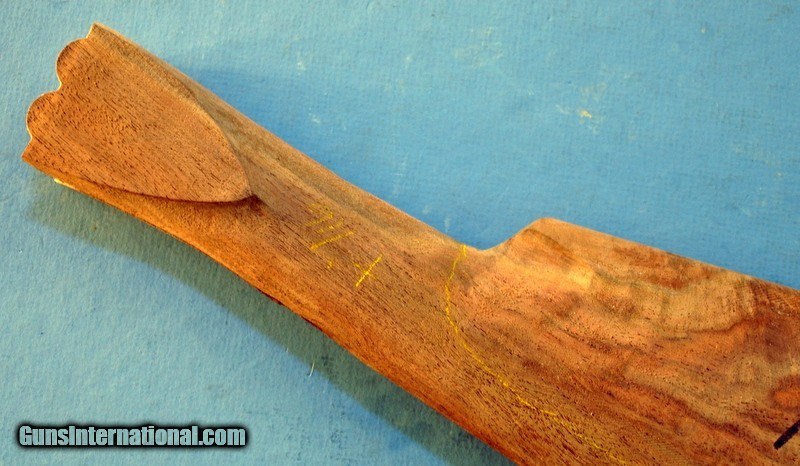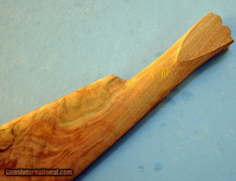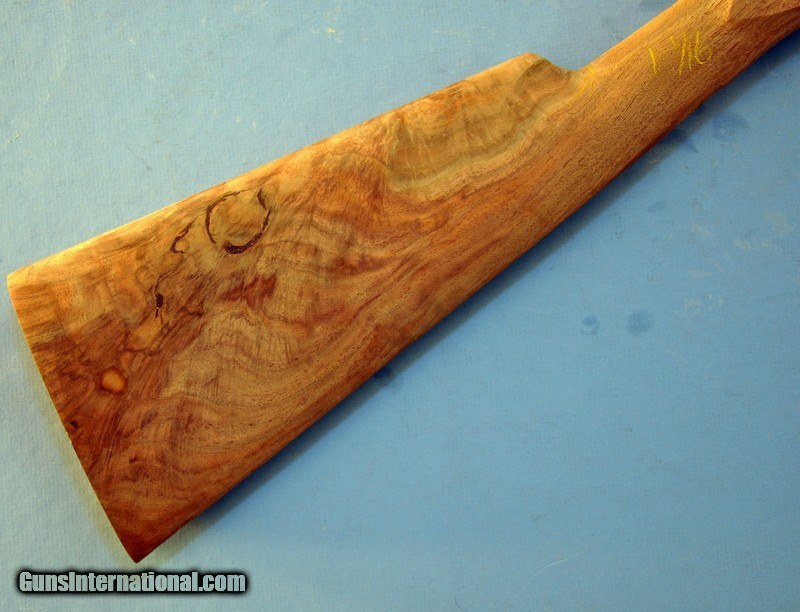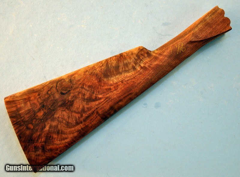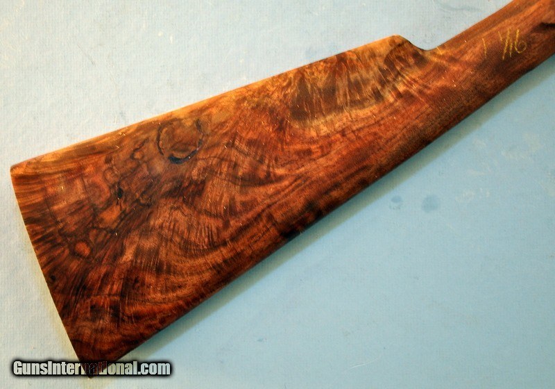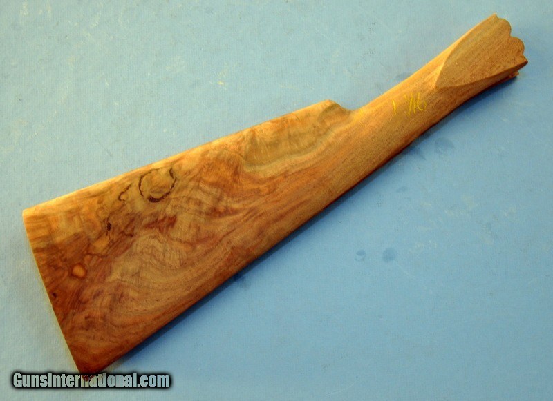 Description: Straight grip stock of fancy Claro walnut for Merkel box lock double, exact model is unknown.. Butt section shows vivid burl with striking red, yellow & brown color contrasts. The grain straightens out in wrist & head areas providing strength where needed. Right side has imperfections with glass fill. OAL 15-3/8". Approximate drops are; DAC 1-1/4" DAH 1-3/4". Priority mail $15.00 SOLD |