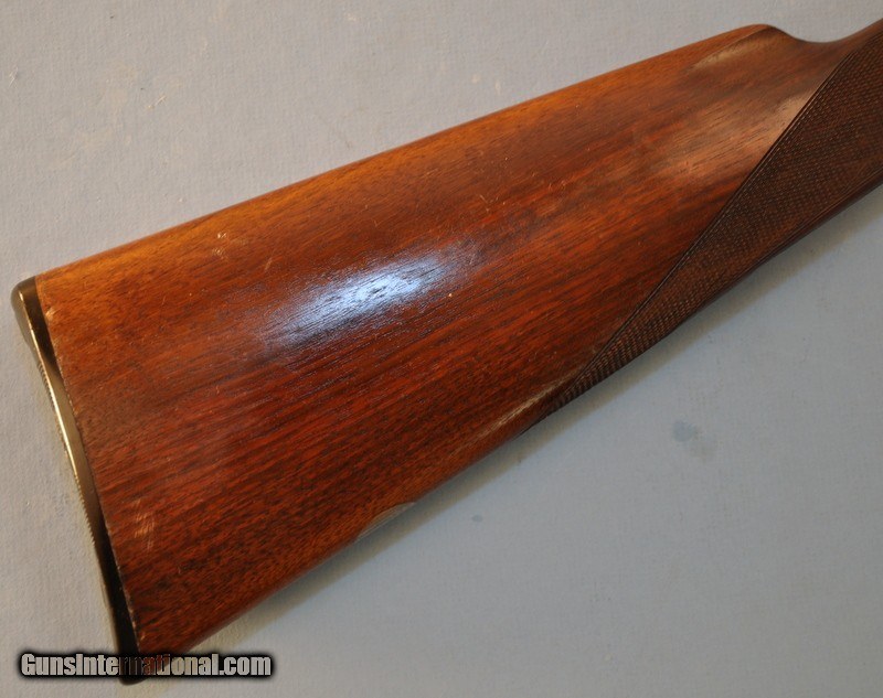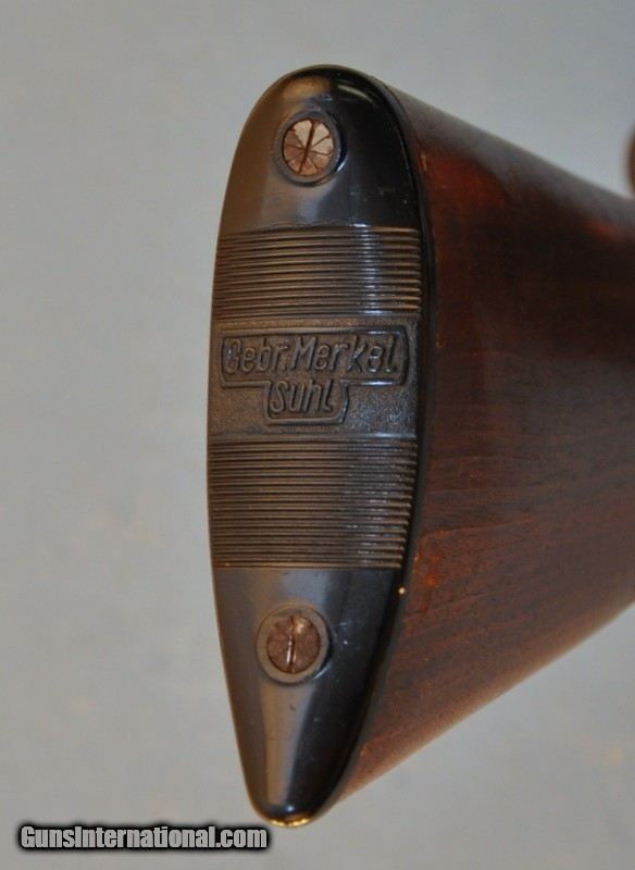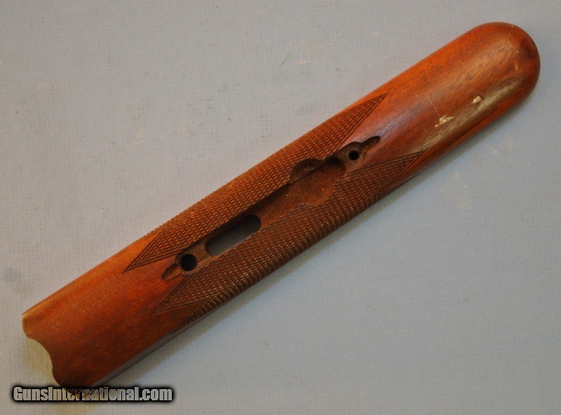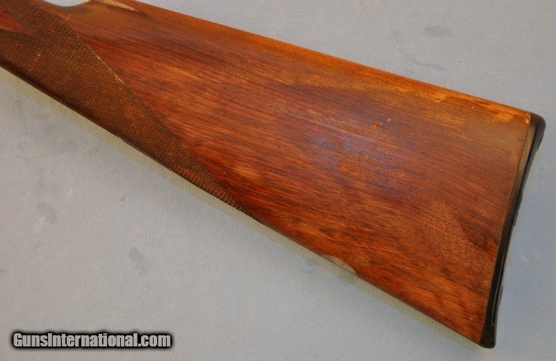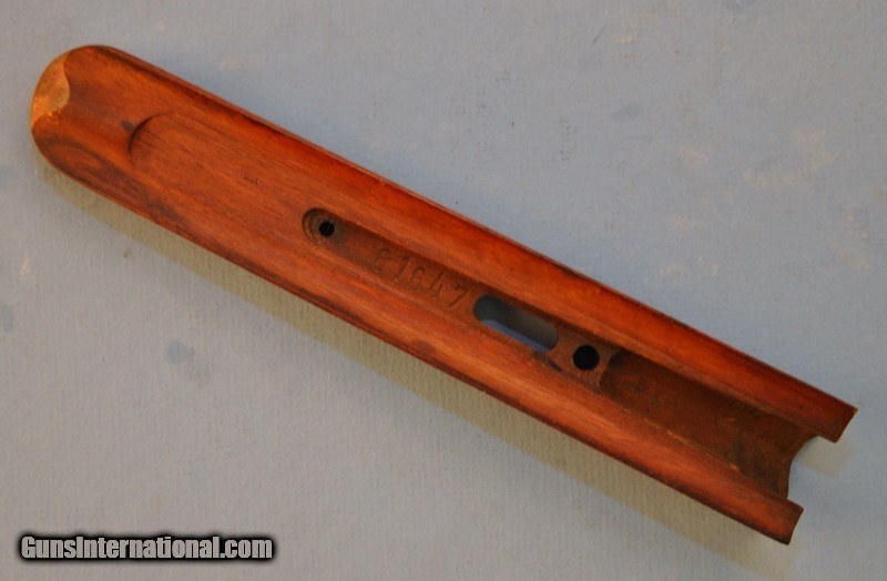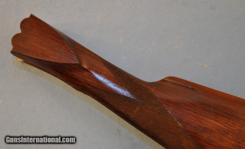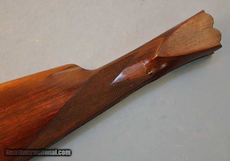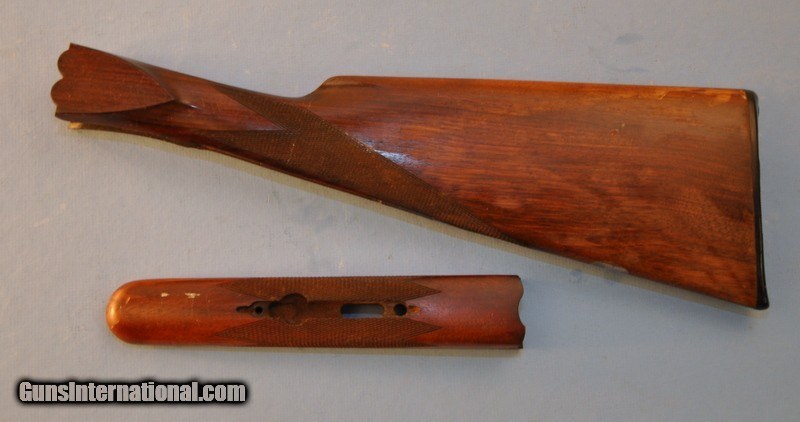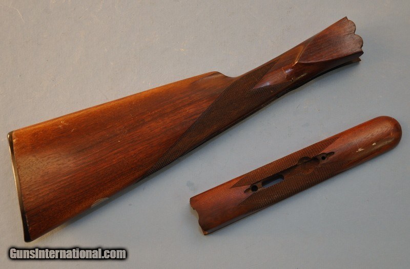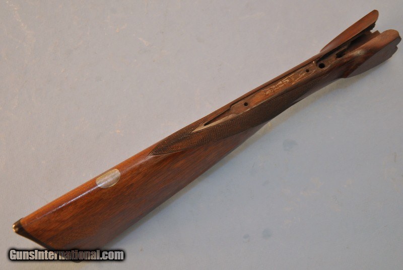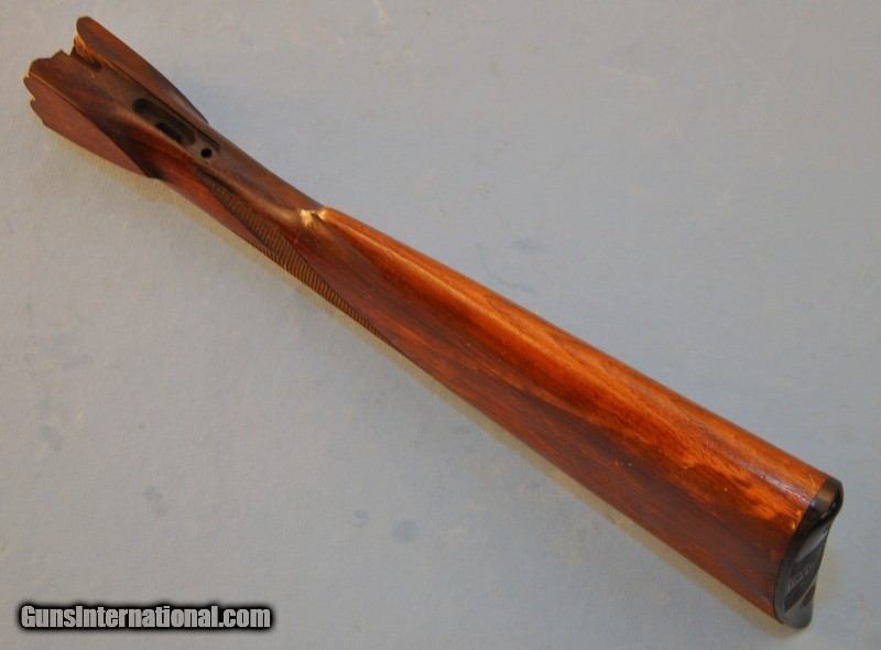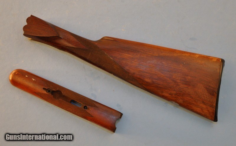 Description: Factory full length straight grip walnut stock & splinter forend for 20 gauge Merkel box lock double of unknown model. Piont pattern hand checkering. Original buttplate & oval name plate in toeline. Left side shows some sanding in preperation for refinishing. Right side has a spot of epoxy on finish, no damage is present. Original forend finish shows a few light marks. No cracks, wood damage or alterations. A nice set of factory wood that will look great with proper refinishing. Priority mail $15.00 SOLD |