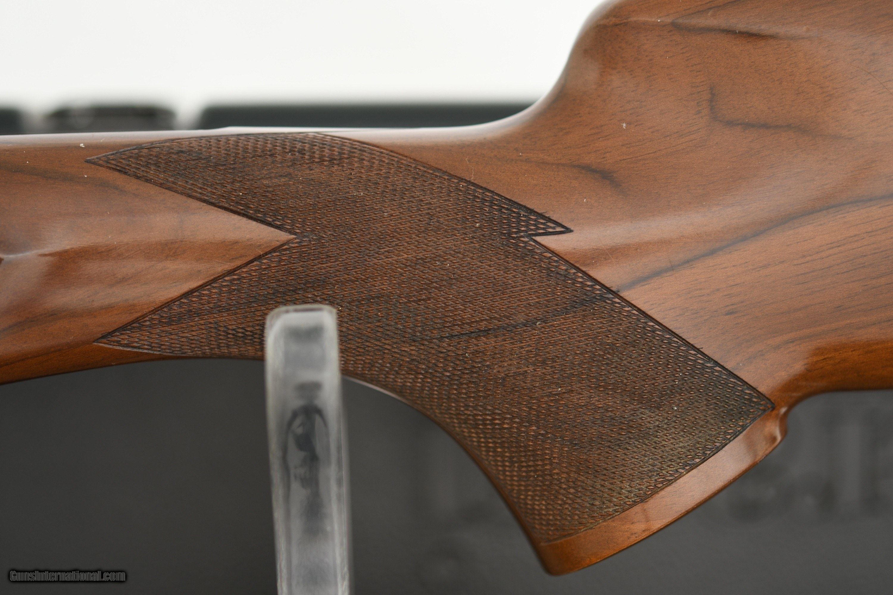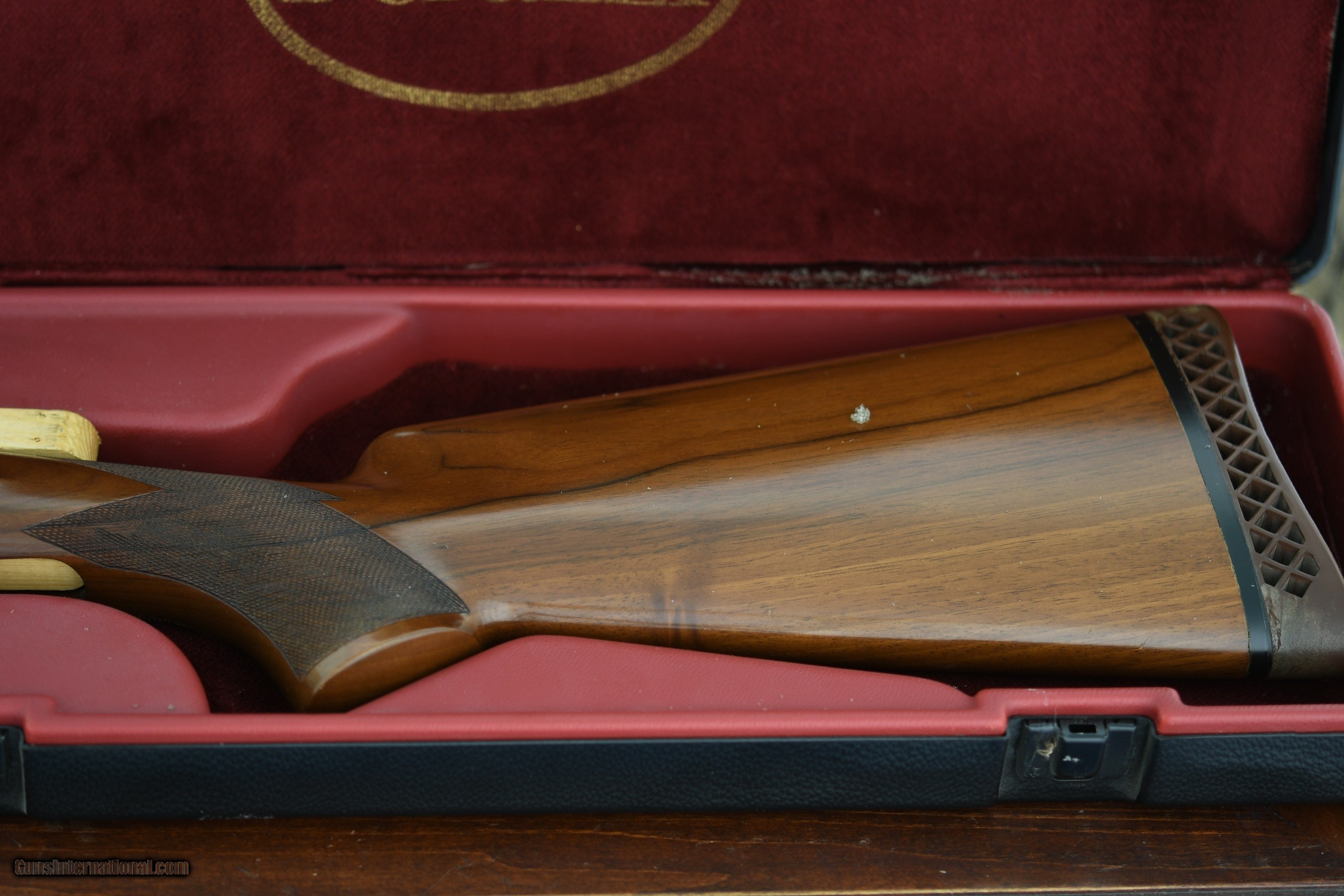 Description: Perazzi stock for a 12 gauge. Believed to be for a removable trigger gun. The stock dimensions are; LOP - 14 5/8", Drop at comb - 1 1/4", Drop at heel 1 3/8", measured on a "flat rib" model. Stock is in excellent shape. No carcks. Checkering is sharp. Perazzi stock hard case with deteriorating foam interrior (see last photo) as typical for that era. Shipping is $30 Shotgun Gauge: 12 Gauge Price: $250.00 Contact Seller |