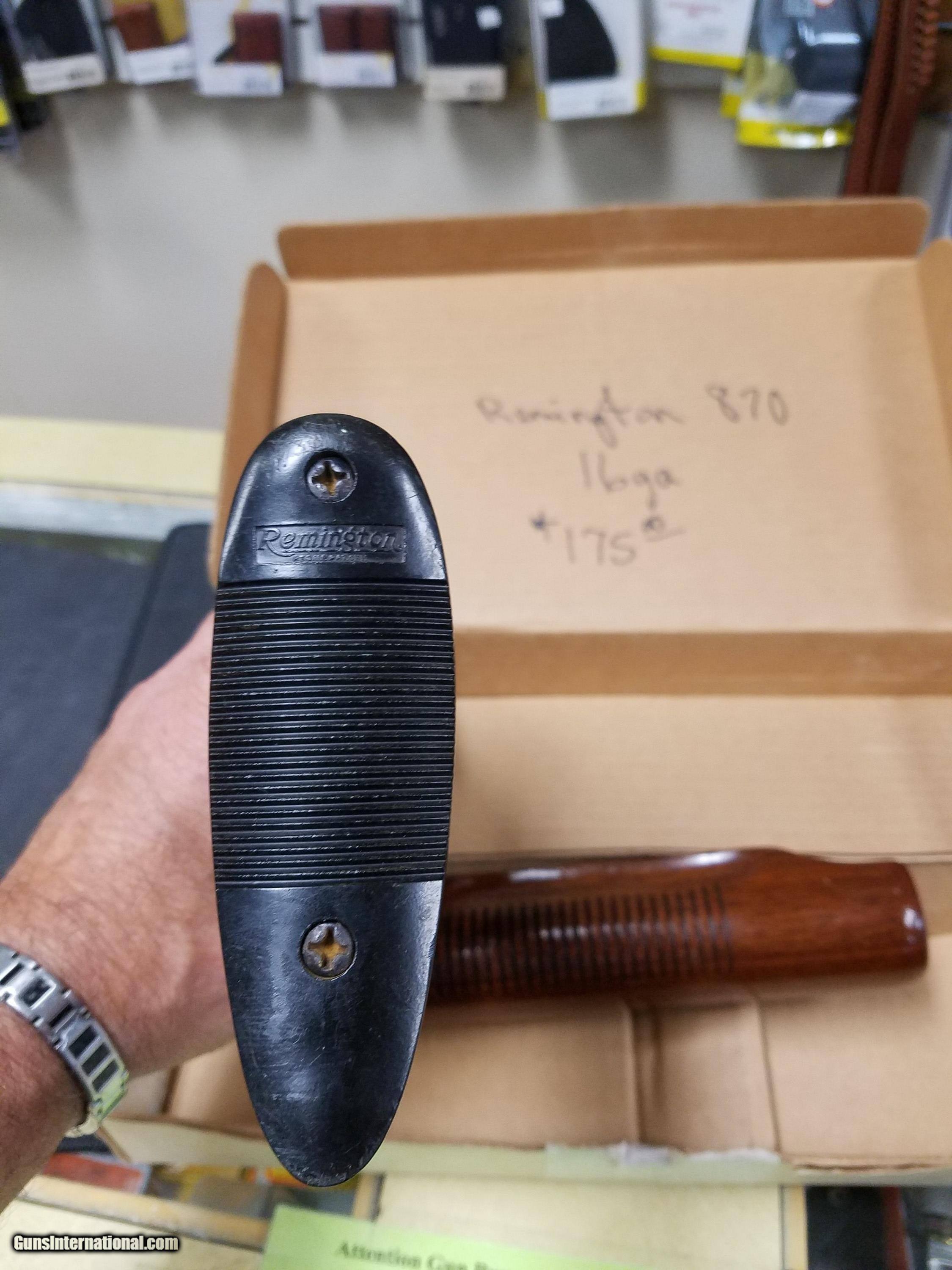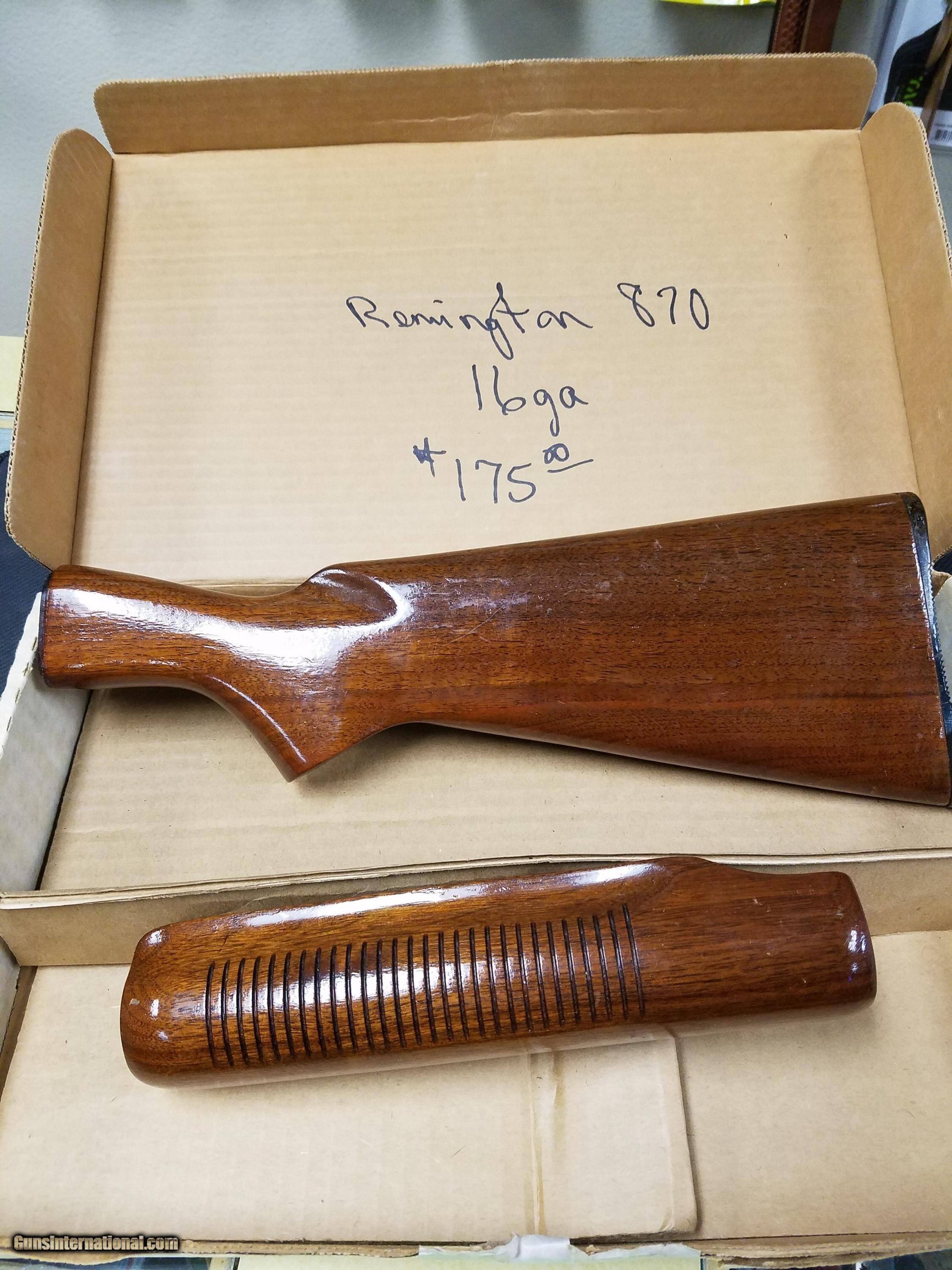 Description: A high condition Remington 870 stock set that is labeled 16ga. Very minimal wear or denting. Original length of pull. If you every wanted to update grandads gun this set would be a great start! Please call or email with any questions. Cash or check only for the stock set. There is a $20 shipping charge for this item and is NOT refundable. Insurance may be extra. Thank you, Darryl Howard SOLD