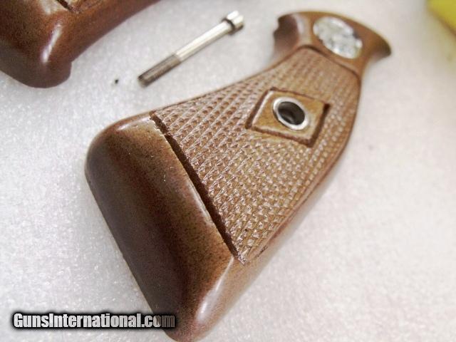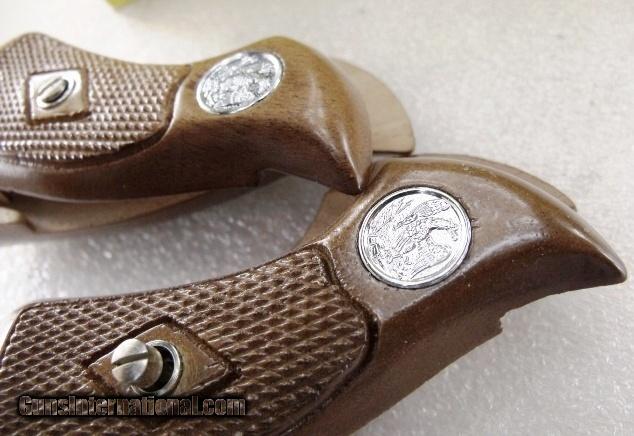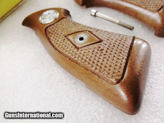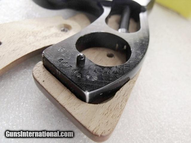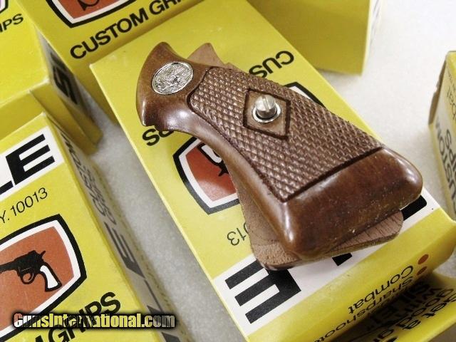 Description: No sales outside the US. Our # GRsilSQJD, Grips for S&W J Frame Round Butt Revolvers Sile Walnut Square Butt Conversion Grips 1980s Production As New Smith & Wesson Models 34 36 37 38 40 42 637 638 640 642 317 651 / This listing is for One Set of Grips. Buyers, however, may take any number of additional small light similar items on the same order and it will not add anything to your shipping costs. Most Smith & Wesson Revolvers manufactured after 1996 have Round Butt Grip Frames. If you aren’t sure which yours is, please see the comparative photo. Photos show representatives of only a handfull Italian Walnut grips we found in an old Southern Warehouse for any Smith & Wesson J frame revolver with a round butt grip frame. These include models 34 and 36, and their stainless counterparts models 63 and 60. These are excellent grips, and we sold lots of them during the 1960s until 1980s. These were imported by distinguished New York Importer Sile, Inc., and all of them are new, just occasionally with some slight signs of shelfwear from their years in the warehouse. They are in their boxes, but the glue is dry and the boxes show some separation. Their interior wrapping paper is old and brittle, but the grips themselves are pristine, never opened. What these do, shooting wise, is to increase the size of the grip on a J-Round and give the shooter better control, whether for target shooting with a round butt 4 inch Model 34-1, or in Combat situations under stress for concealable revolvers. These grips’s heyday in the 1970s and 1980s saw them compete favorably with the much pricier factory Smith & Wesson grips that were hard to get at the time for any price. This was before the days of boot grips, but with a set of these Magna style Service grips and a Tyler T Grip adapter, a person had an excellent means to hold a revolver that current production boot grips simply cannot match. Some of our photos show the grip frame of a 1968 Airweight Bodyguard with a set installed. We strongly recommend inspection and fitting where the revolver’s grip frame makes contact. These are all genuine diamond pattern checkered Italian Walnut with nickel plated screws and screw escutcheons. These grips are period correct for any Smith & Wesson manufactured from the late 1960s through about 1995, and we consider them collectable in their own right. They will fit all current production variants of the J Frame Round Butt revolvers. We’re offering these fine grips well below what similar bizarre looking competitors sell for. Own a set, the ones in the photos or a set of their identical mates for only $ 39.00. Grips, Magazines, slings, holsters, scopes, mounts, parts & most any small light items, entire accessory orders only $10.00 total shipping no matter how many a person buys. $10.00 for an entire order, Not $10.00 per item or anything of the sort. $20 Flat Fee on magazine orders to Alaska, Hawaii, or Puerto Rico, and gun parts to PR civilians must ship to an FFL. Magazines and any small light non-gun items ride free with ammo orders. We accept checks with no more than 7 days hold. GA Pay, MC, Visa, Discover phone- or fax-in 7 3 1 9 8 9 4 7 2 3 orders, USPS Money Order items shipped ASAP please put your full information, venue number, and what the item is on any messages. Internet phone hours 8:00 – 5:00 CST Mon – Fri. Robertson Trading Post 117 Front Street PO Box 365 Henderson, Tennessee 38340. We buy, sell, and trade. Always have, since 1952. SOLD |
