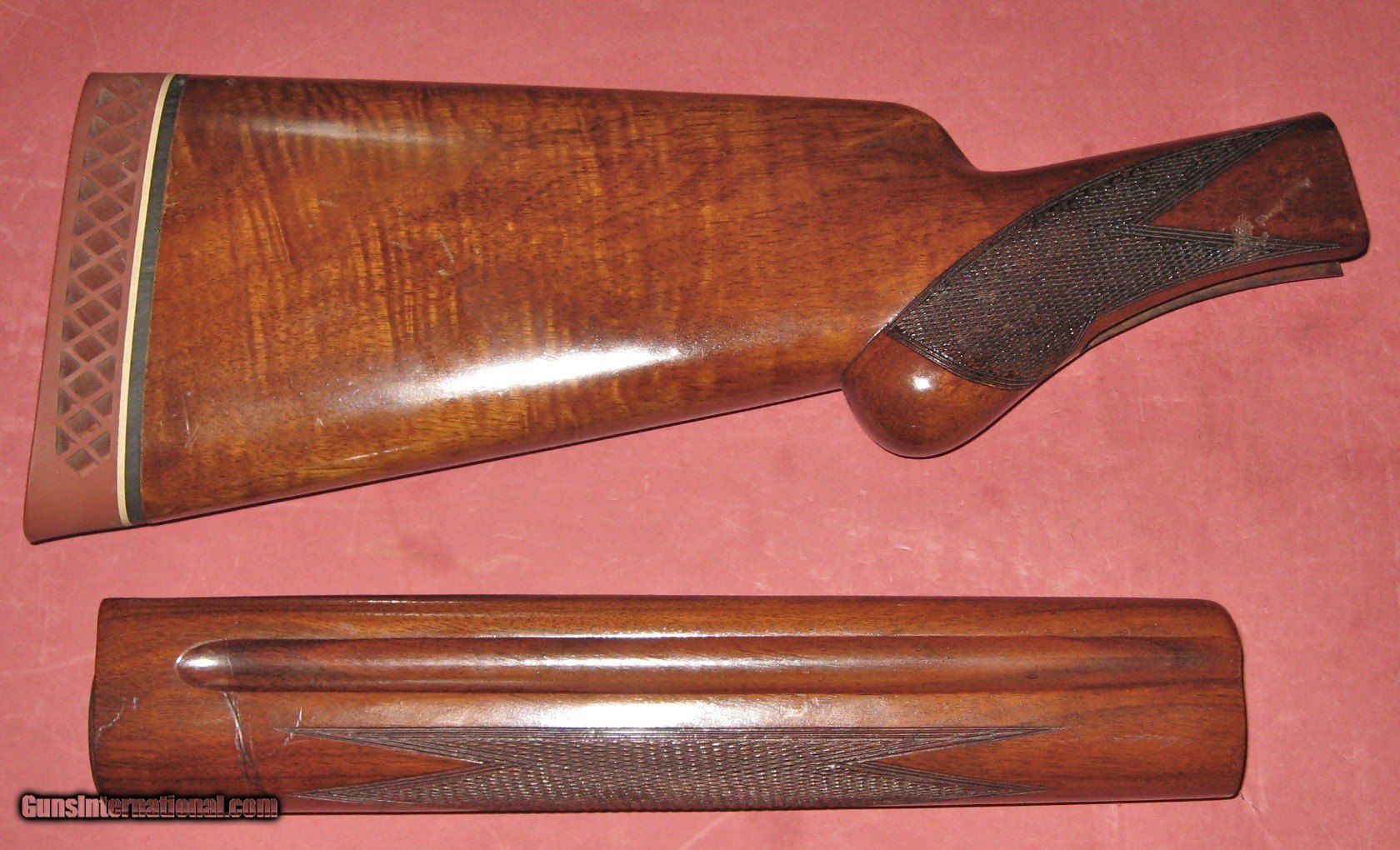 Description: A Stock and forend for a 1950s 12 gauge A5.The stock has the round knob pistol grip and a 14"LOP over a Pachmayr pad when fitted to a gun.Both stock and forend have the red wood finish and fine checkering that was typical of Brownings at that time.Both pieces retain 98% of the original finish.There are no cracks or damage,just a few light handling marks. A very nice set to put your hunting gun back in good shape. SOLD |