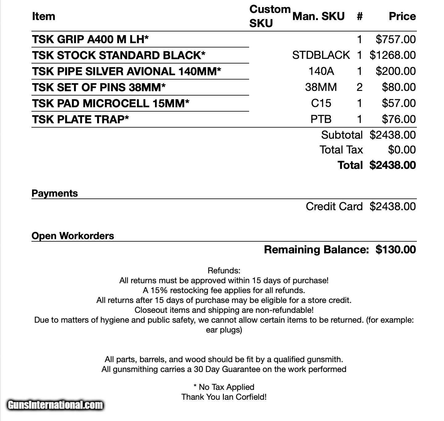 Description: Fully Adjustable TSK Stock, purchased from Coles Fine Guns. This TSK stock will fit any Beretta A400 series Shotgun. It is a Left Hand (LH) grip. I had used this on my Beretta Multi-Target with great effect. I'm now selling my Mutlti-Target with the OEM stock and the TSK is up for sale. All hardware included, may require a gunsmith to attach the unit to your receiver initally, but after that the adjustments are super easy to make to ensure a good fit. Great for youths who are still growing or for those who want to 'dial' in their stock for the best fit. Extra set of tall posts for the adjustable comb also included. I have $2500 into the system. I will sell for $1175. Buyer pays shipping and any insurance. Price: $1,175.00 Contact Seller |