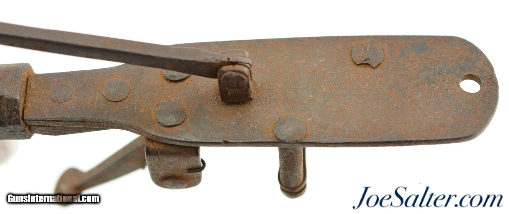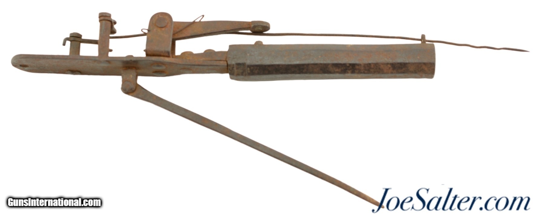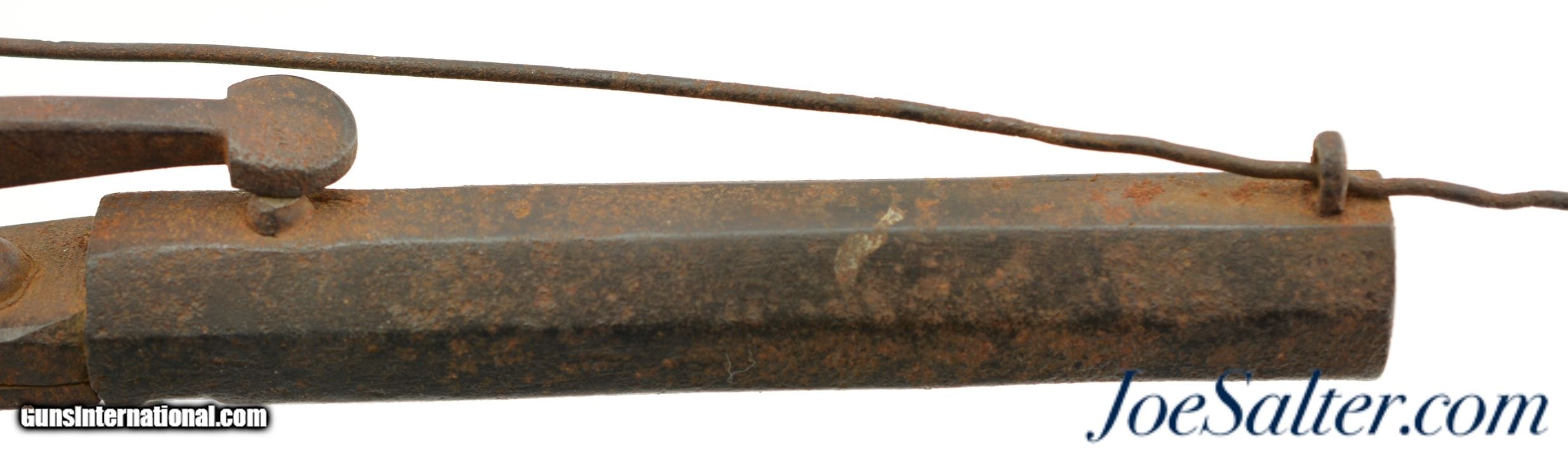 Description: This is a very nice and well persevered antique muzzle loading trap gun. This appears to be a blacksmith made unit not factory and no makers marks found, with slight imperfection and peened rivets. It has a 5 1/4" octagon barre with a modified touch hole about 60 Caliber with a loop on the barrel to house the trigger trip rod. Other component consist of a functional spring on a long hammer, post held safety and rod activated slip trigger. There is a 7" wrought iron ground spike and total length from muzzle to back of 10 3/4". No gun collection is complete without a nice trap gun. SOLD Antique: Yes |