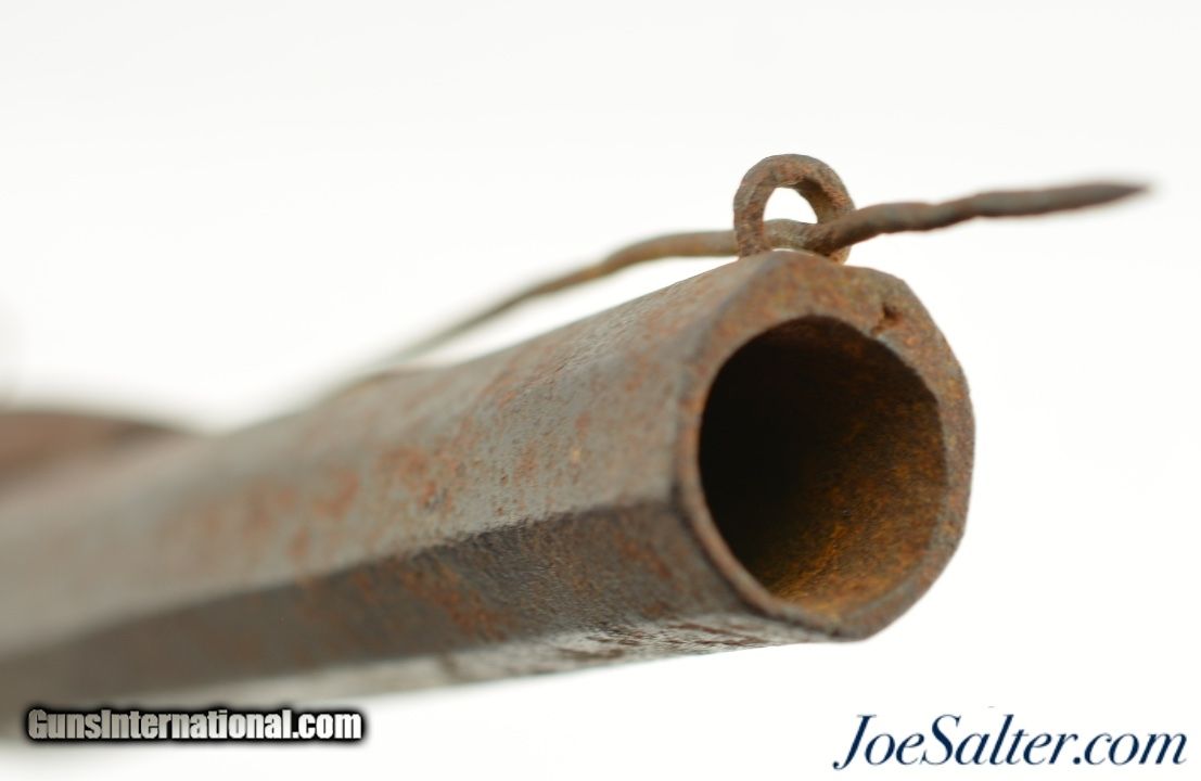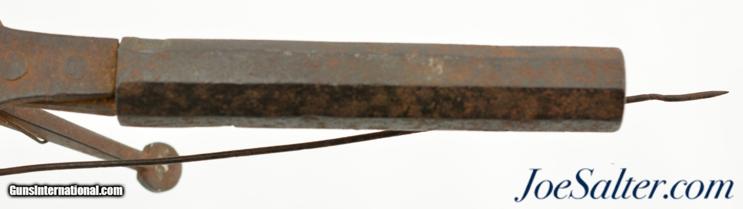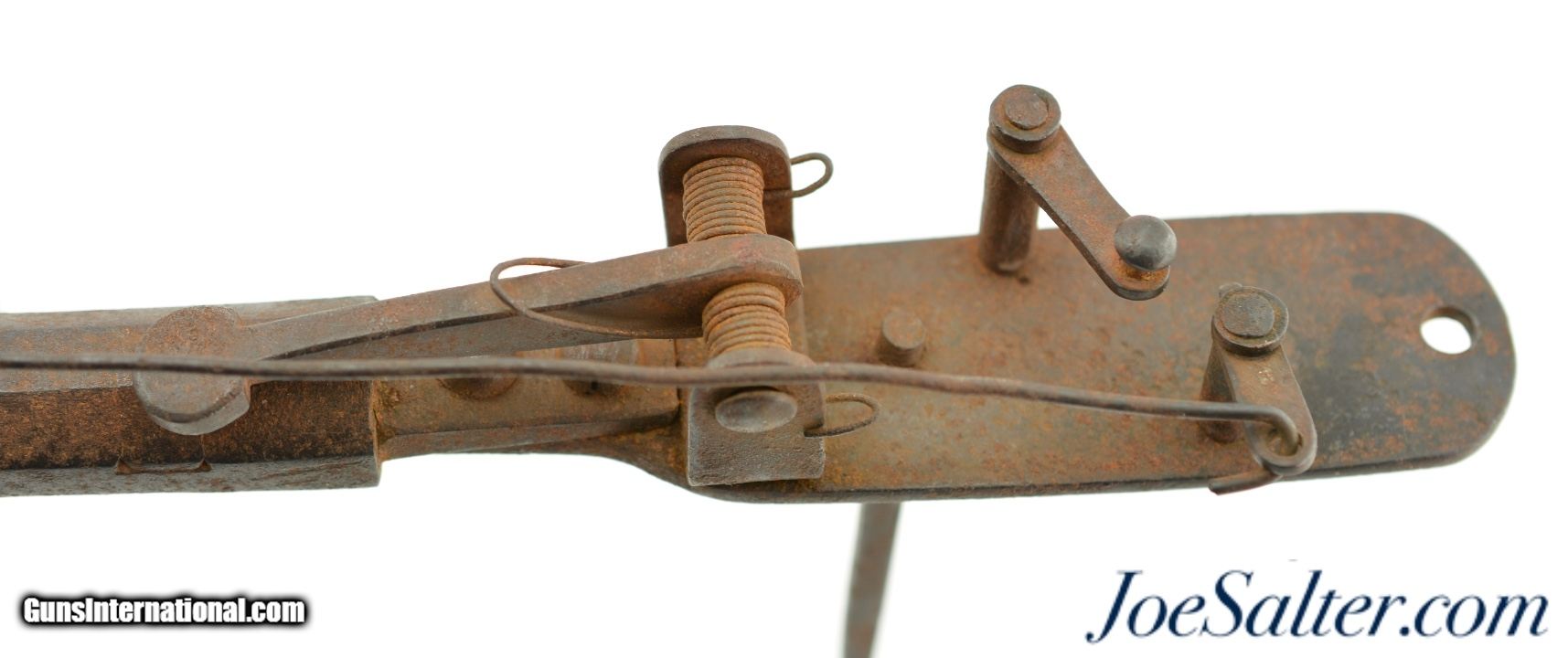 Description: This is a very nice and well persevered antique muzzle loading trap gun. This appears to be a blacksmith made unit not factory and no makers marks found, with slight imperfection and peened rivets. It has a 5 1/4" octagon barre with a modified touch hole about 60 Caliber with a loop on the barrel to house the trigger trip rod. Other component consist of a functional spring on a long hammer, post held safety and rod activated slip trigger. There is a 7" wrought iron ground spike and total length from muzzle to back of 10 3/4". No gun collection is complete without a nice trap gun. SOLD Antique: Yes |