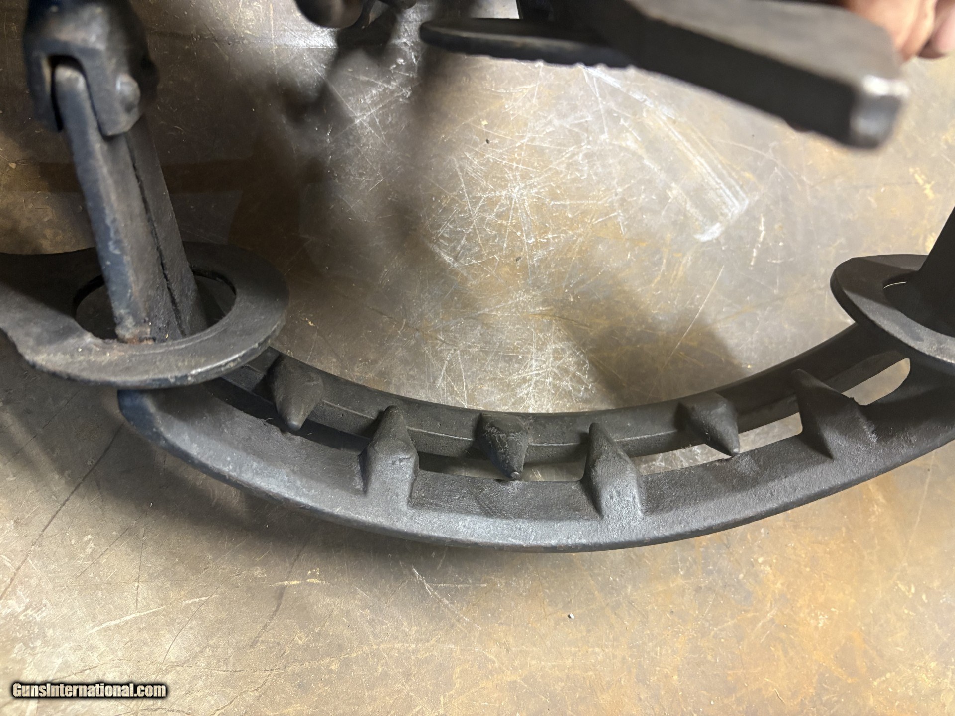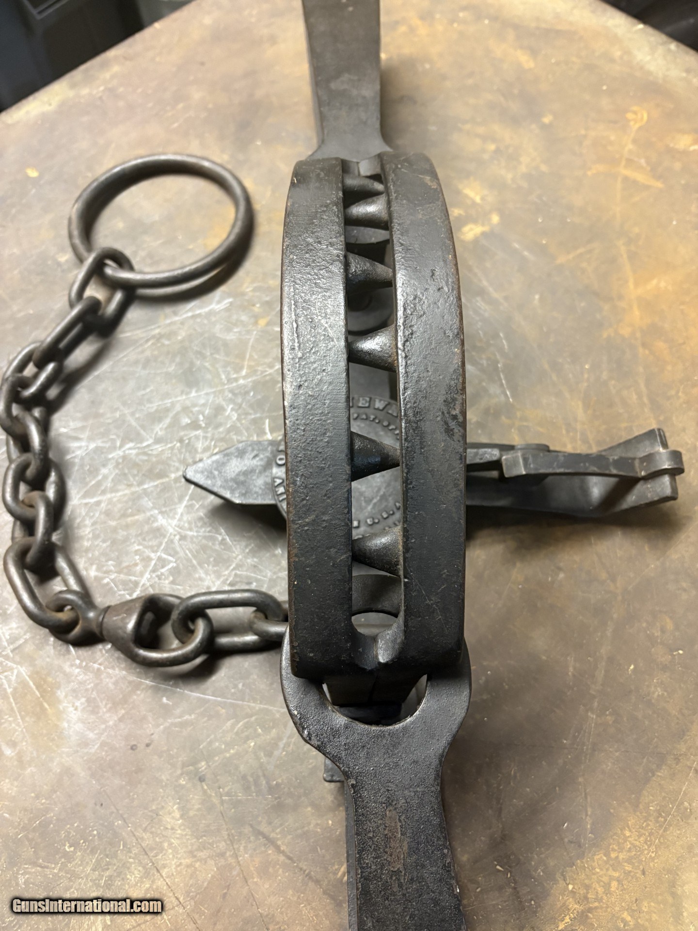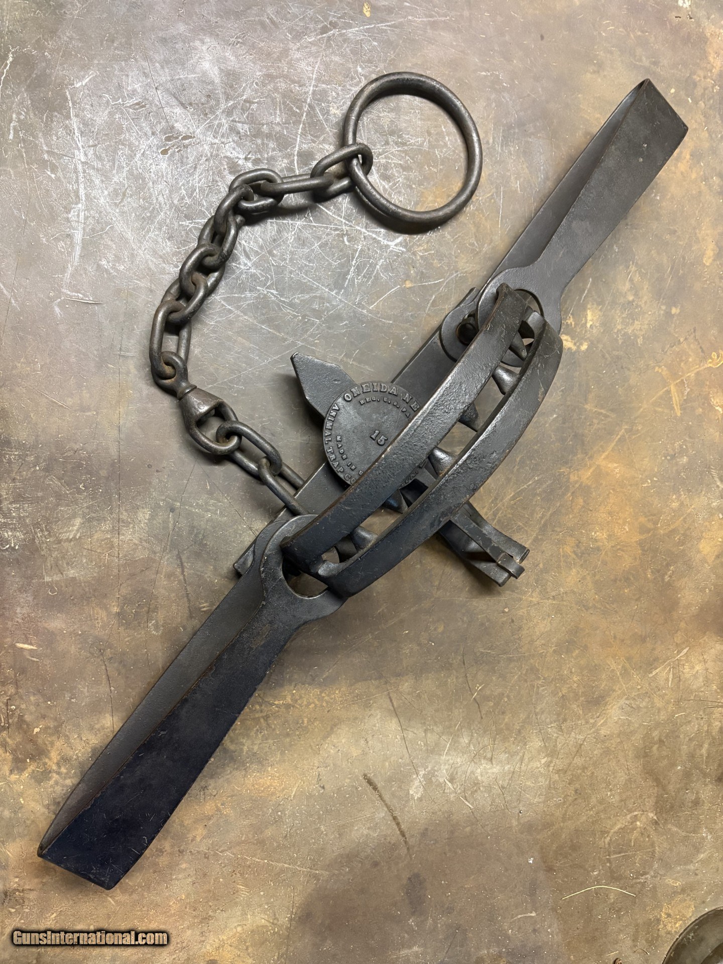 Description: Nice original antique S. Newhouse #15 bear trap. All complete with offset jaws and teeth, strong springs, and in great condition. Price: $1,500.00 Contact Seller |