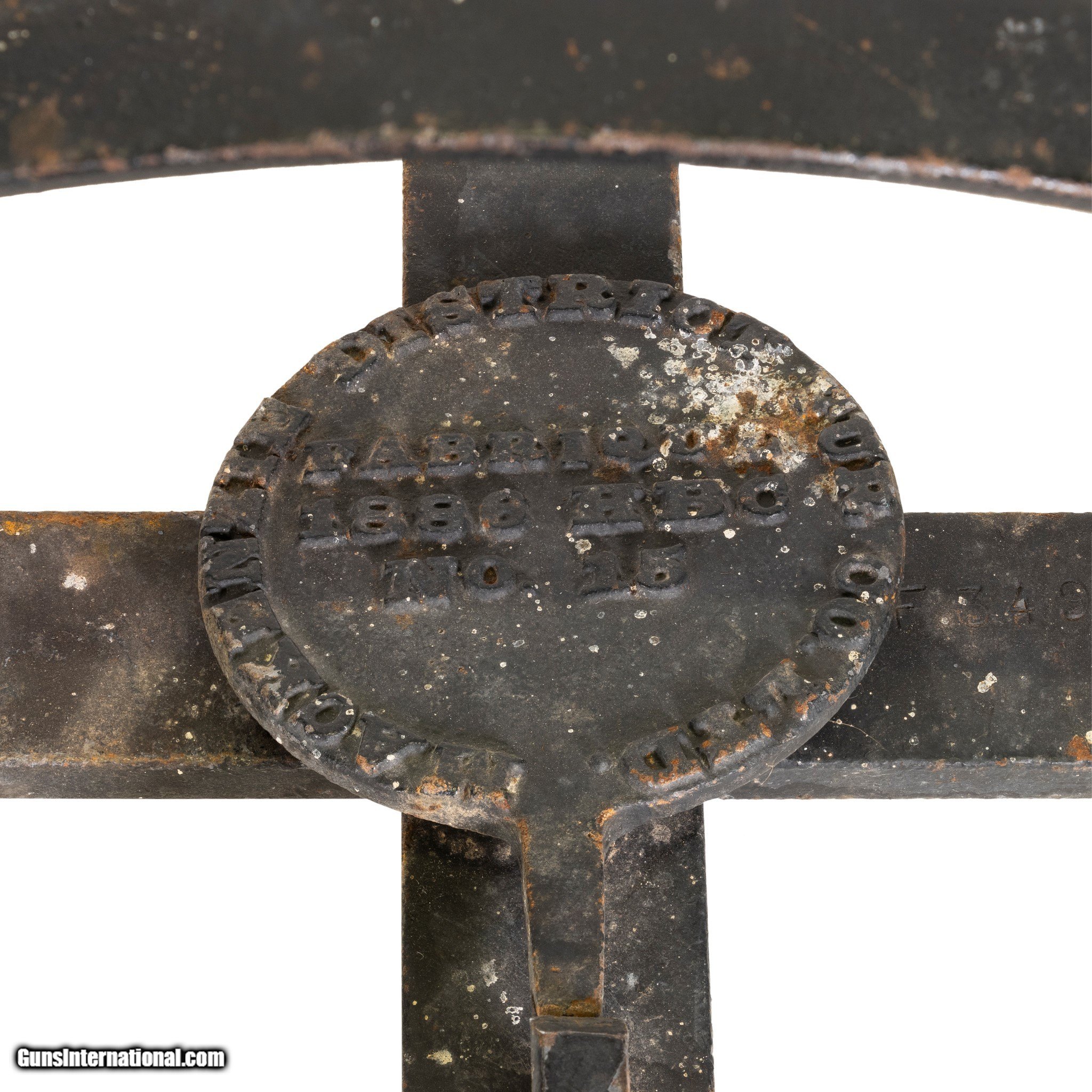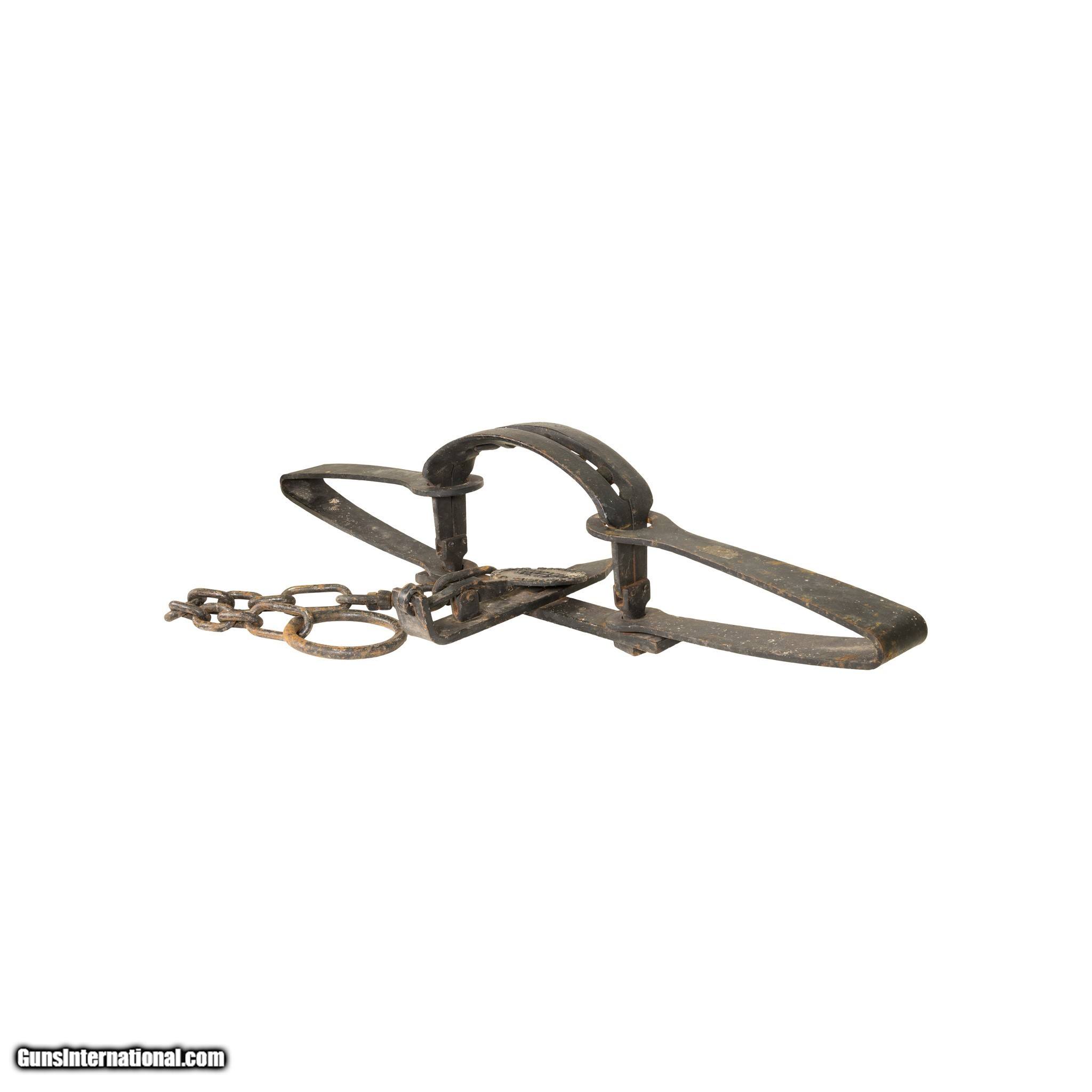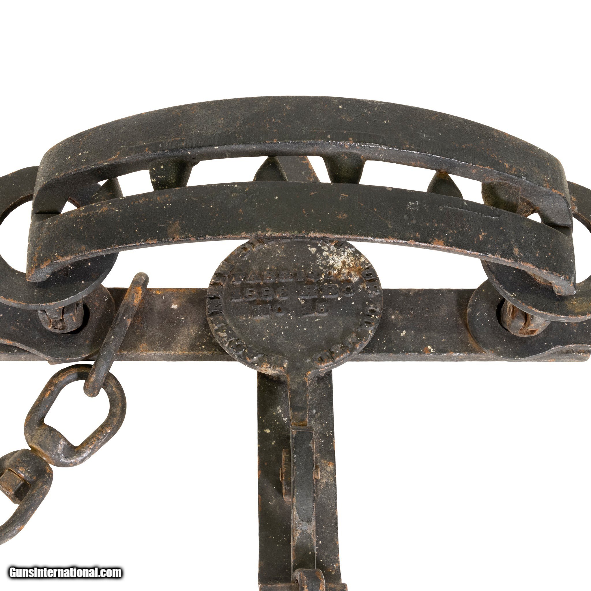 Description: Desirable extra-large bear trap with massive 12" jaws with exposed teeth. Pan marked Mackenzie District Co. LTD, No. 15 HBC 1888. With original chain. We removed brown bear fur. This one had caught at least one. 11" jaws; Overall 24"L; Jaws open 12" x 6". SOLD |