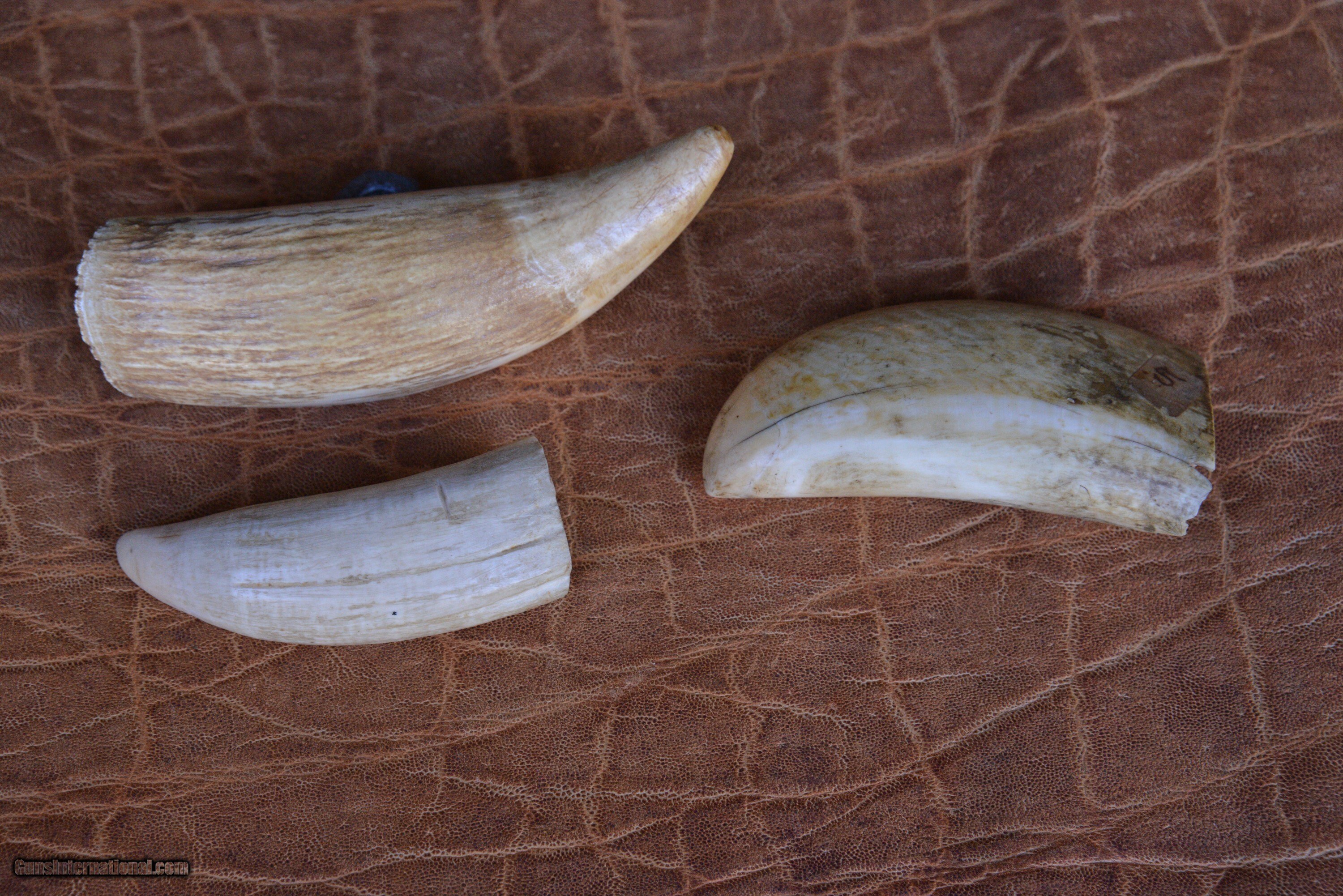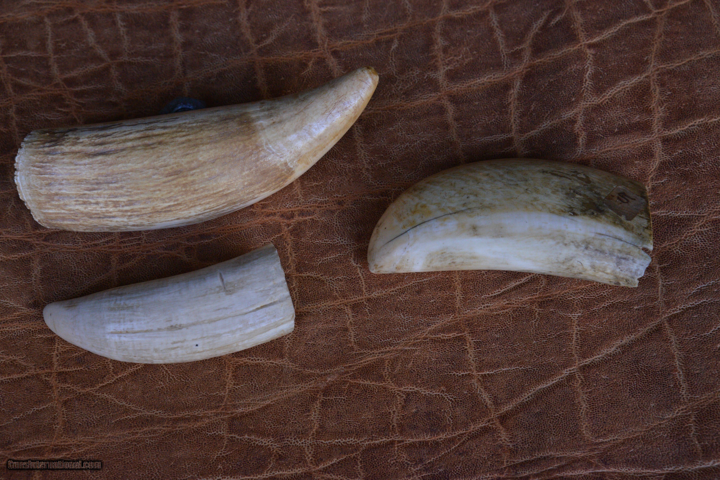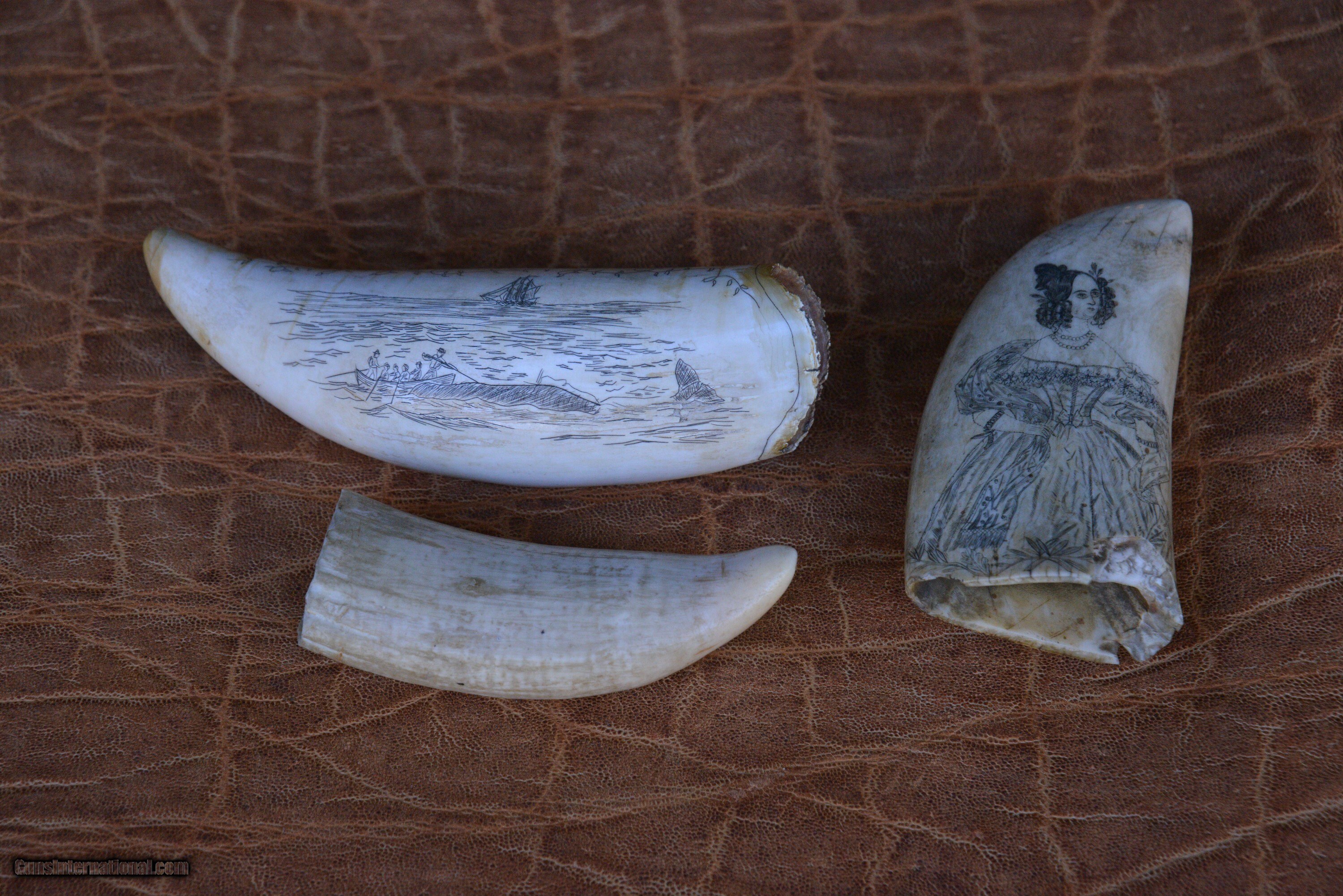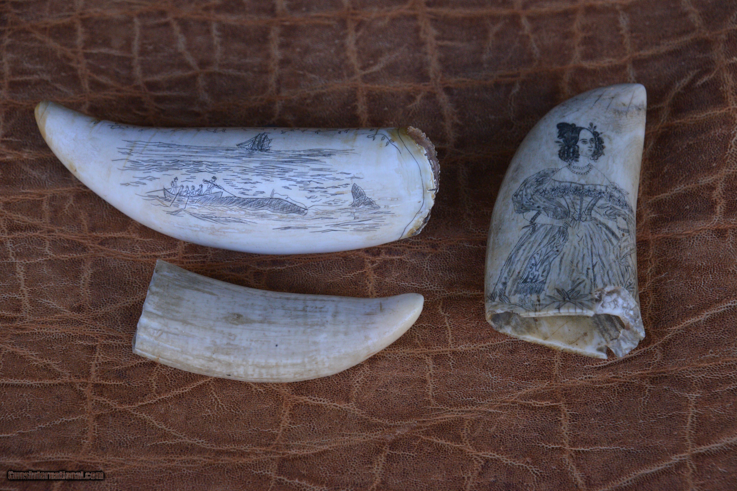 3 antique Whale Teeth, two are engraved one is not engraved.
