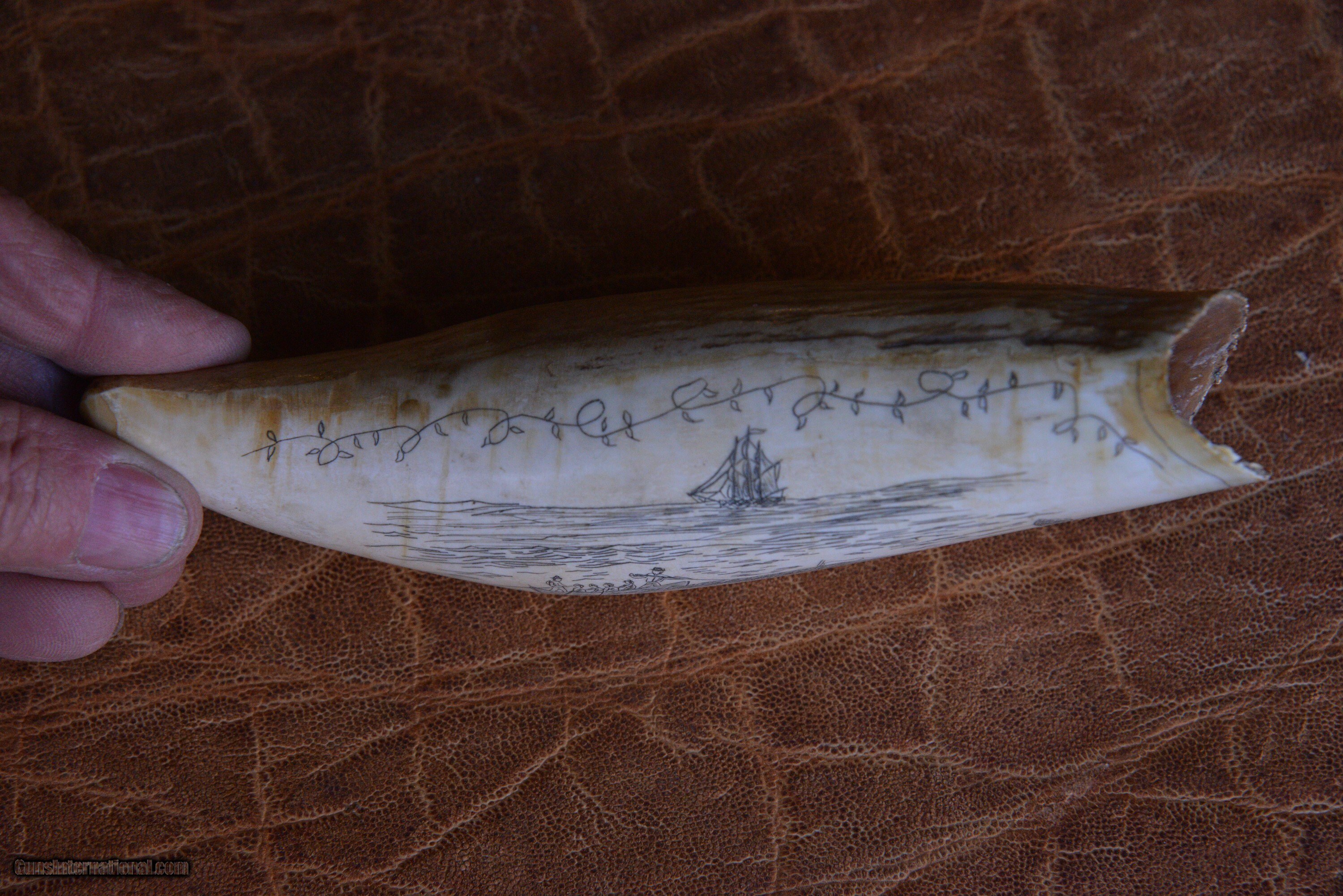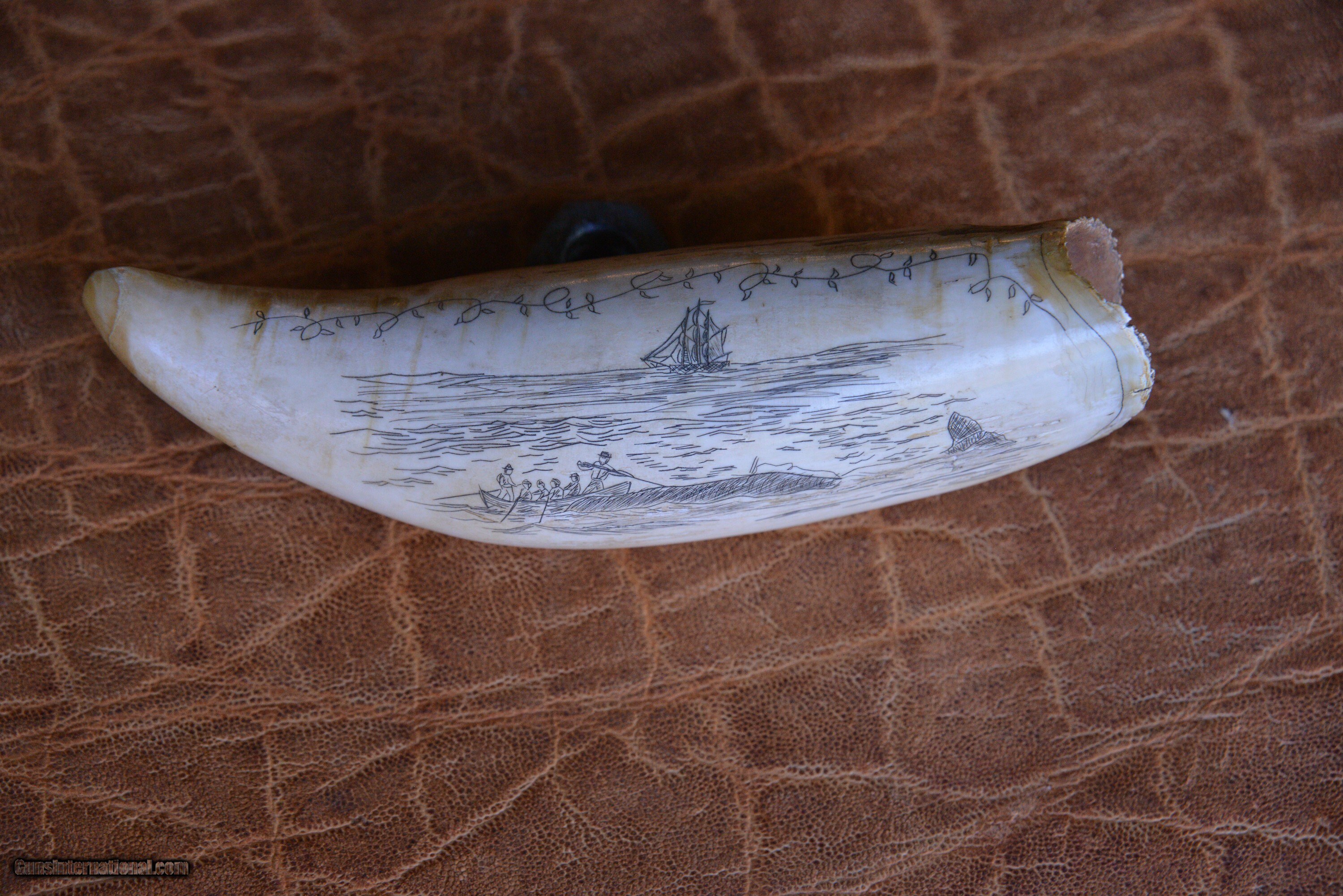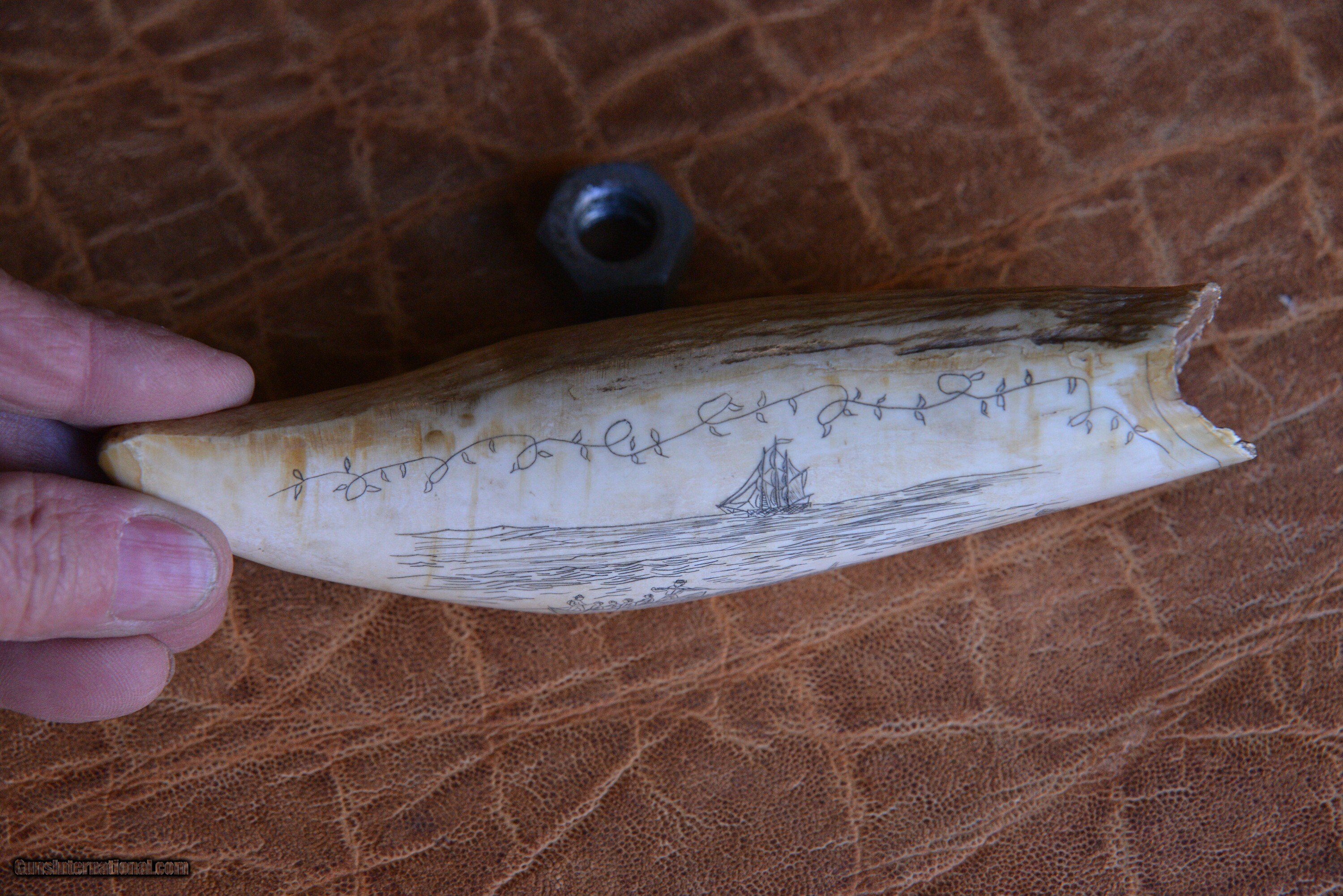 Description: 3 antique Whale Teeth, two are engraved (see photos) one is not. lengths are: 7", 5 1/4", 4 1/4 Price: $1,600.00 Contact Seller |
