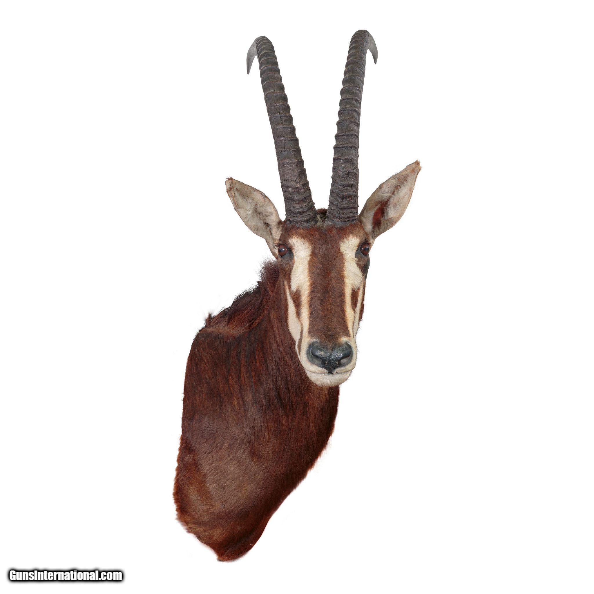 Description: Sable with 39" horns. 60" top to bottom, 30" across, protrudes 24". Horns come off for shipping. Harvested in Africa around 2010. SOLD |