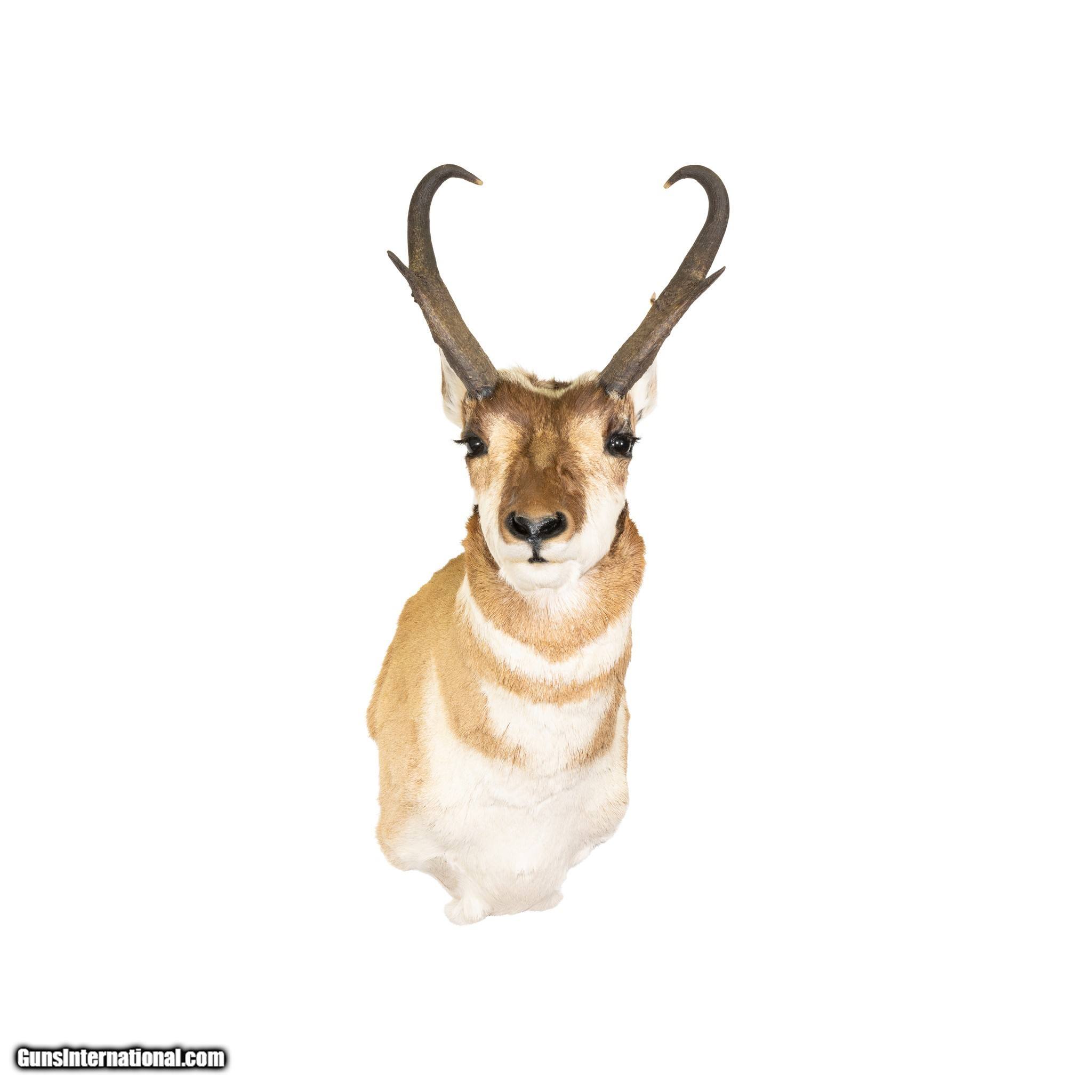 Description: Wyoming trophy antelope with thick 13" horns having curved tips. 34"H, 15"W, protrudes 20". Circa 2000. SOLD |