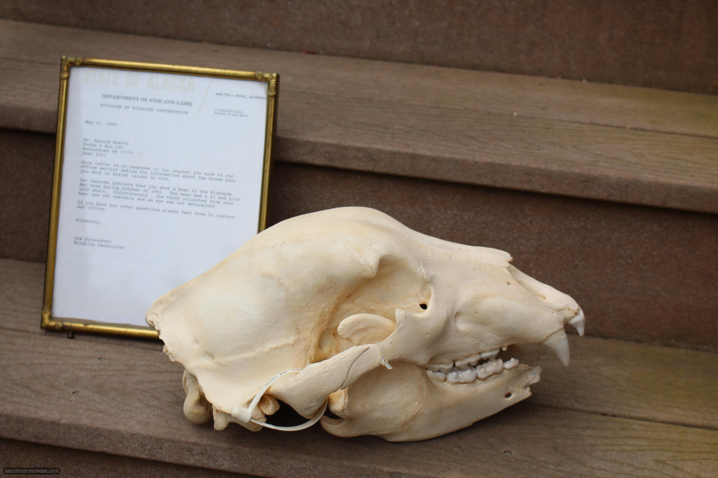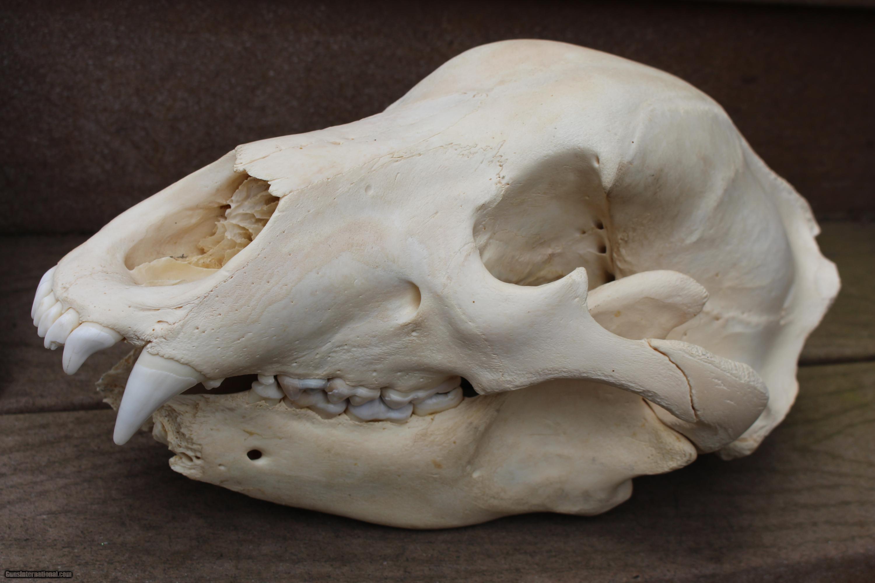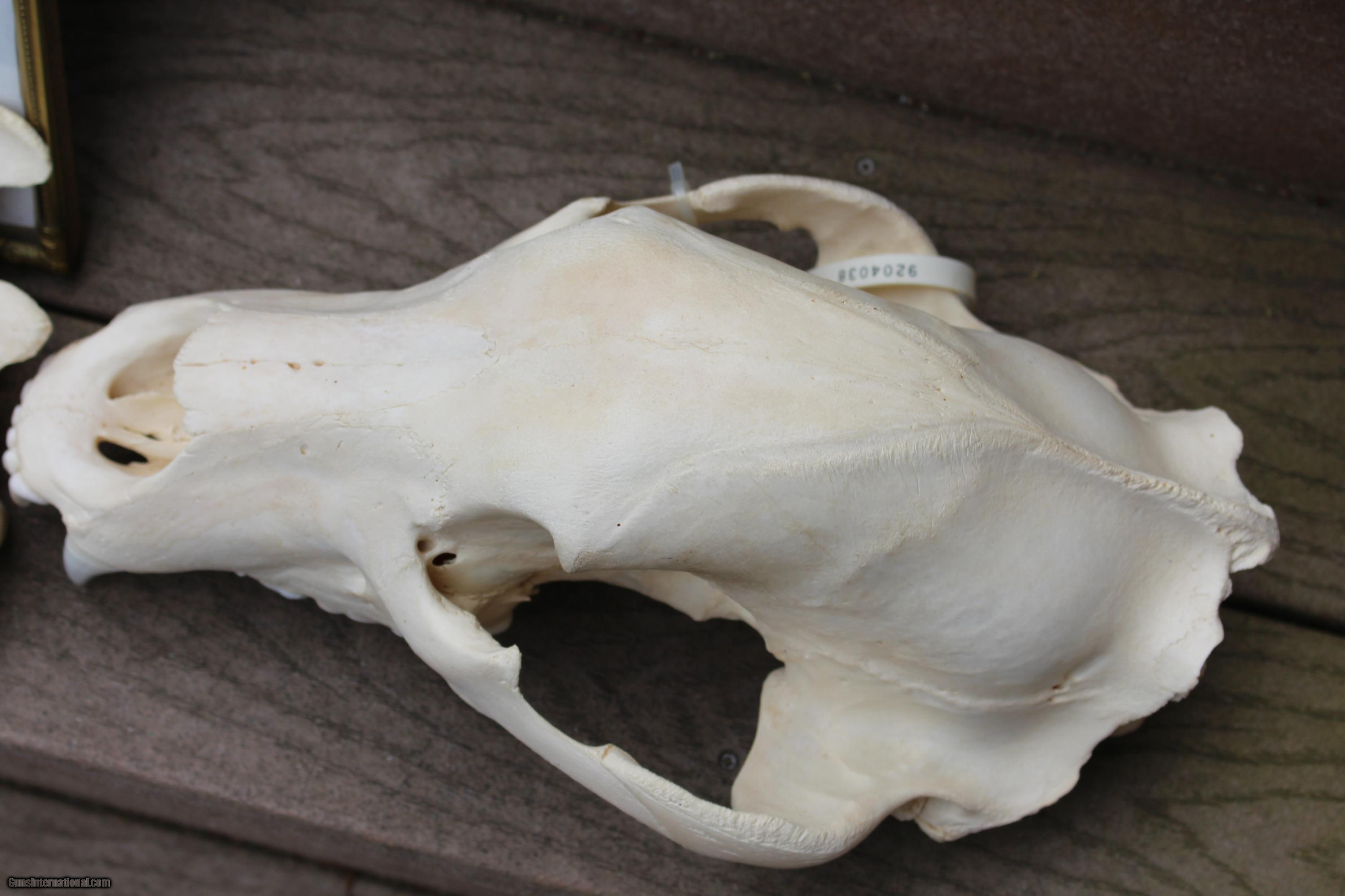 Description: Original Grizzly Bear Skull taken in Alaska with original paper work from Alaska Fish and Game.Here is a picture of the Grizzly. Bear was shot in lower jaw as he was coming at hunter. That's why front part of jaw bone is missing. I spoke to the son of the man who shot this bear. The bear is in one of the record books? Taken in Brooks Region. SOLD |