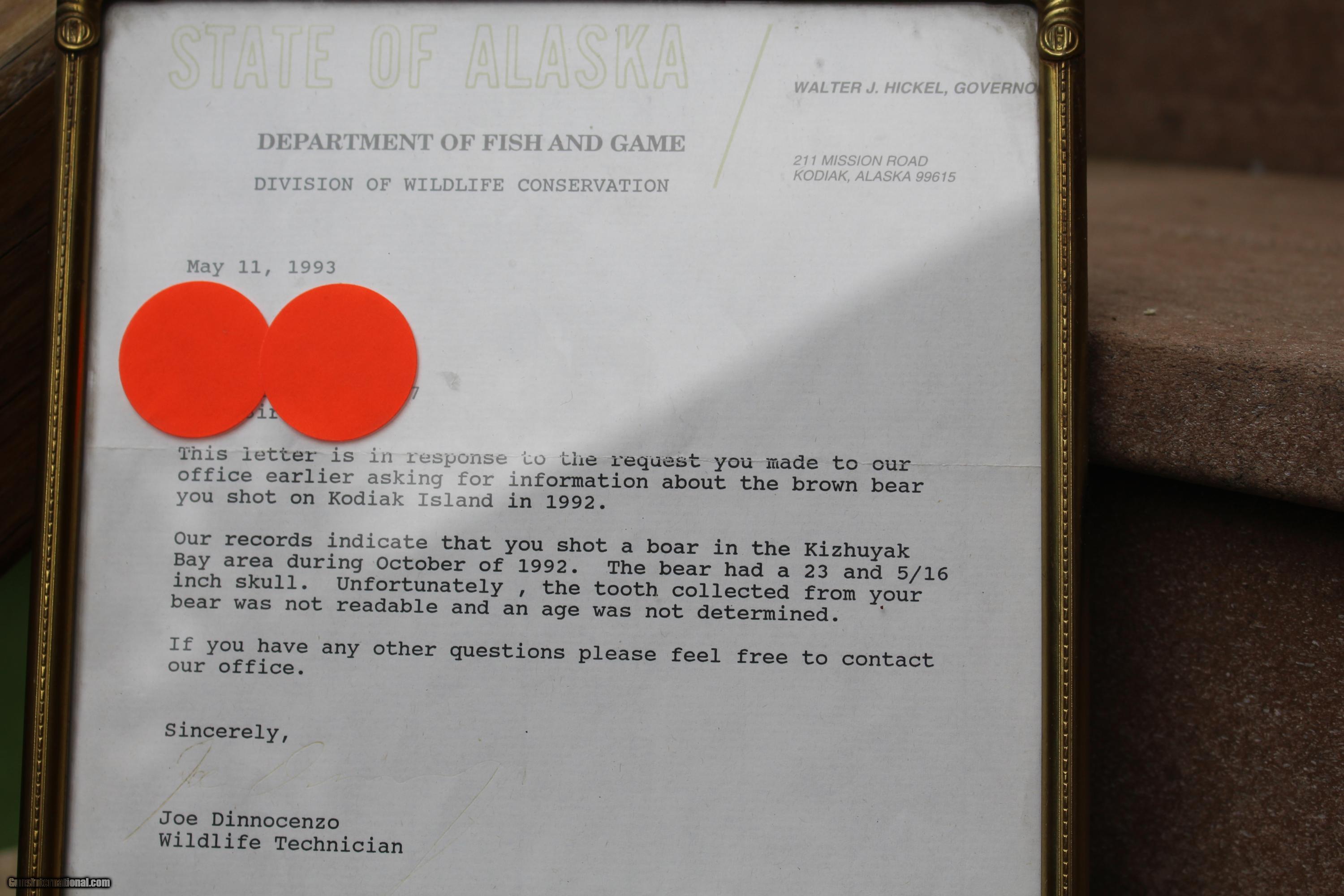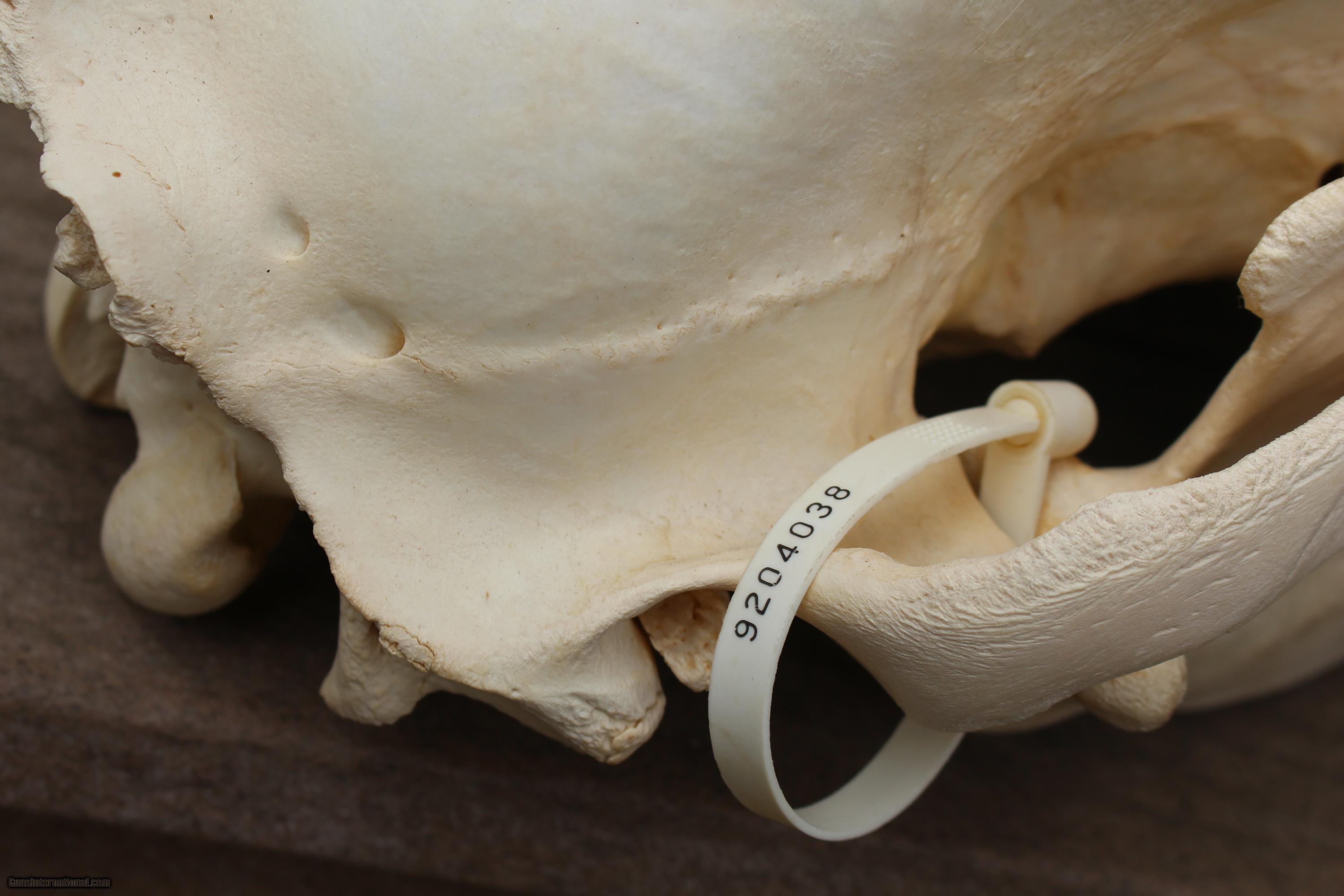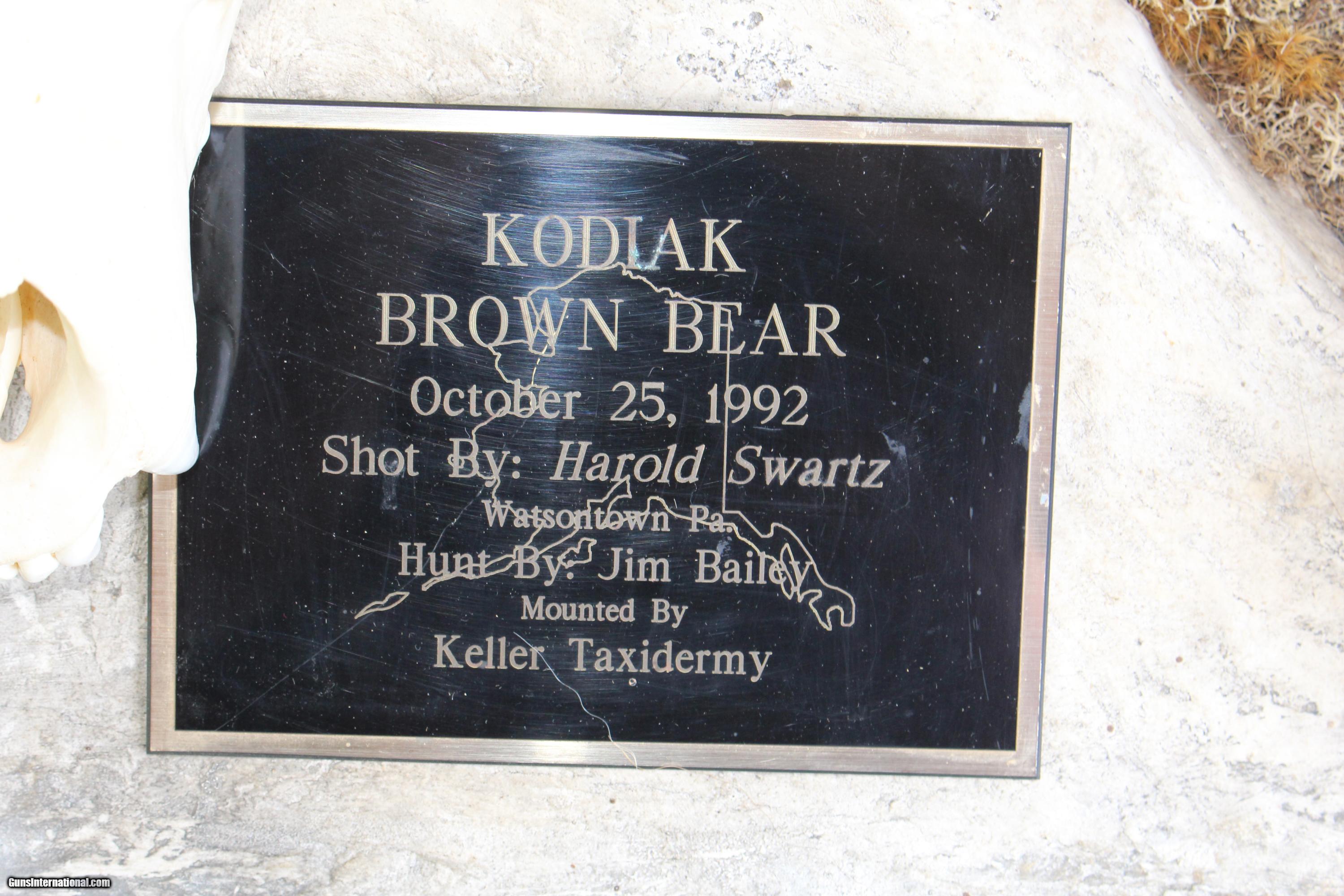 Description: Original Grizzly Bear Skull taken in Alaska with original paper work from Alaska Fish and Game.Here is a picture of the Grizzly. Bear was shot in lower jaw as he was coming at hunter. That's why front part of jaw bone is missing. I spoke to the son of the man who shot this bear. The bear is in one of the record books? Taken in Brooks Region. SOLD |