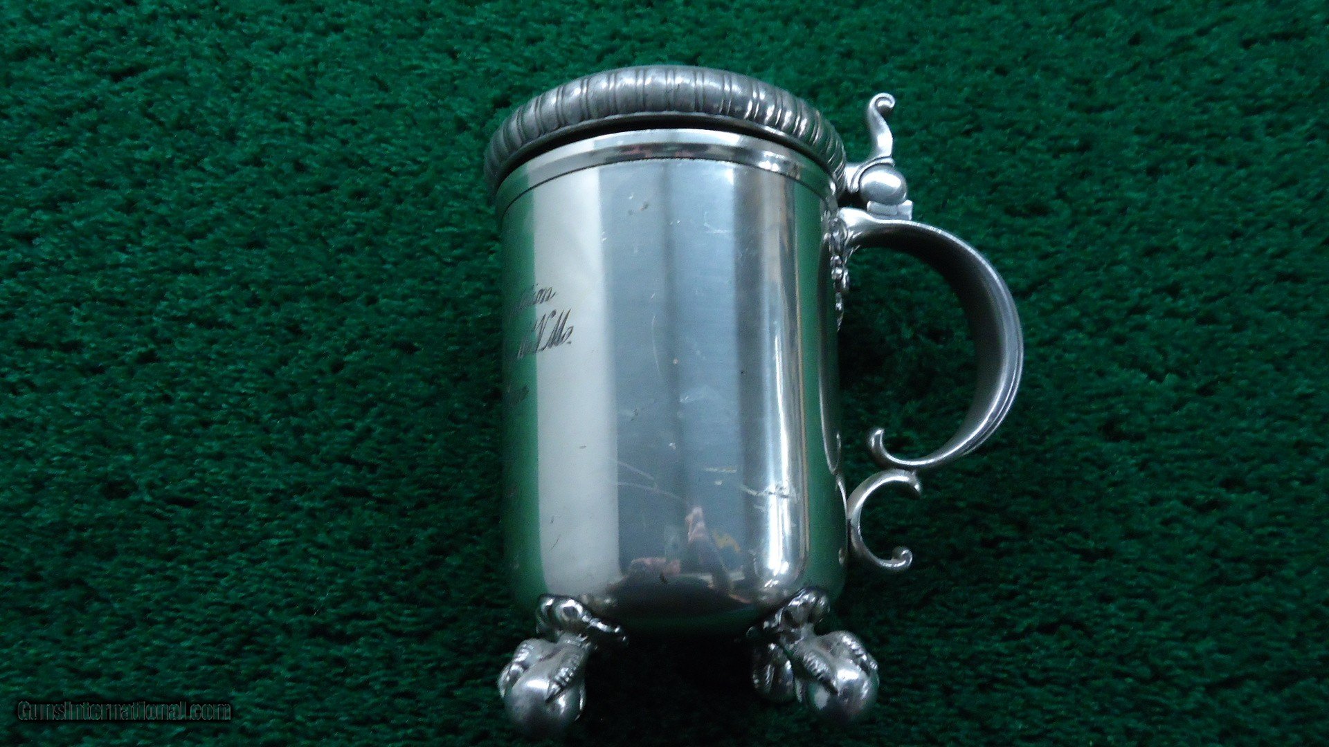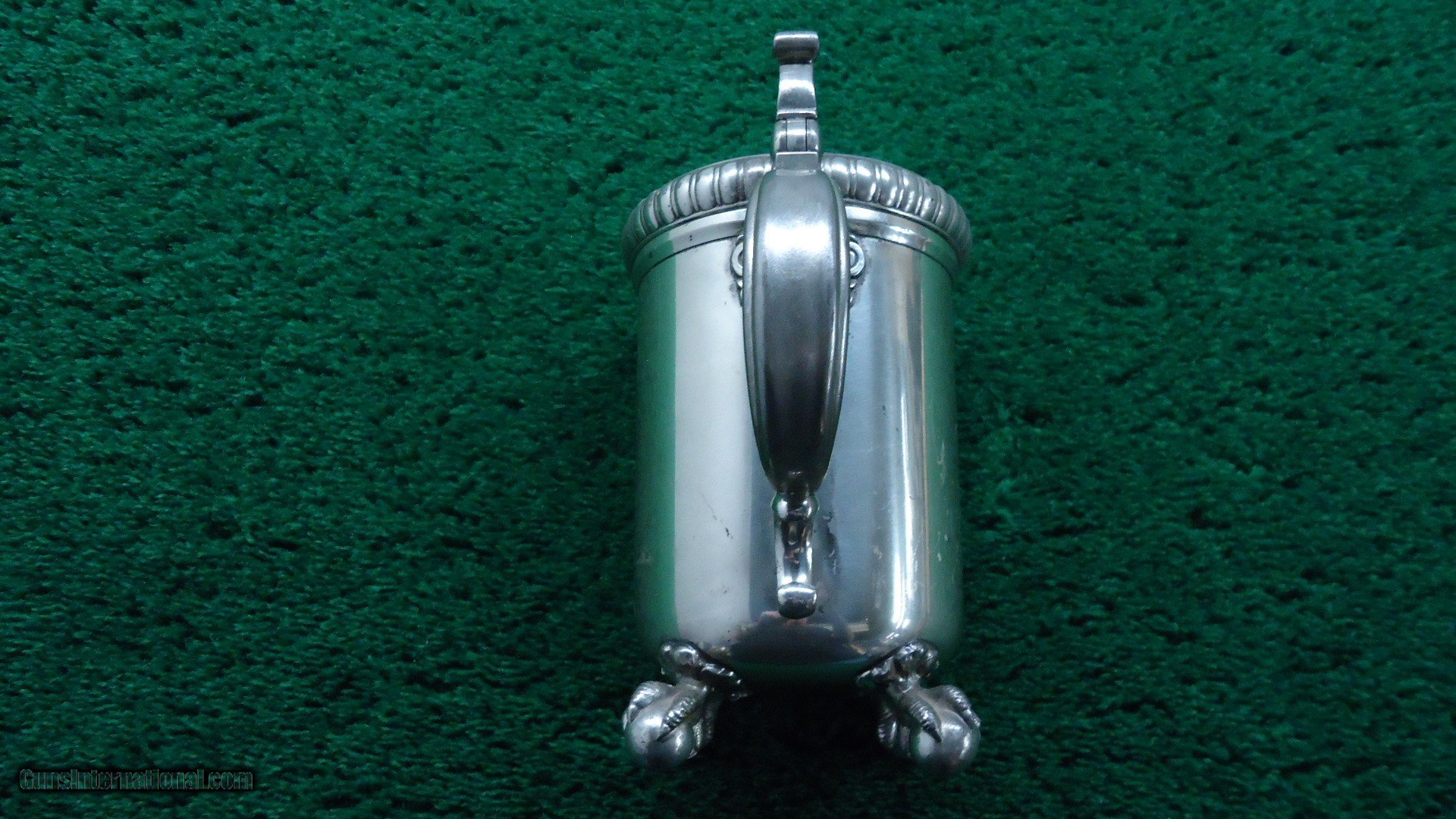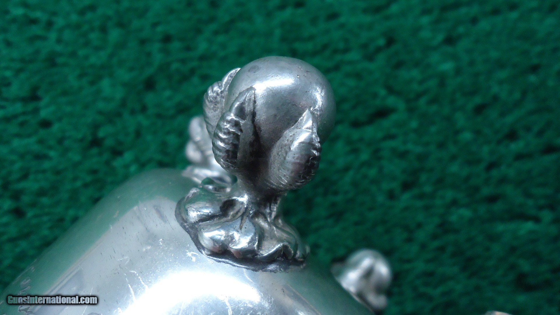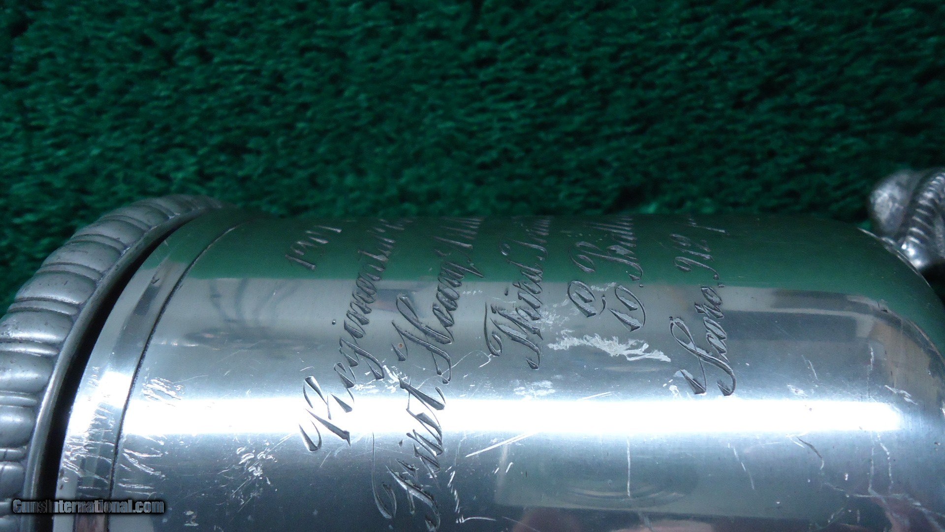 Description: Marked "1901 Regimental Competition First Heavy Artillery MVM 3rd Team Prize B Battery 912 Points". Mug holds about a quart. Stands about 7 inches high. Nickel platted and retains most nickel. Nice looking outfit. Leroy Merz Antique Firearms specializes in antique and vintage Winchesters and other fine American firearms. Since 1965 Mr. Merz has taken part in the world of firearms and has been a contributor to many well known reference books. Just recently we mailed the 129th edition of our privately-published catalog. We have hundreds of additional guns in every price range at our home online. Search for Merz Antiques in google. SOLD |