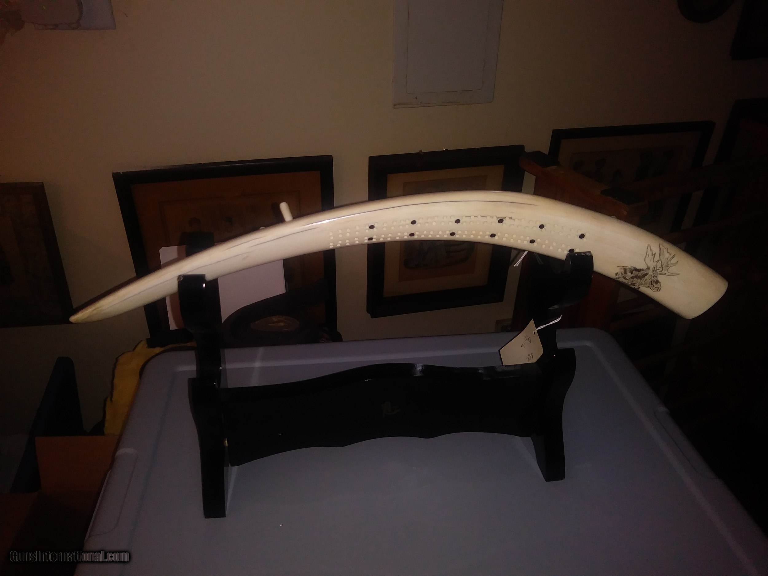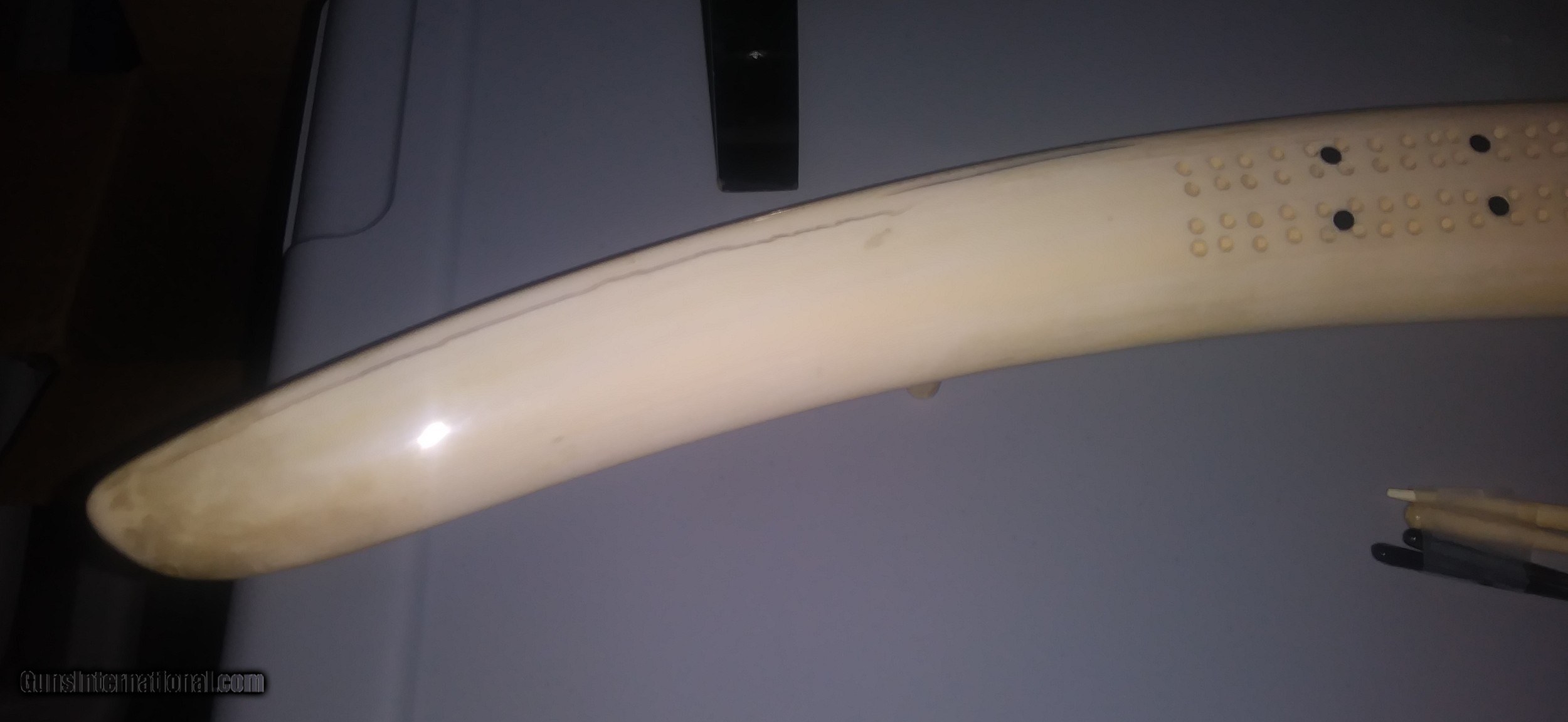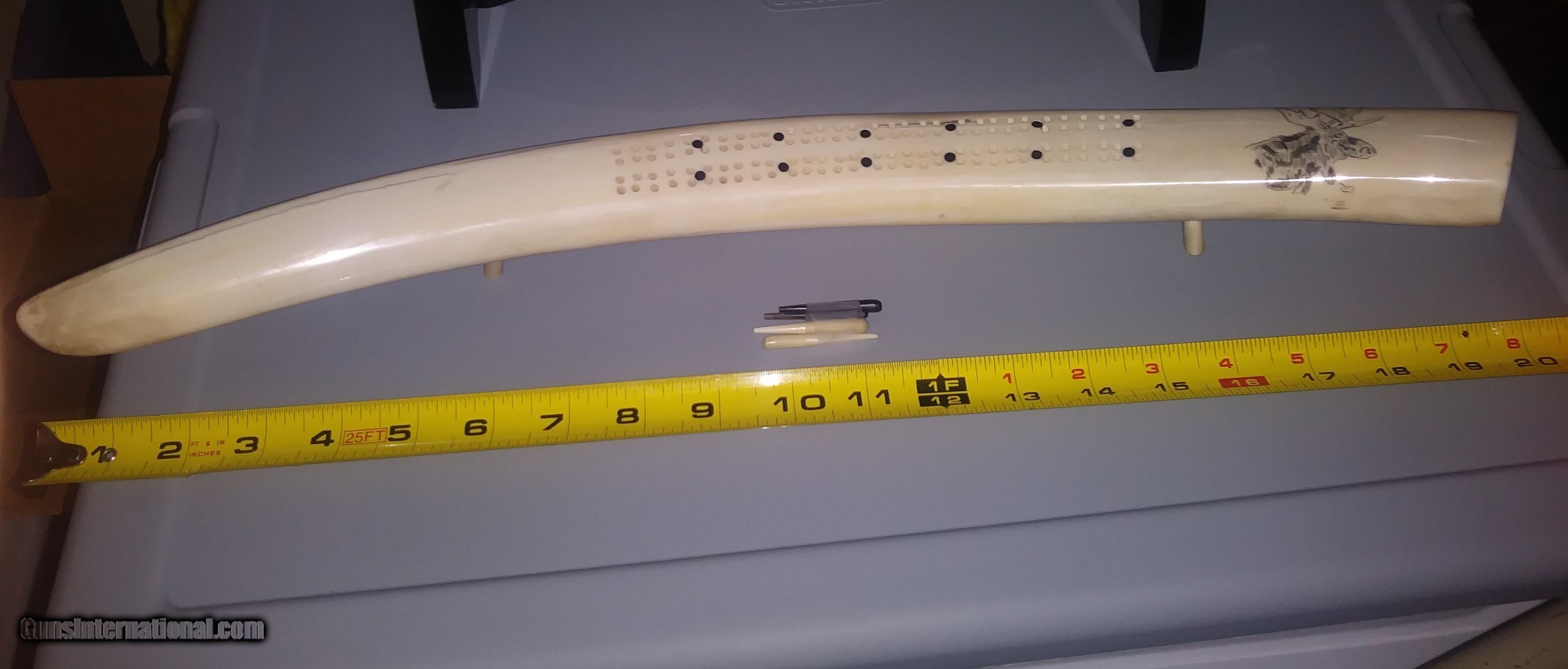 Description: .This ia a huge chunk of Ivory.....This is an awesome piece from my collection. Full Walrus tusk with Scrimshaw Moose and game board. This measures 20 inches and is heavy and no issues. Could be shown in a rack as I have done or sitting down. Has peg to support. Has original pegs for the game. Large end is open. This is not faux anything. Real deal from Alaska and artist signed under moose. Pictures are description. No issues. Natural aging and light cracking which is normal. email any questions. Might consider trade in of adecent Mini 14 ranch rifle 5.56 / 223 with wood stock. personal checks must clear. footnote: If you are a carver or scrimshaw artist or knife maker you have an 8 inch section from the tip for your work. Please check Check my other s. SOLD |