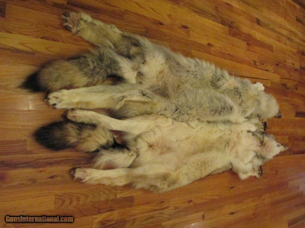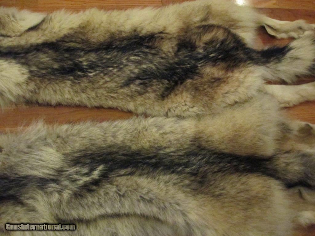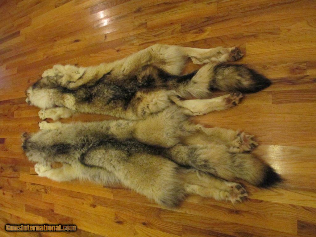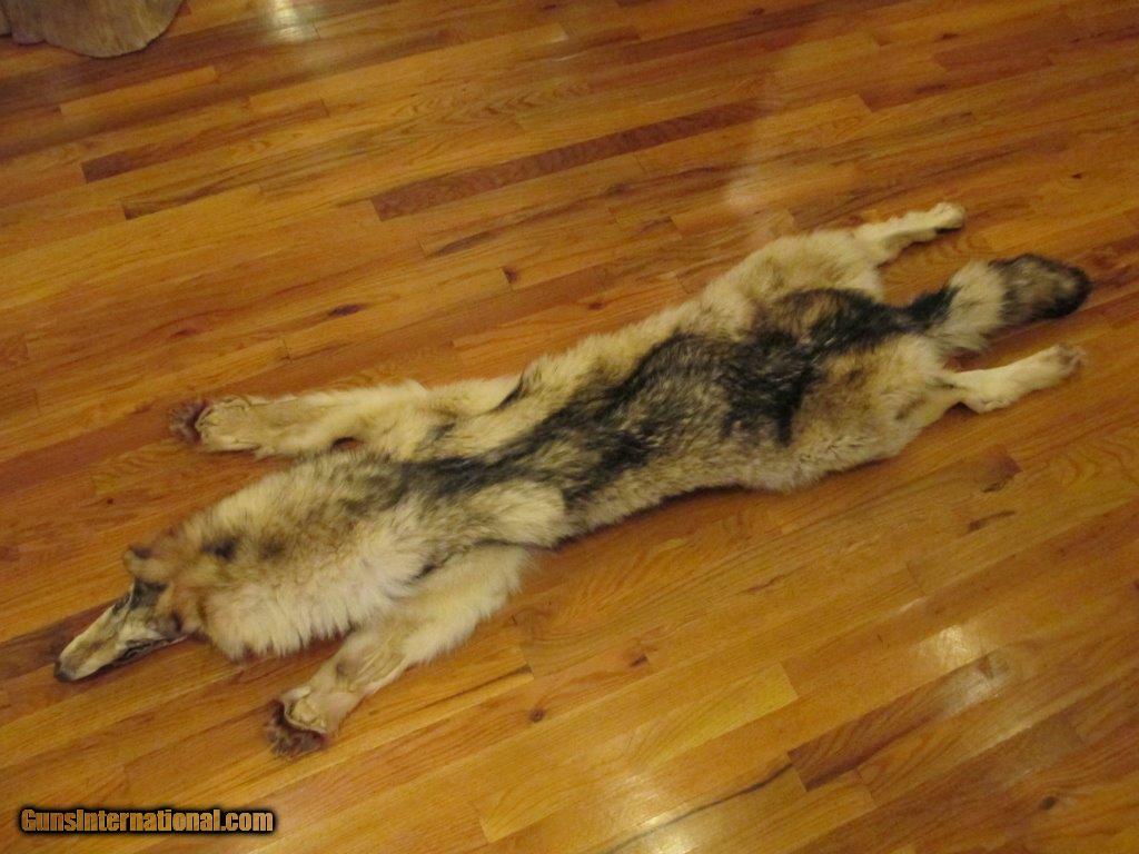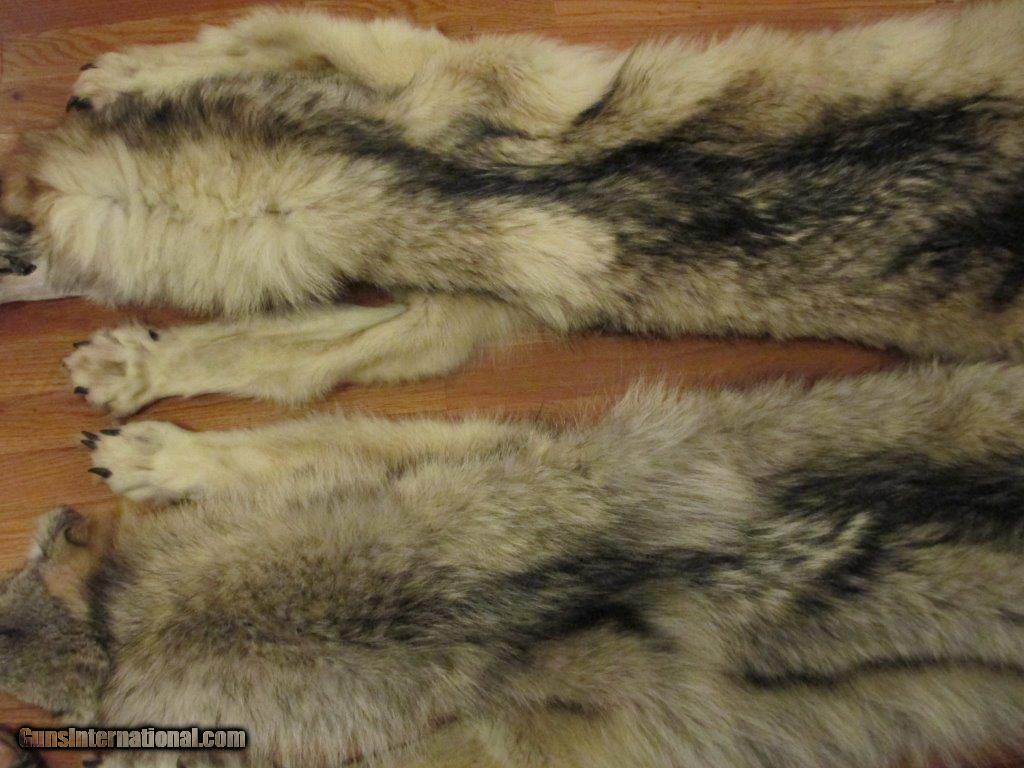 Description: Canadian Timber Wolf, prime conditon, 75" length, tanned in British Columbia, eyes, ears, nose, mouth & feet turned, excellant condition. Case cut and ready for full mounting or cut for rug mount. Two available at 1150 each. SOLD |
