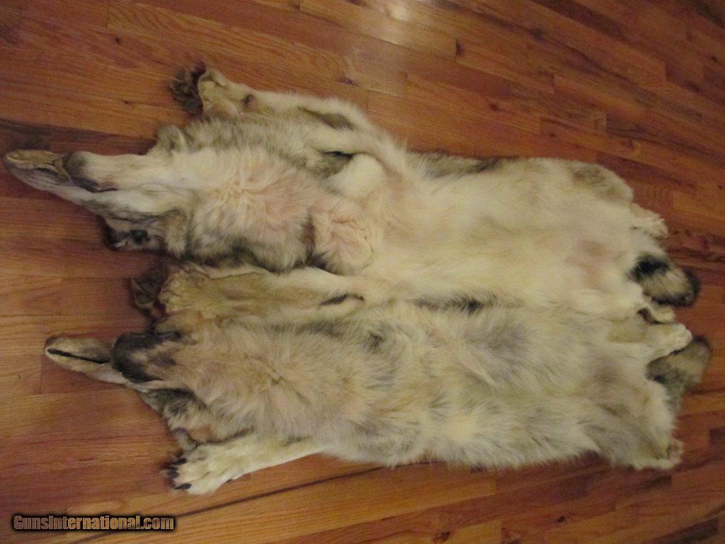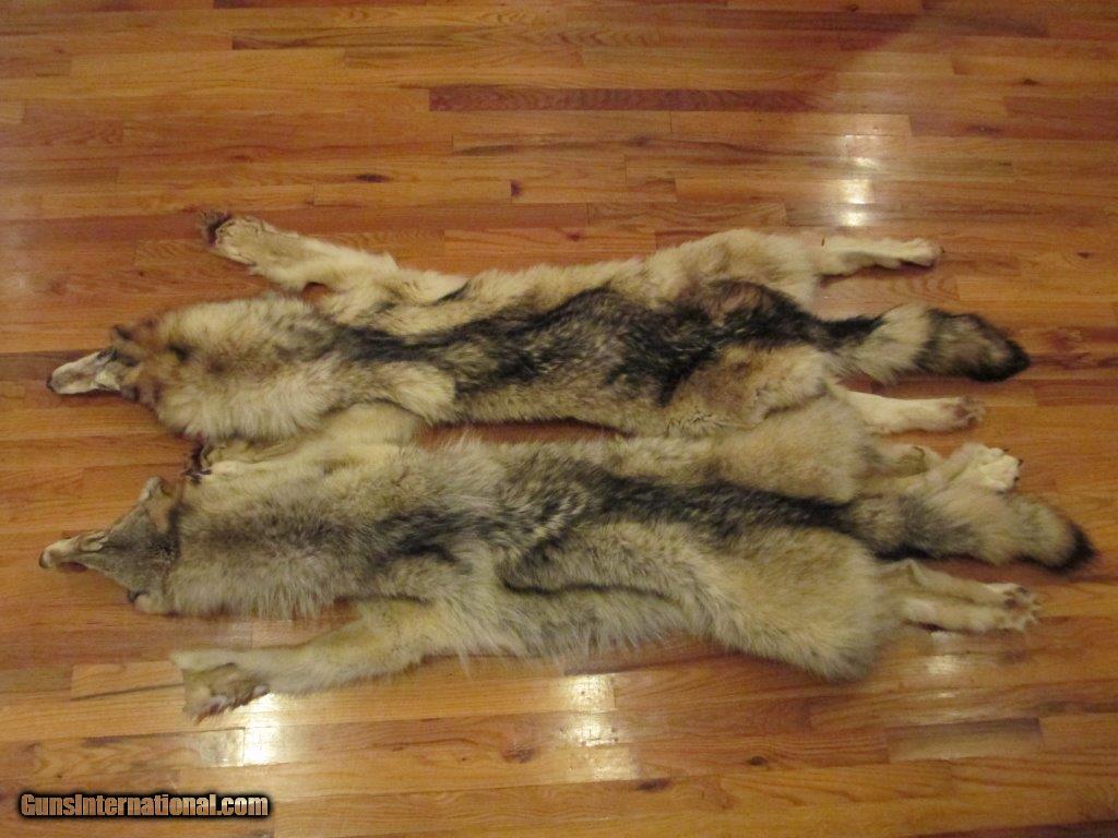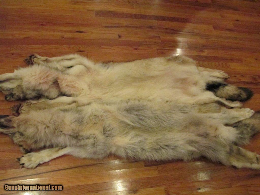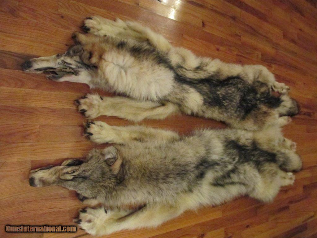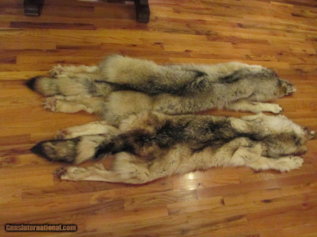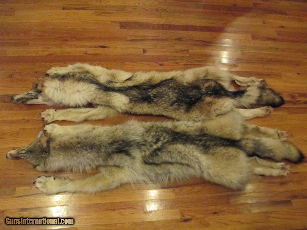 Description: Canadian Timber Wolf, prime conditon, 75" length, tanned in British Columbia, eyes, ears, nose, mouth & feet turned, excellant condition. Case cut and ready for full mounting or cut for rug mount. Two available at 1150 each. SOLD |