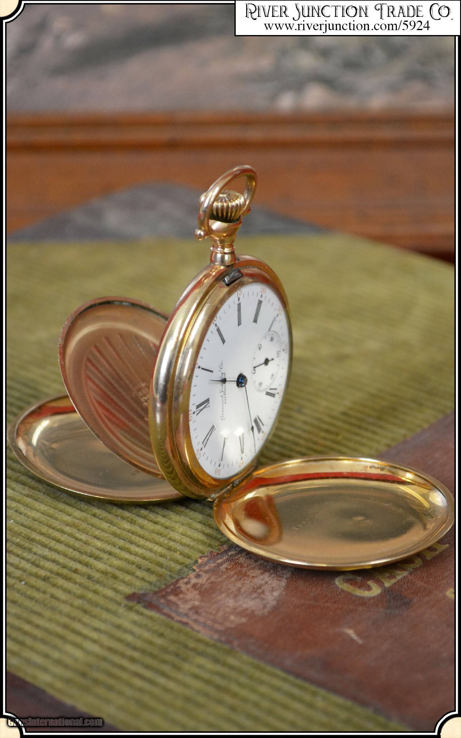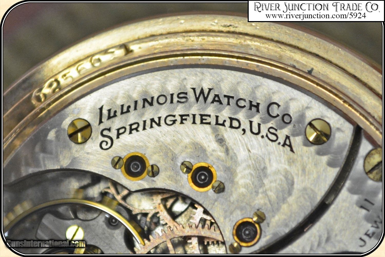 Description: You are viewing a very fine quality Antique gold hunting case pocket watch. The case measures 2" in diameter. The cover is numbered: 6256661, and all the covers have this matching number. The inner cover is marked "WARRANTED B&B ROYAL 20 YEARS". The porcelain dial reads: Crescent Jewelry Co. Pittsburg. The dial is in fine condition. The GOLD FILLED case has fancy engraving with highlights. There are no monograms. The movement is marked: Illinois Watch Co. Springfield U.S.A. The movement serial number: 2650929 indicates a date of manufacture of 1914. The movement is marked 11 jewel and is spotlessly clean. The case is in immaculate condition. The watch is stem set and wound. The watch winds, sets, runs and keeps time. Payment: Item, can be ordered on line with a credit card or paypal on our sight. Just Google (riverjunction) and type in the River Junction Trade Co. item number (5924) in the search box. Before you checkout you will see shipping cost and total. OR If you prefer: Pay by cash, postal money order, cashiers check, personal & business checks. We wait for checks to clear. We always answer questions and entertain offers. Have questions? Call me 563-880-4588. Jim SOLD |