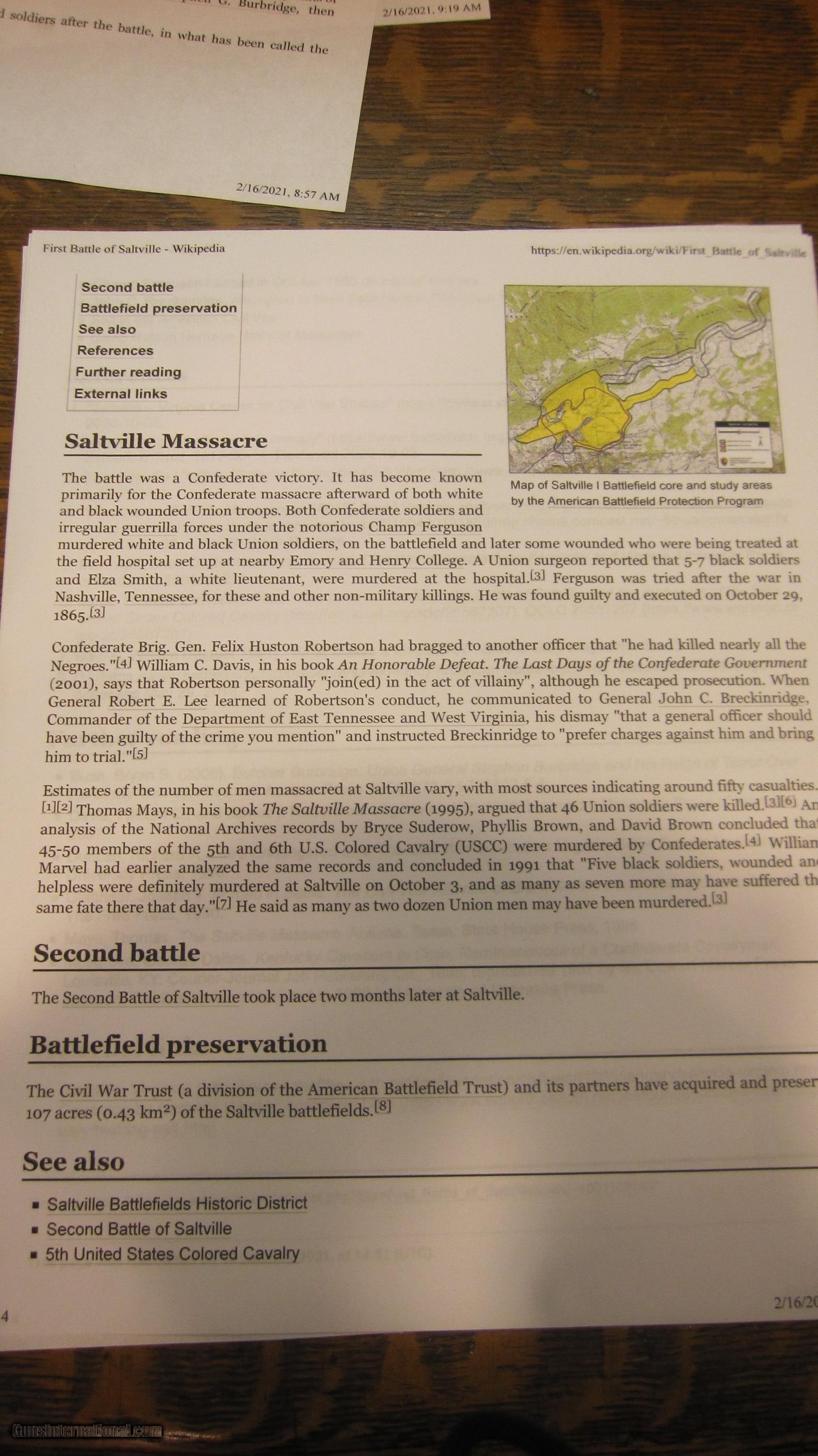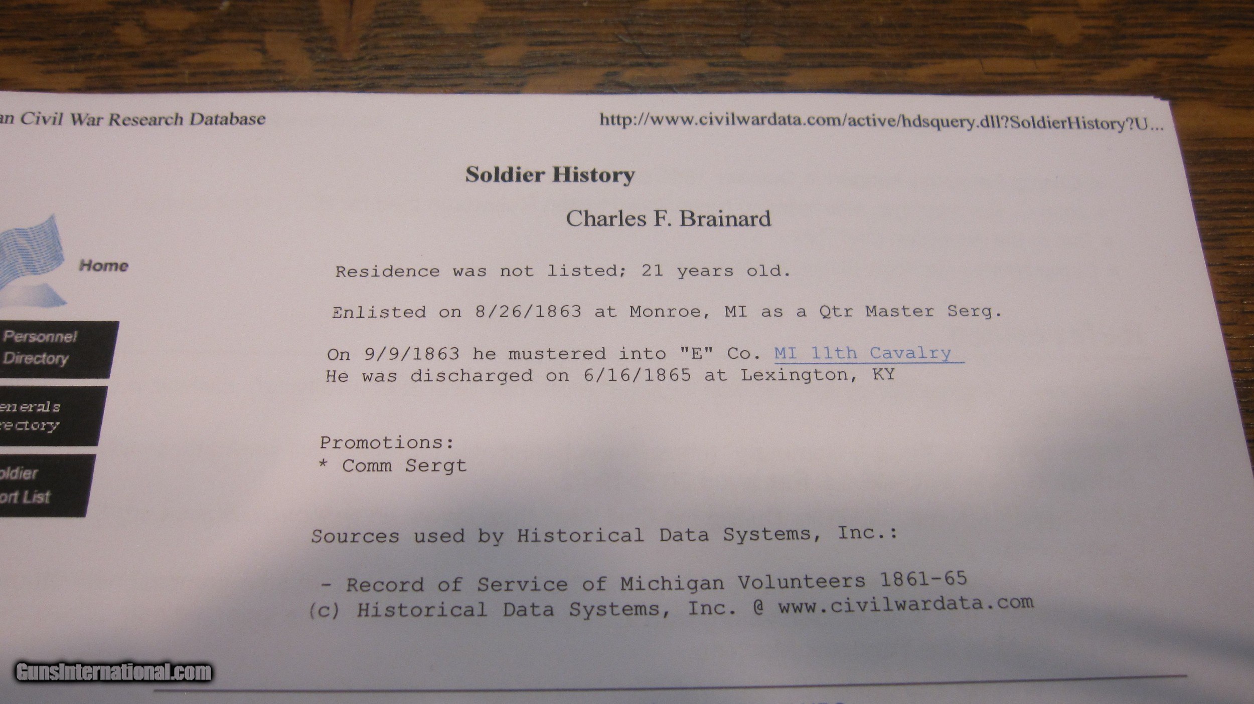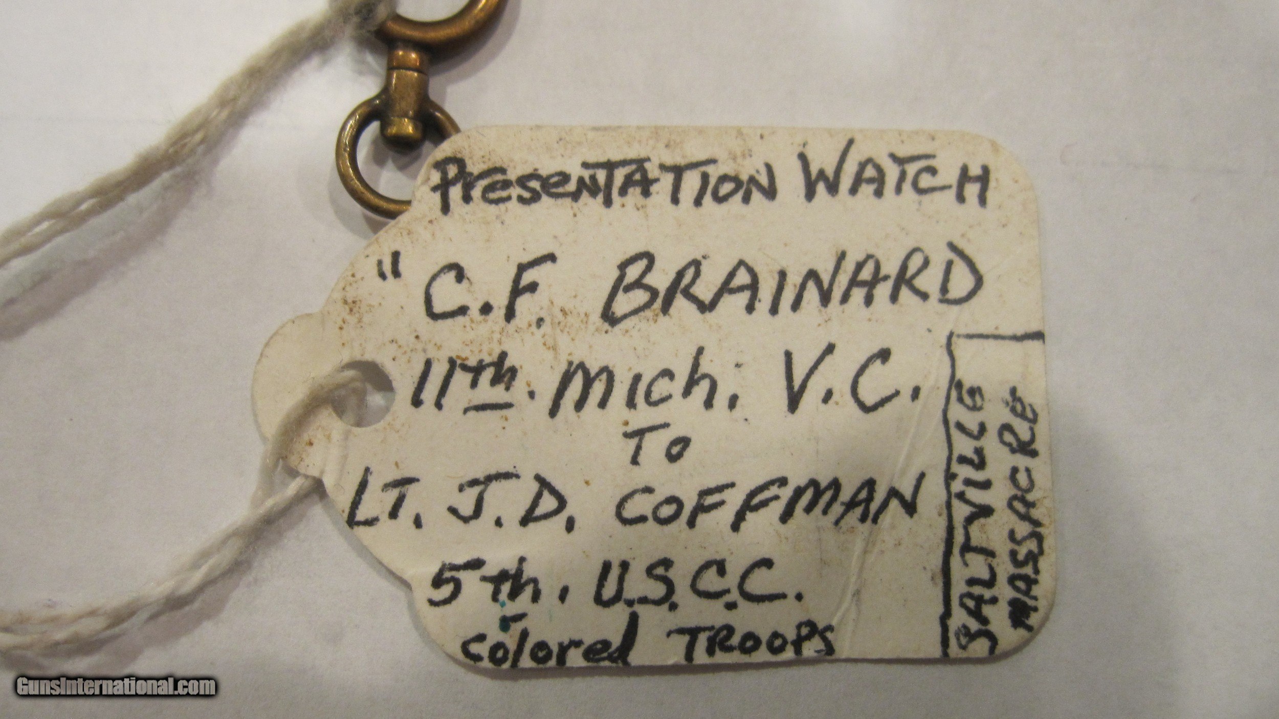 Description: Fantastic Civil war Inscribed Silver Pocket Watch. Inscribe from Quarter Master Serg. Charles F. Brainard of the 11th Michigan Cavalry to Lieut. James D. Coffman of the 5th U.S. Colored Cavalry. The watch was made in the summer of 1864 by the serial No. of121082. It was made by Wm. Ellery. It was cased by S&J.M with a serial No. of 1336. Watch is currently not working. Second hand is detached. I haven't tried to find an individual to repair the watch. I'm sure it's not that hard to do. This watch just out of an ancient collection. Inscribed Civil War watches are fairly rare, But have you ever seen anything inscribed to The U.S. COLORED CAVALRY!? COLORED TROOPS ARE ONE THING, but COLORED CAVALRY? I'm sure the presentation has something to do with the Battle of Saltville on 10/2/1864 in Smyth County, Virginia. Both of these units participated in that engagement. Did Coffman save Brainard? More research to be done. Also known as the SALTVILLE MASSACRE. Confederate guerilla CHAMP FERGUSON and Confederate soldiers murdered wounded both white and black soldiers after the battle. Great Civil War history that doesn't come along to often. Definitely for the collector of Black Civil War History. Please call 973-214-3407 with questions. SOLD |