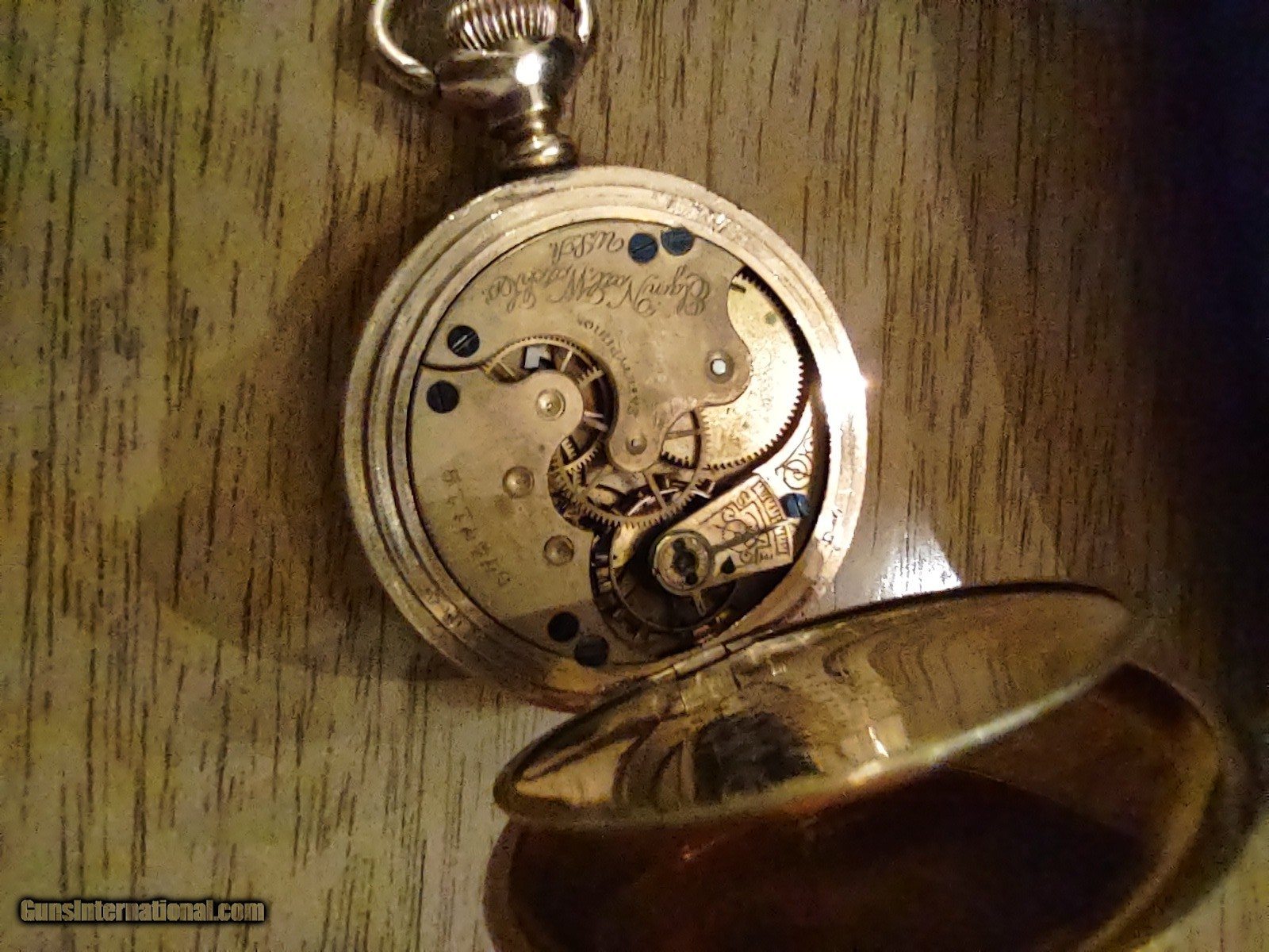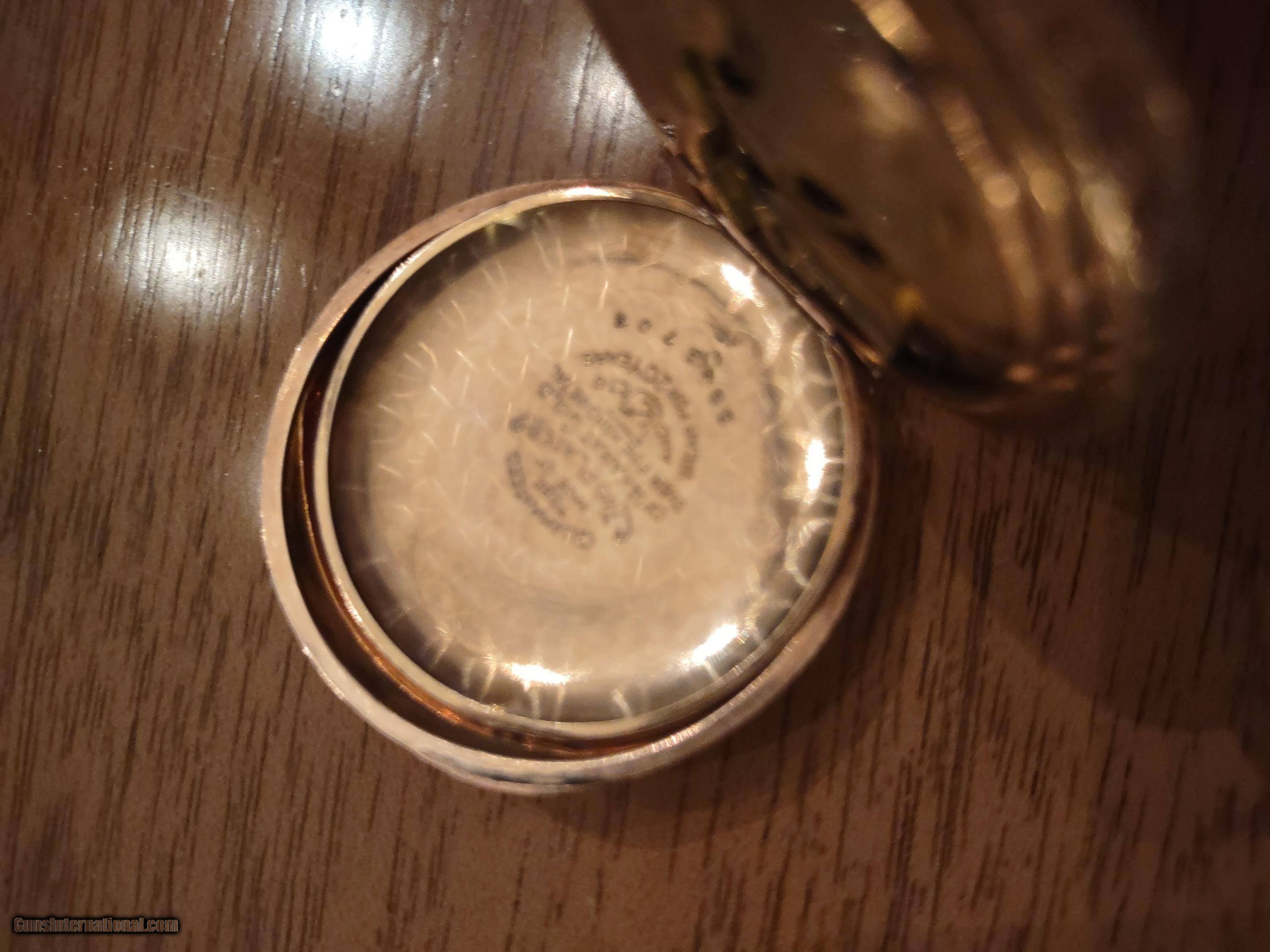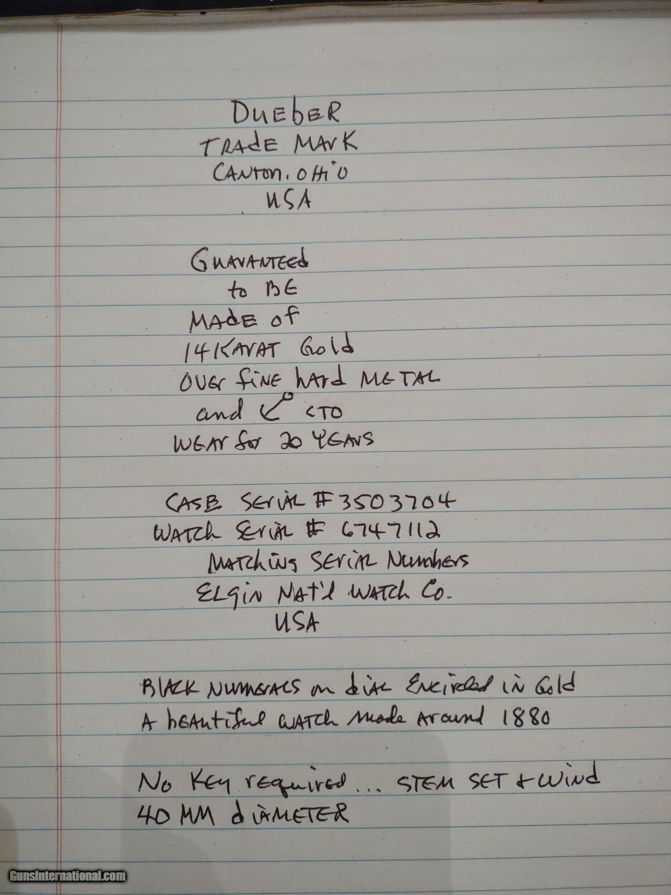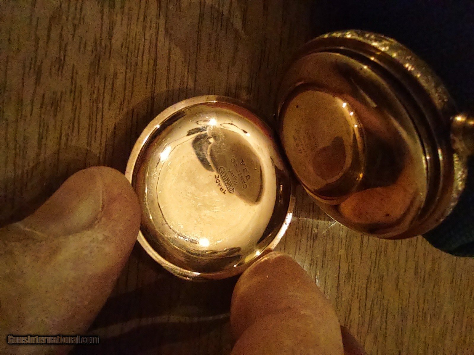 Description: ELGIN NAT'L WATCH CO., Elgin, Illinois, beautiful 14 karat gold over fine hard metal, 40MM diameter, stem wind and set, no key required, made around 1880 and in pristine condition with magnificent engraving. Five years ago this watch ran perfectly but I have recently wound it and can't get it to run. The serial numbers match: case #3503704; watch #6747112. The price is $175 with free shipping to your home or workplace. Call or text me at 318-780-4242 if you are interested. (Some of the stampings are hard to photograph so I wrote all of it down on paper so you know what it says) SOLD |