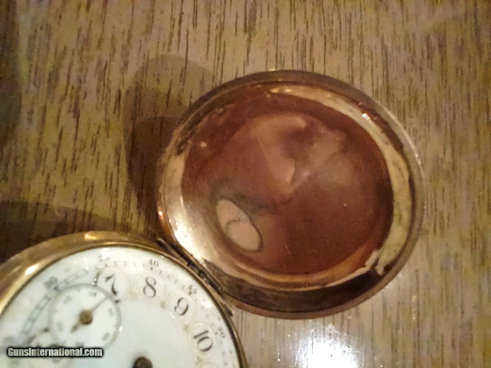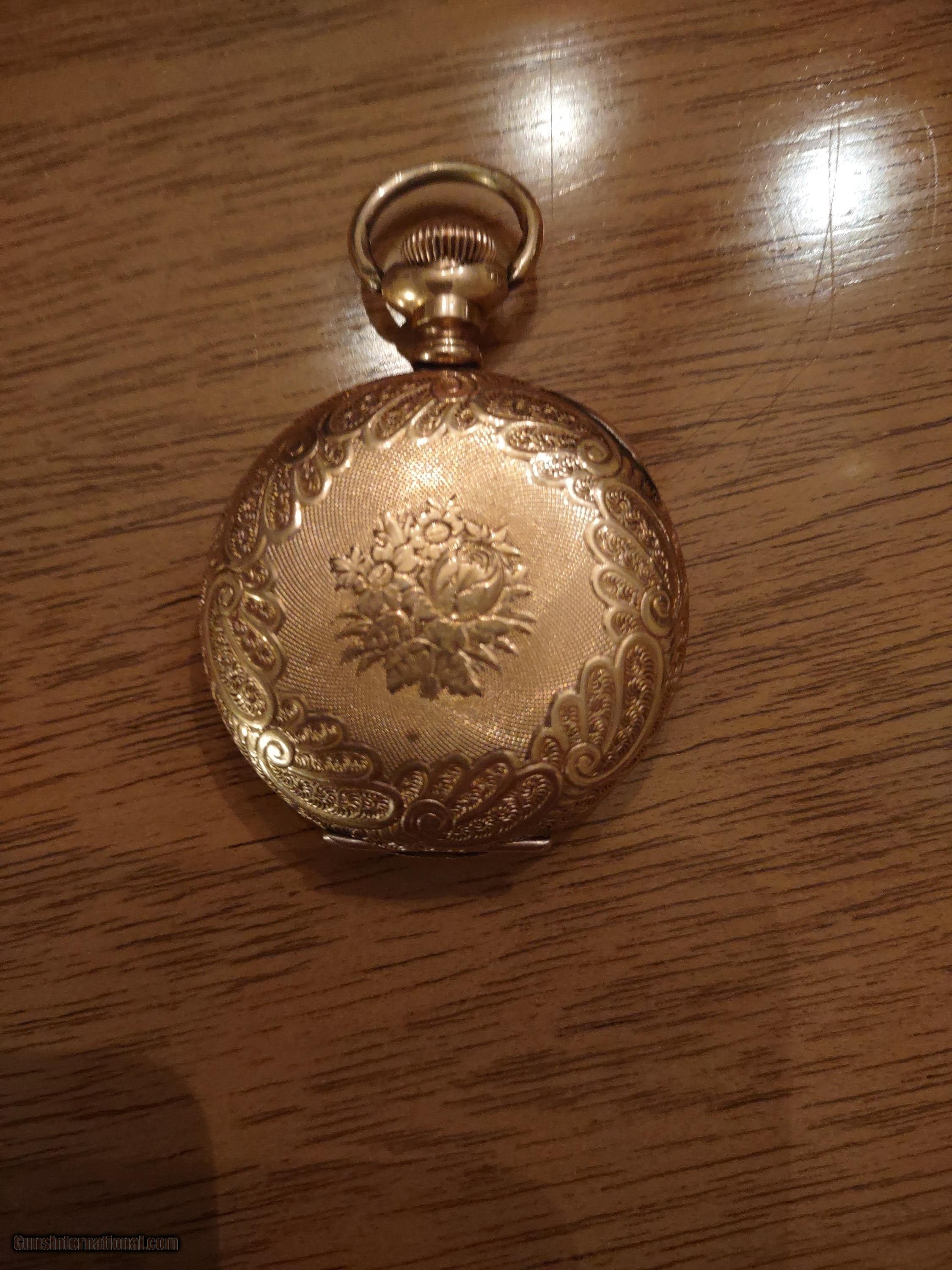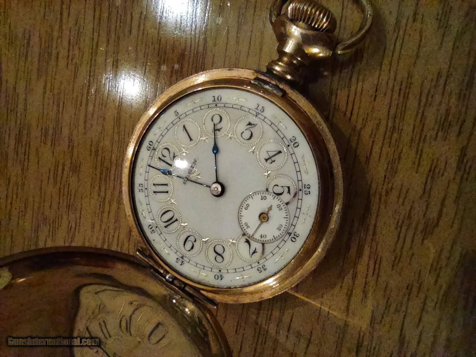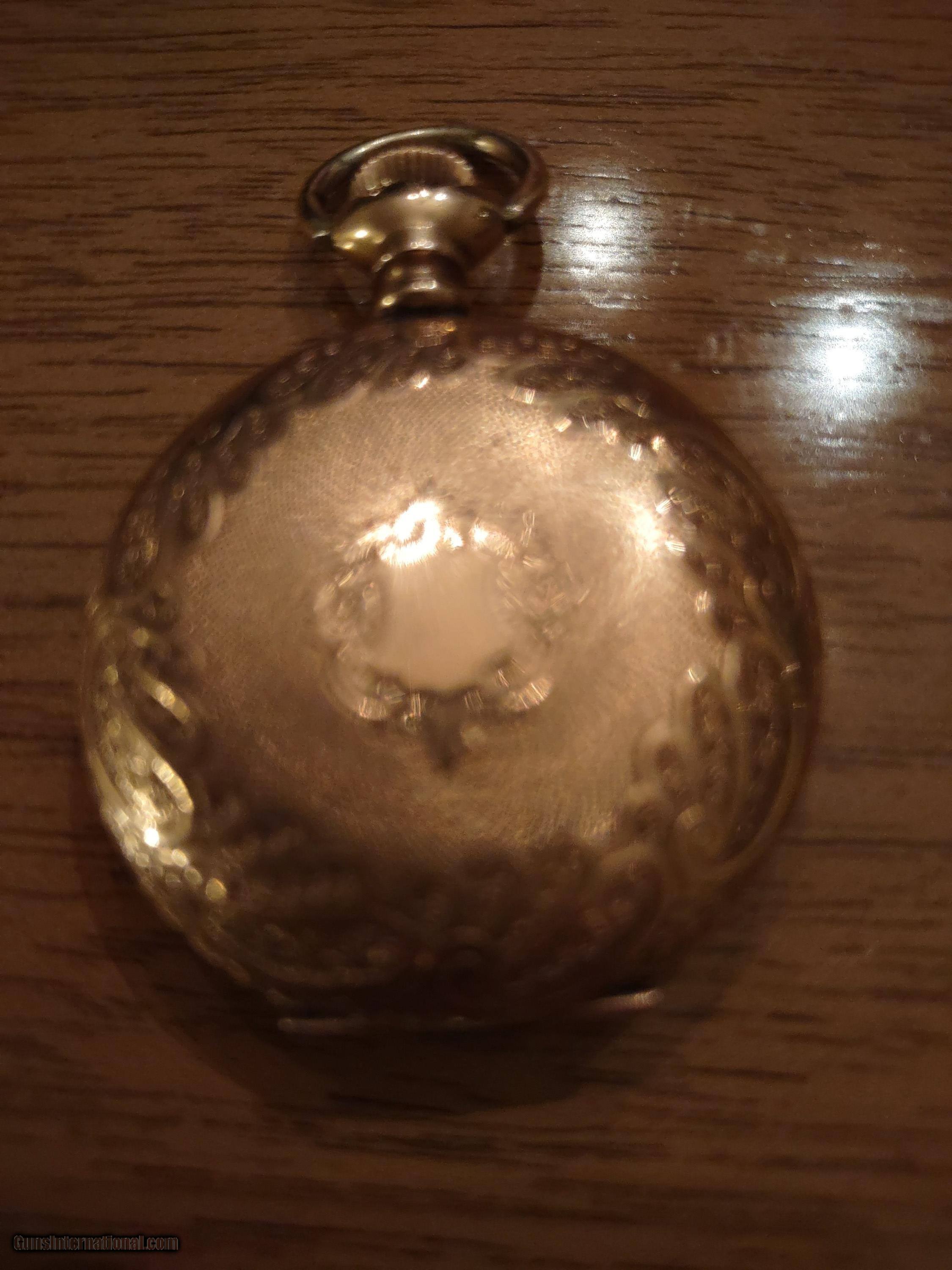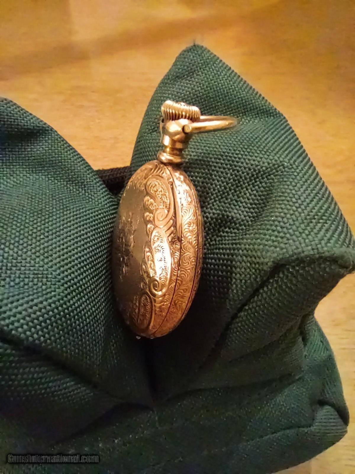 Description: ELGIN NAT'L WATCH CO., Elgin, Illinois, beautiful 14 karat gold over fine hard metal, 40MM diameter, stem wind and set, no key required, made around 1880 and in pristine condition with magnificent engraving. Five years ago this watch ran perfectly but I have recently wound it and can't get it to run. The serial numbers match: case #3503704; watch #6747112. The price is $175 with free shipping to your home or workplace. Call or text me at 318-780-4242 if you are interested. (Some of the stampings are hard to photograph so I wrote all of it down on paper so you know what it says) SOLD |
