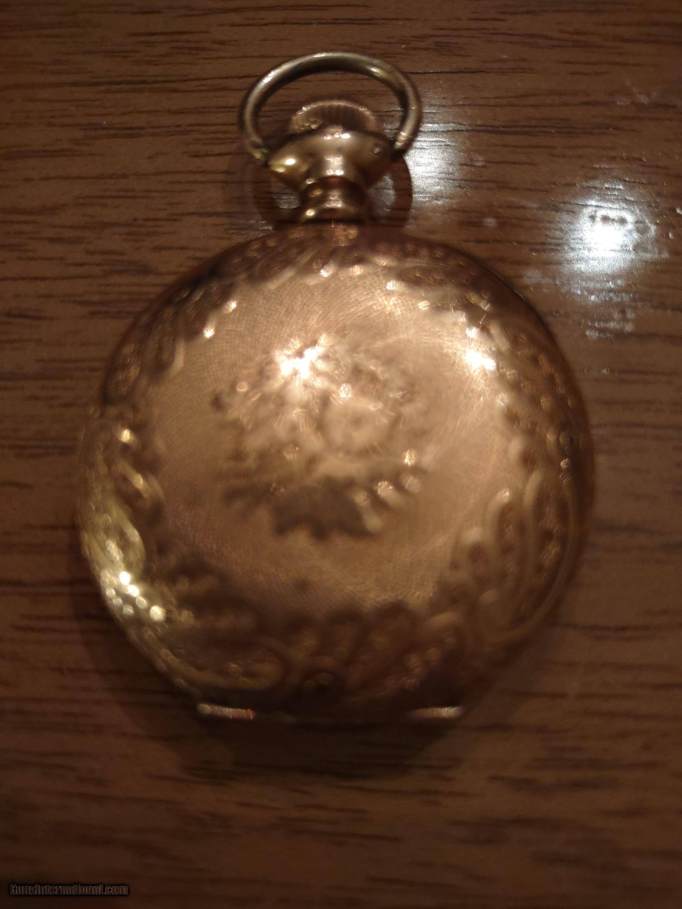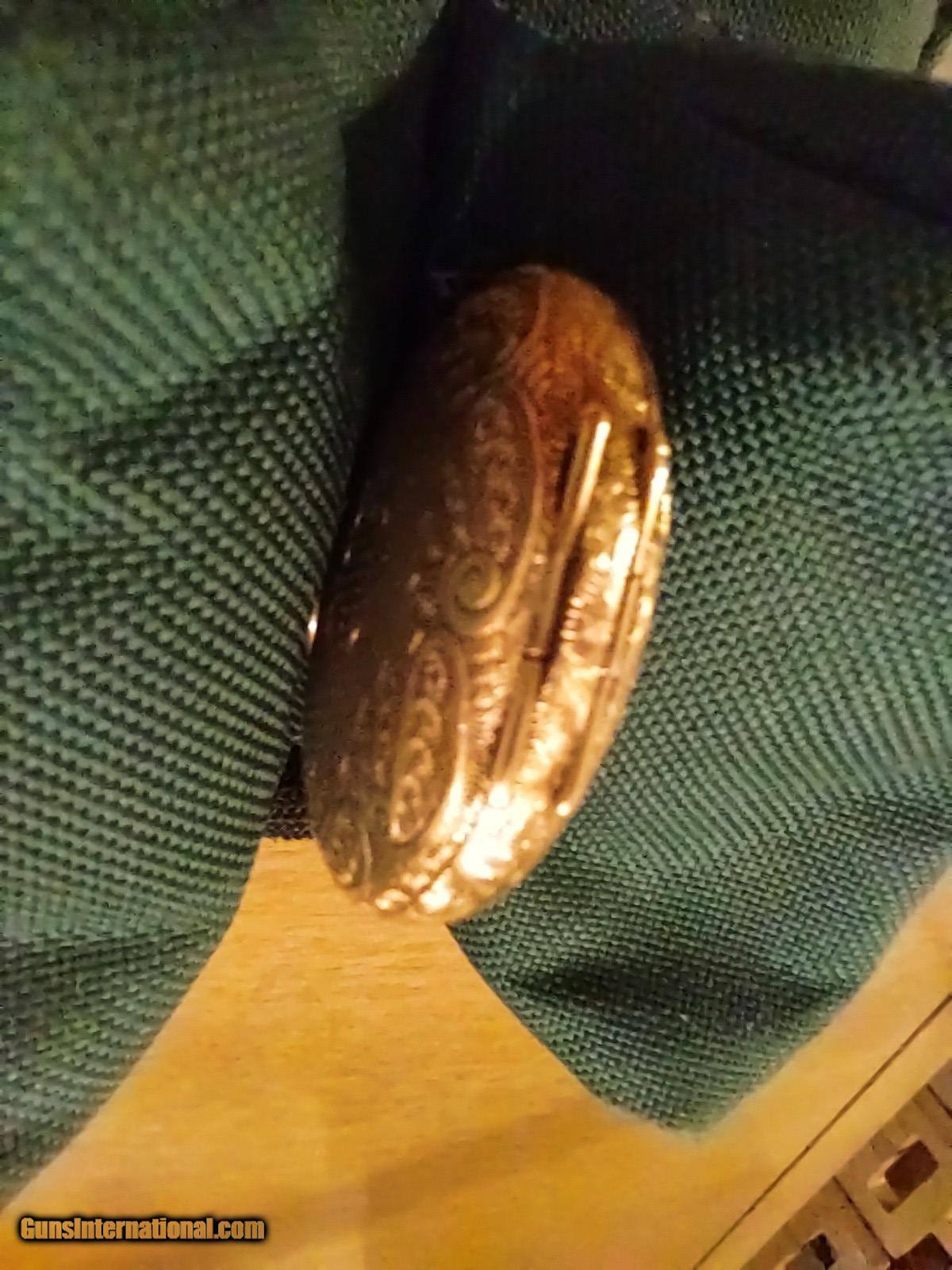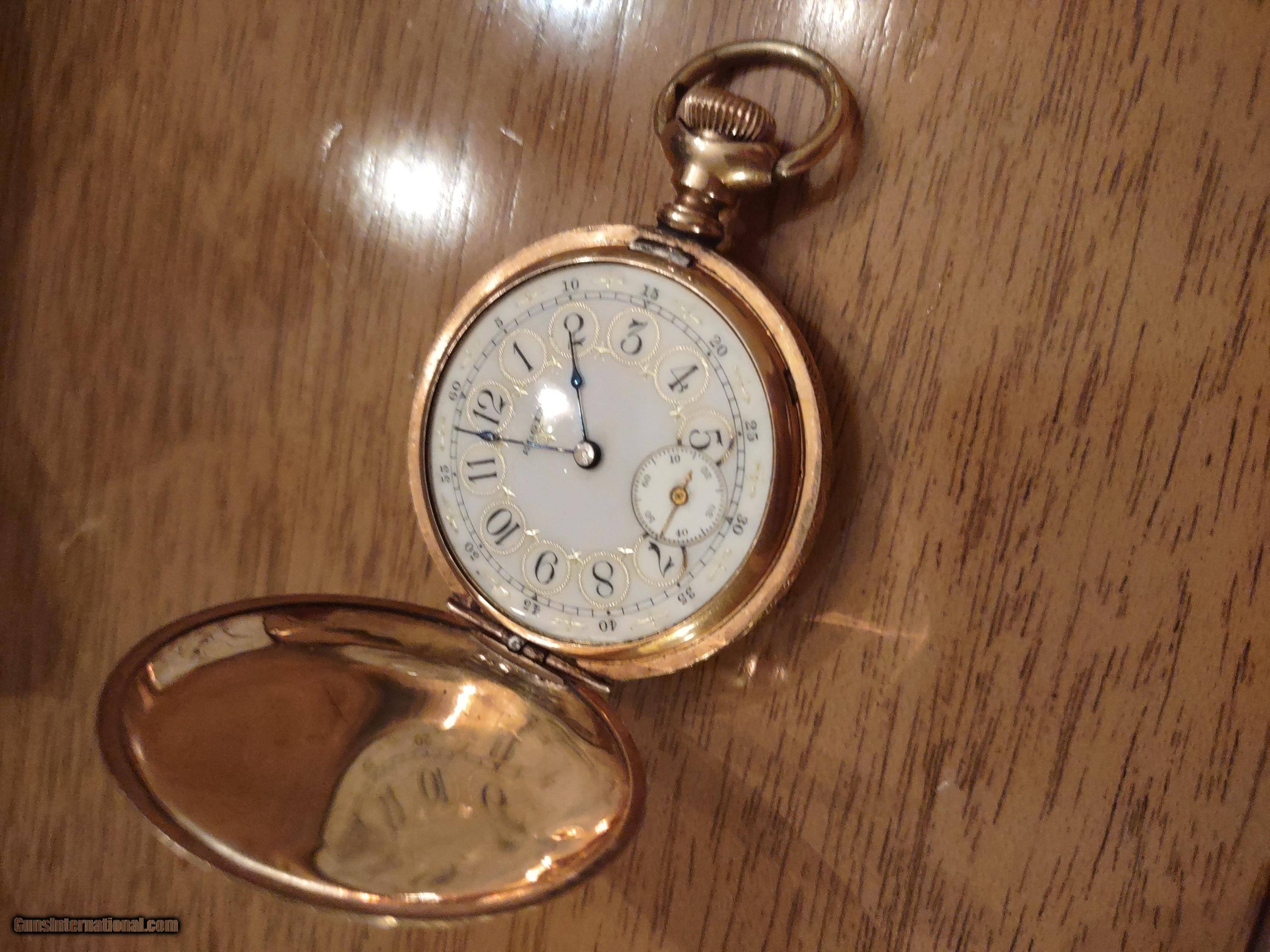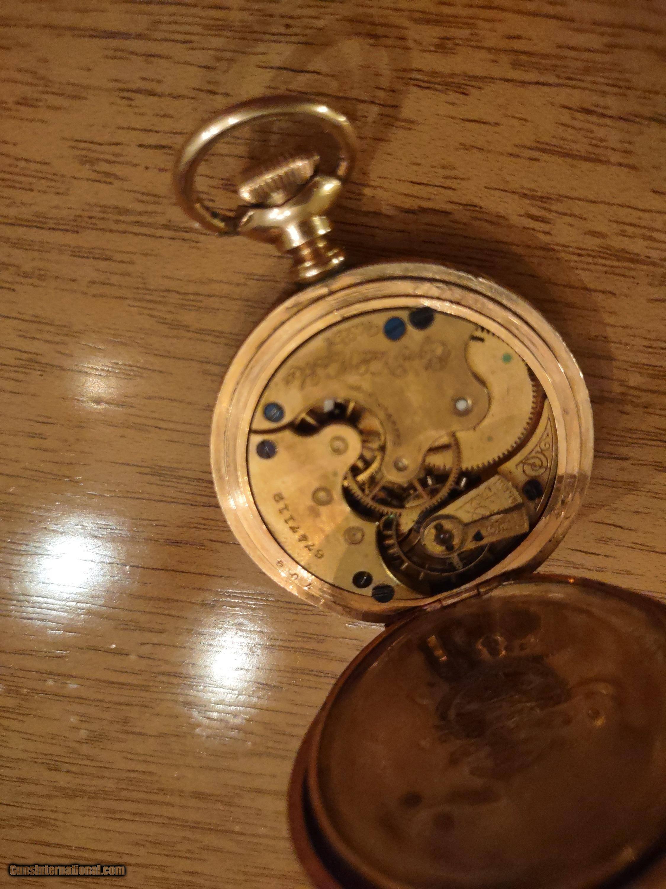 Description: ELGIN NAT'L WATCH CO., Elgin, Illinois, beautiful 14 karat gold over fine hard metal, 40MM diameter, stem wind and set, no key required, made around 1880 and in pristine condition with magnificent engraving. Five years ago this watch ran perfectly but I have recently wound it and can't get it to run. The serial numbers match: case #3503704; watch #6747112. The price is $175 with free shipping to your home or workplace. Call or text me at 318-780-4242 if you are interested. (Some of the stampings are hard to photograph so I wrote all of it down on paper so you know what it says) SOLD |