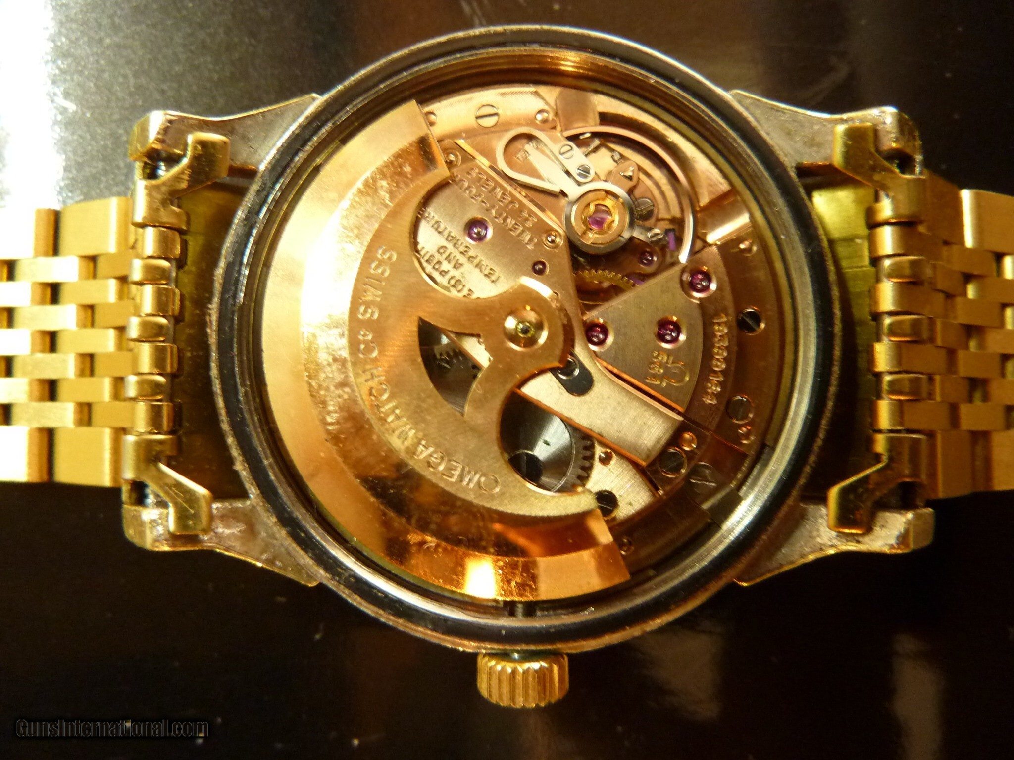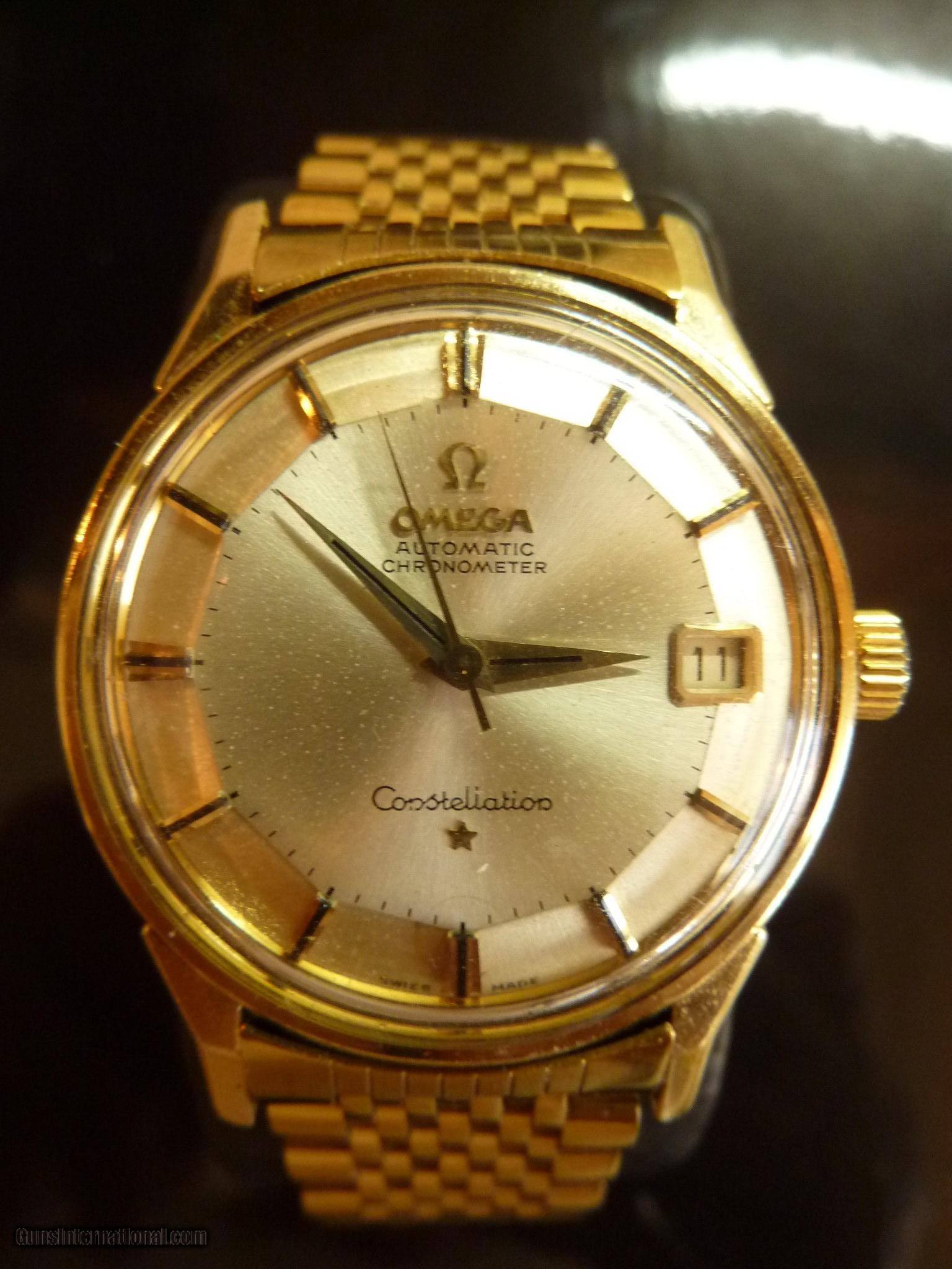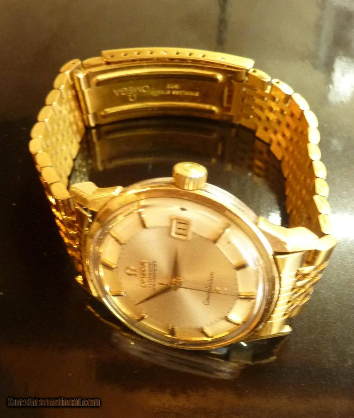 Omega Constellation w/Date 14k Gold Cap & Steel 34mm 1961 Pie Pan Dial Mens Watch with Aftermarket Metal band with extra links and Crocodile New Band included . Watch is a chronometer and is comperable to a Rolex Date model of the same period with 24 jewels and timed in 5 positions . Watch was seviced in 2018 and is in excelent condition . This watch has a 14k Gold Cap over stainless steel giving it the apearance of a gold watch . This was quite common in the late '50's to early 60' by Longines , Rolex , Oamega and others being a cost savings to sell high grade watches at a more affordable price .