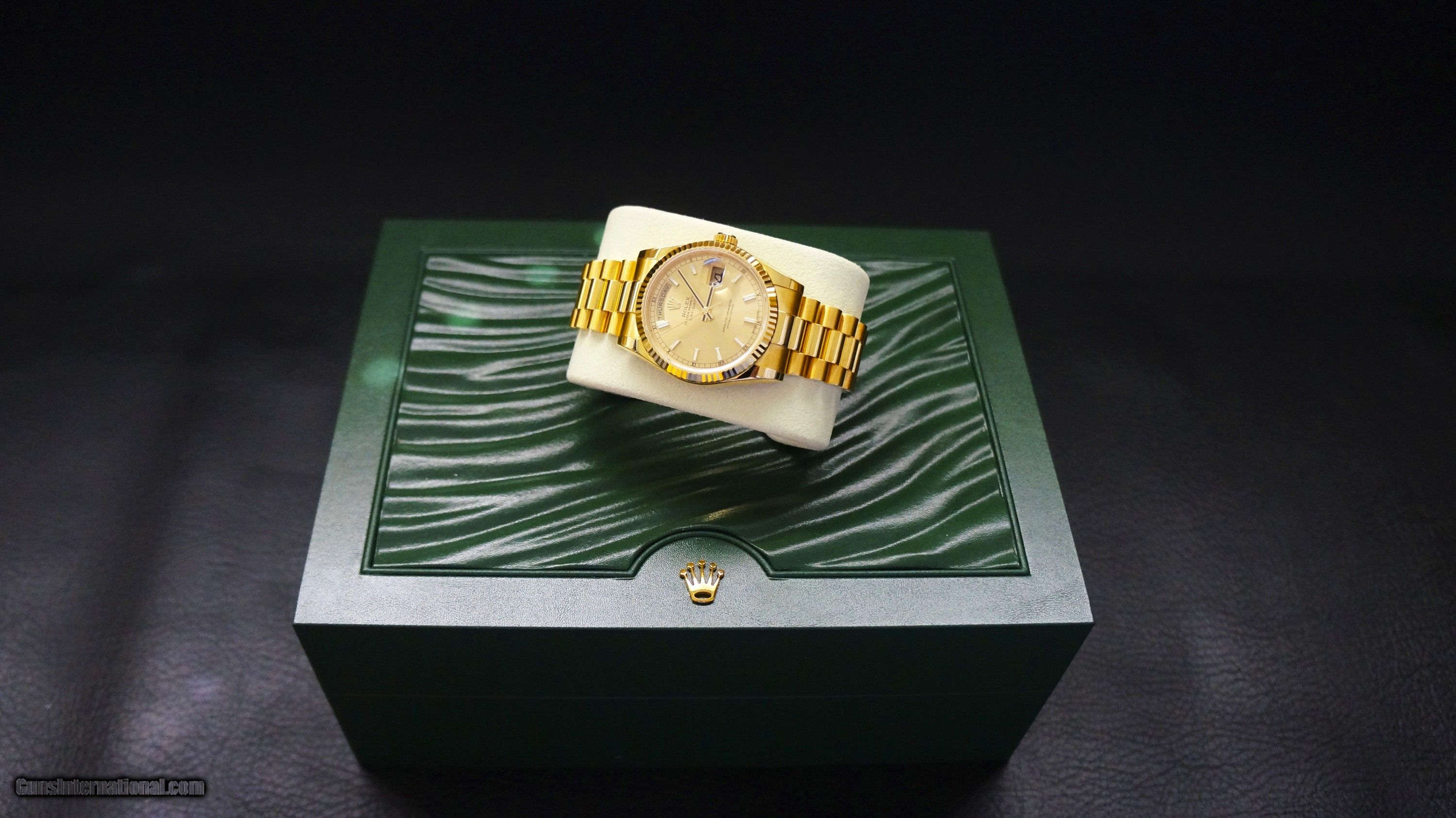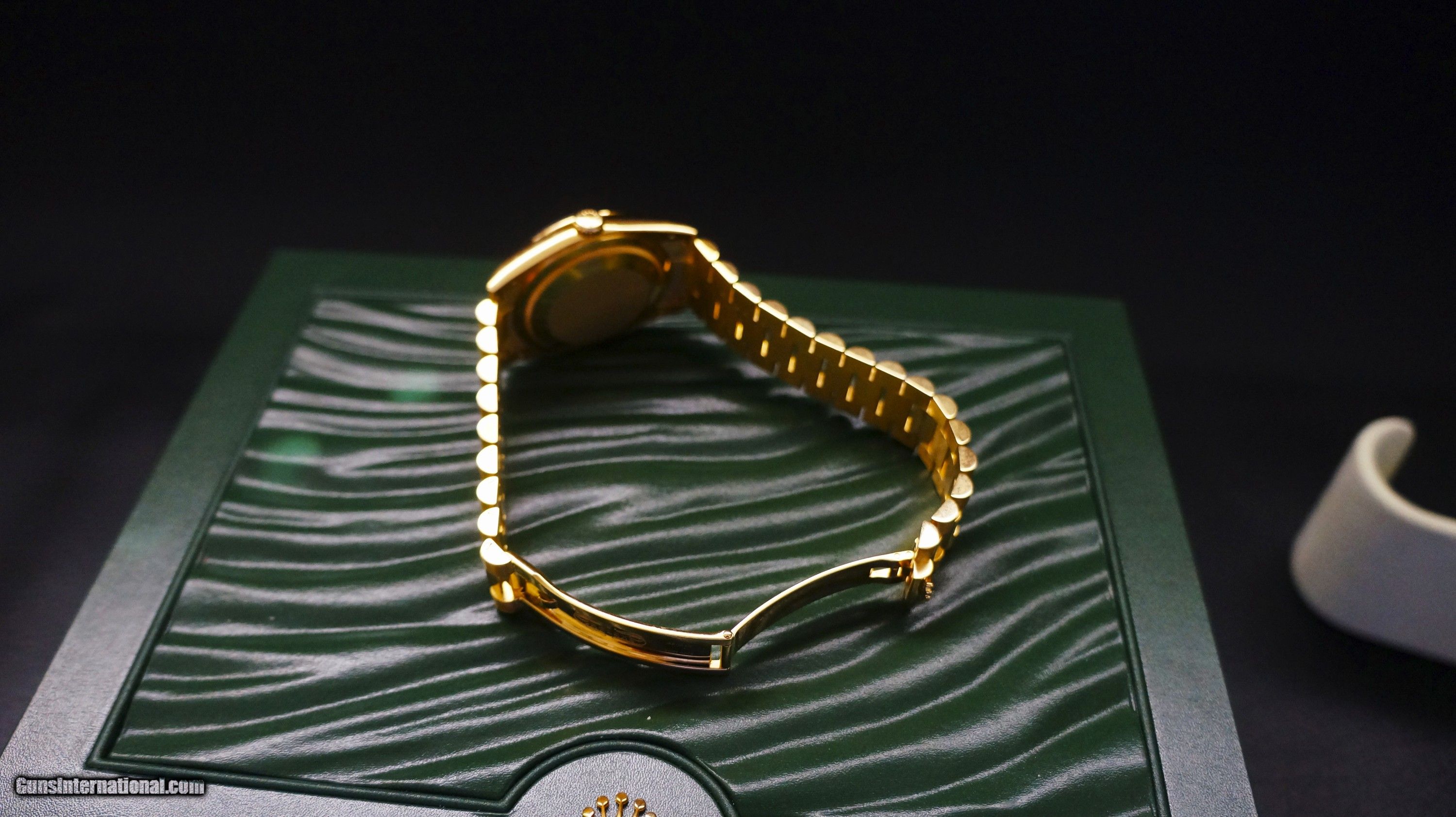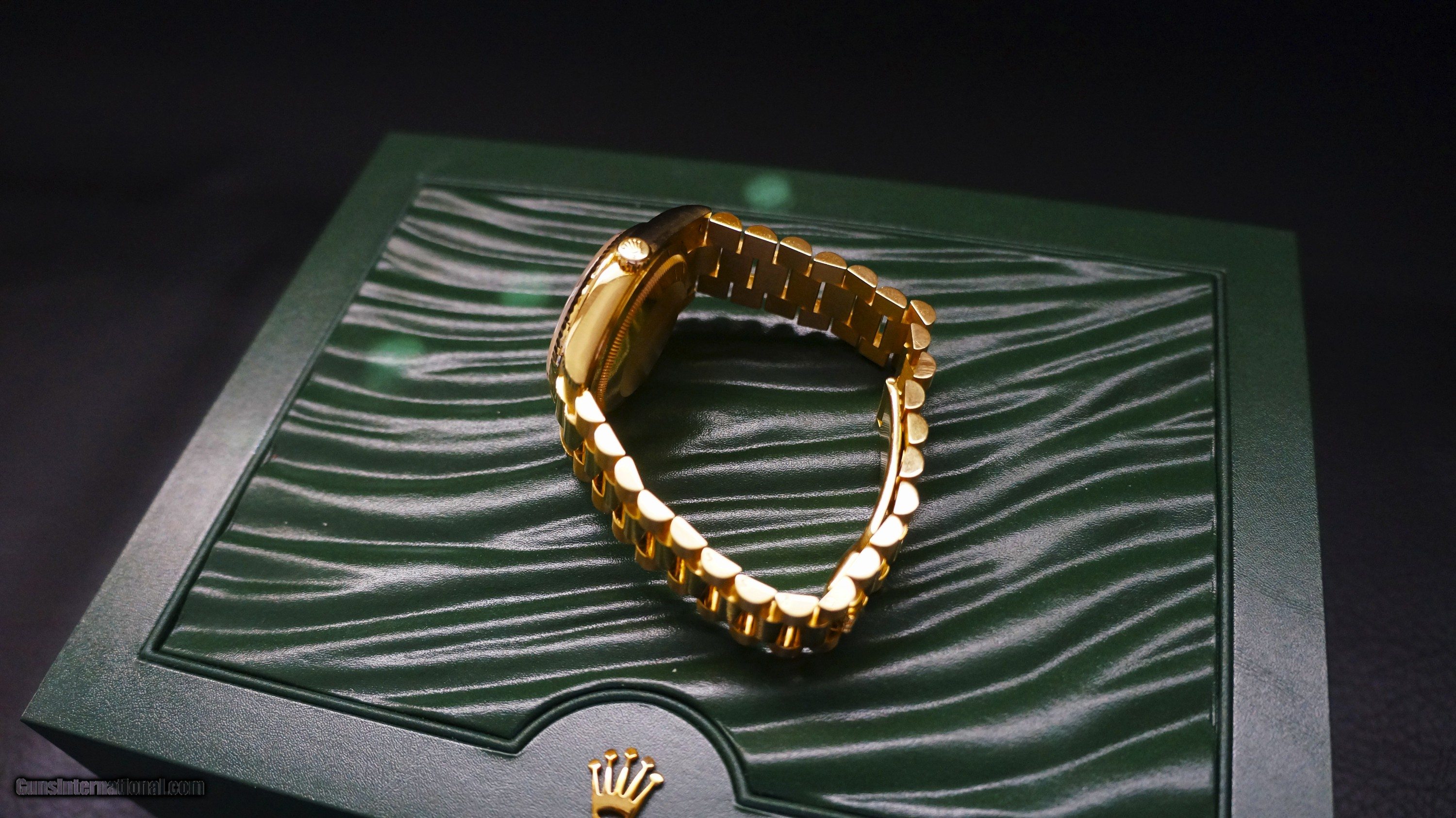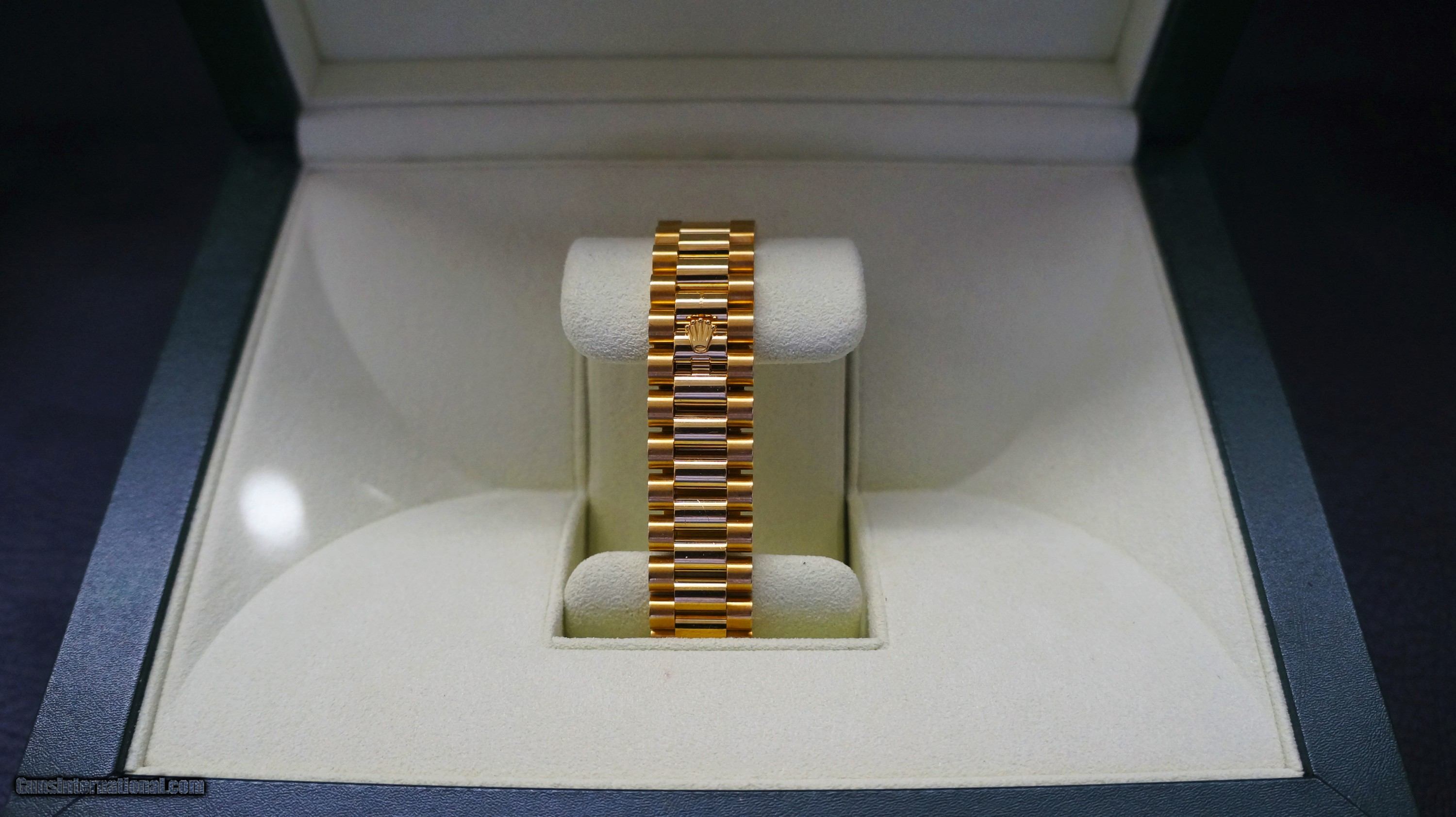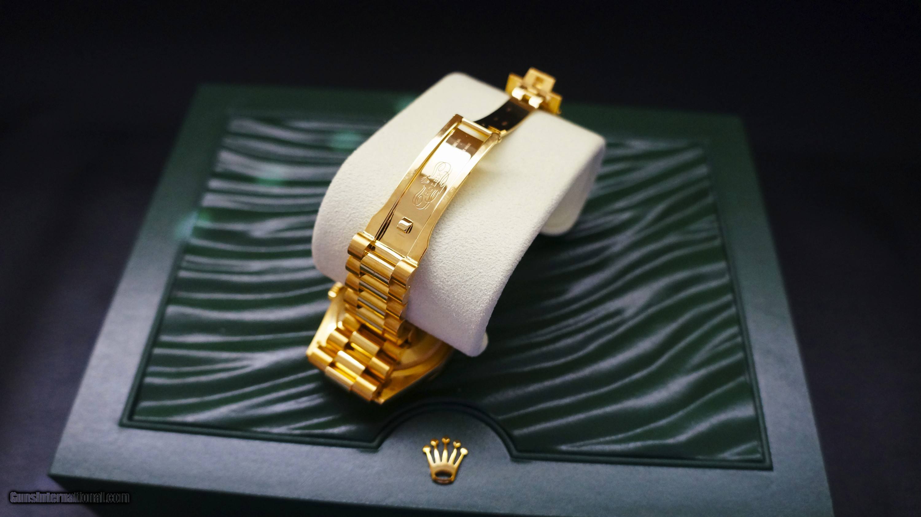 Description: *** SOLD *** Watch Specifics: An all original and unaltered 2019 Rolex Day-Date President, in new, pristine condition. Tight bracelet, has zero droop. Scratch free crystal. Movement operates at factory specs. Box and papers. Condition: A superficial 0.5 mm nick at the side of the case, not noticeable, easily removed. Otherwise, the watch is new, worn half a dozen times. Brand: Rolex Case Material: 18k Yellow Gold Bracelet: Rolex 18k Yellow Gold Hidden Folding Clasp Bezel: Fluted Gender: Men's watch/Unisex Customized: No Model: Rolex Day-Date Double Quickset Style: Luxury With Original Box/Packaging: Yes With Papers: Yes Case Size: 36 mm Water resistance: 10 ATM Crystal: Sapphire Crystal Dial: Champagne Dial numerals: Stick Luminescent Reference Number: 118238 SOLD |